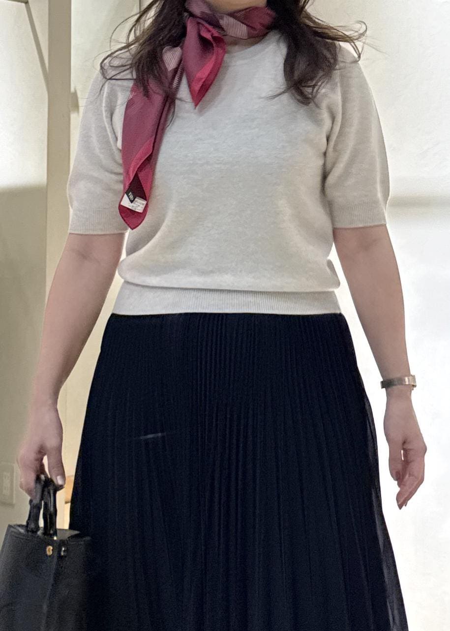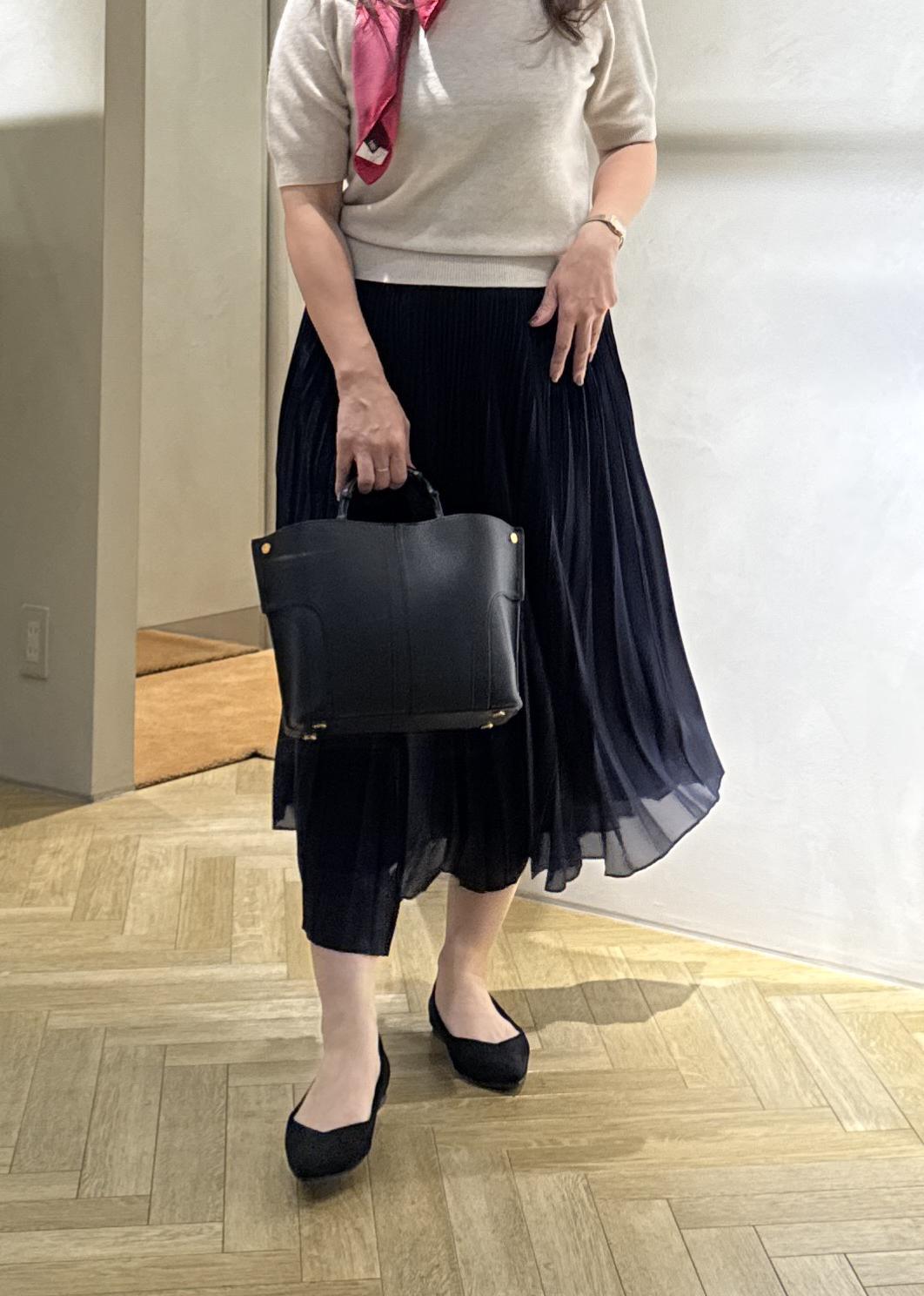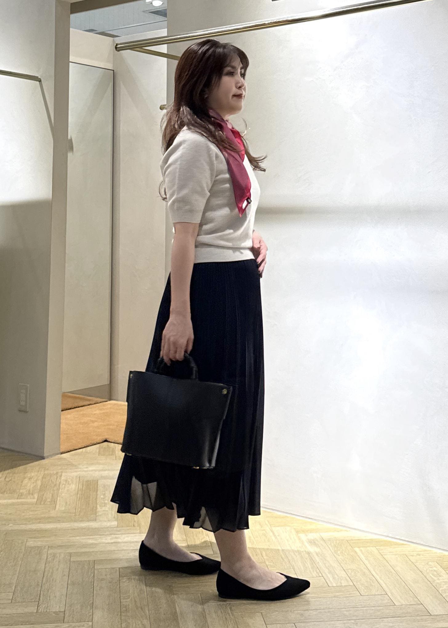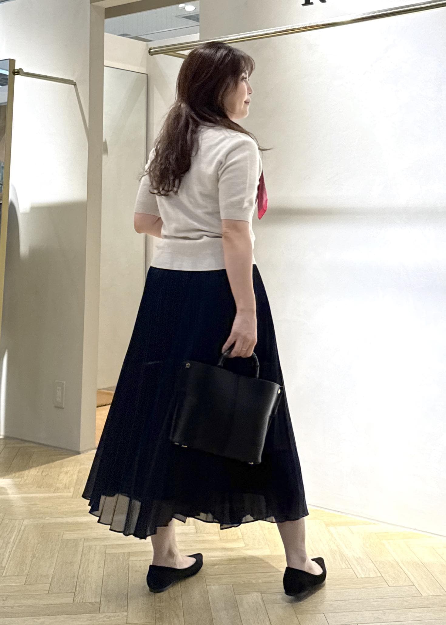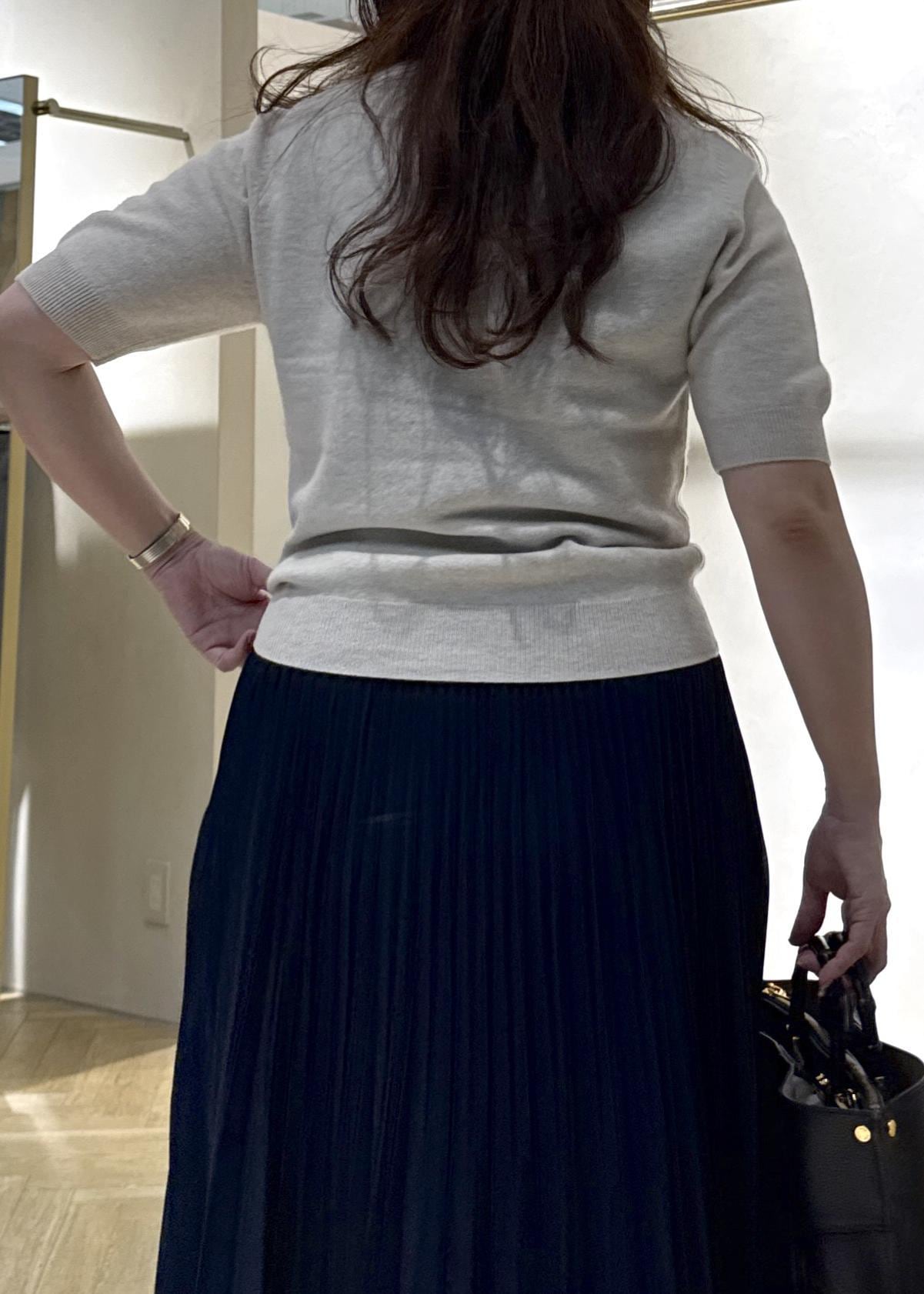 細かなプリーツで広がりをおさえたラインでいつもは気になる腰周りやヒップは気にならず。ただウエストから腰の盛り上がりは目立つかなと思ったのでトップスのイン具合、着丈でカバーしたいかなと私は思いました。