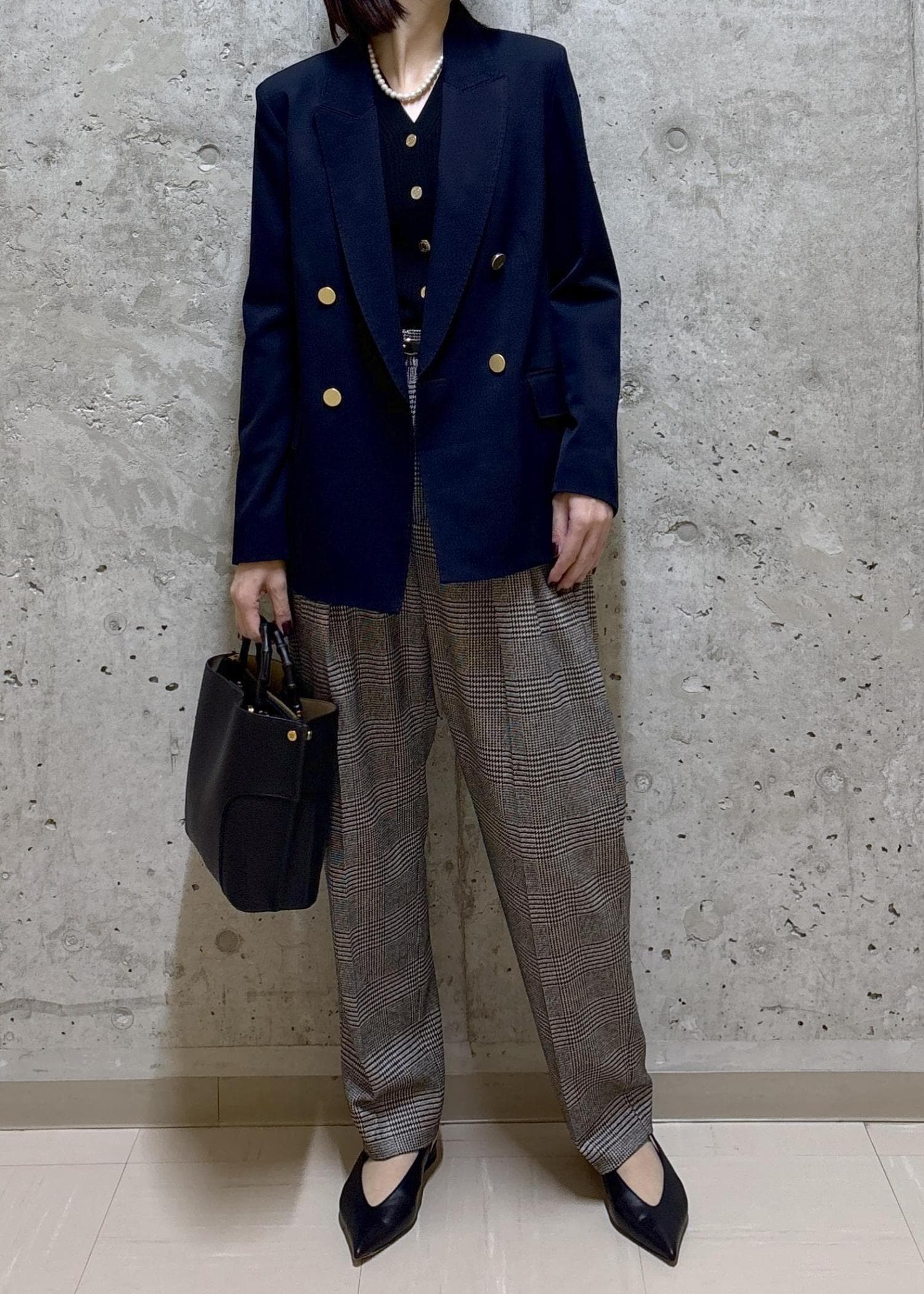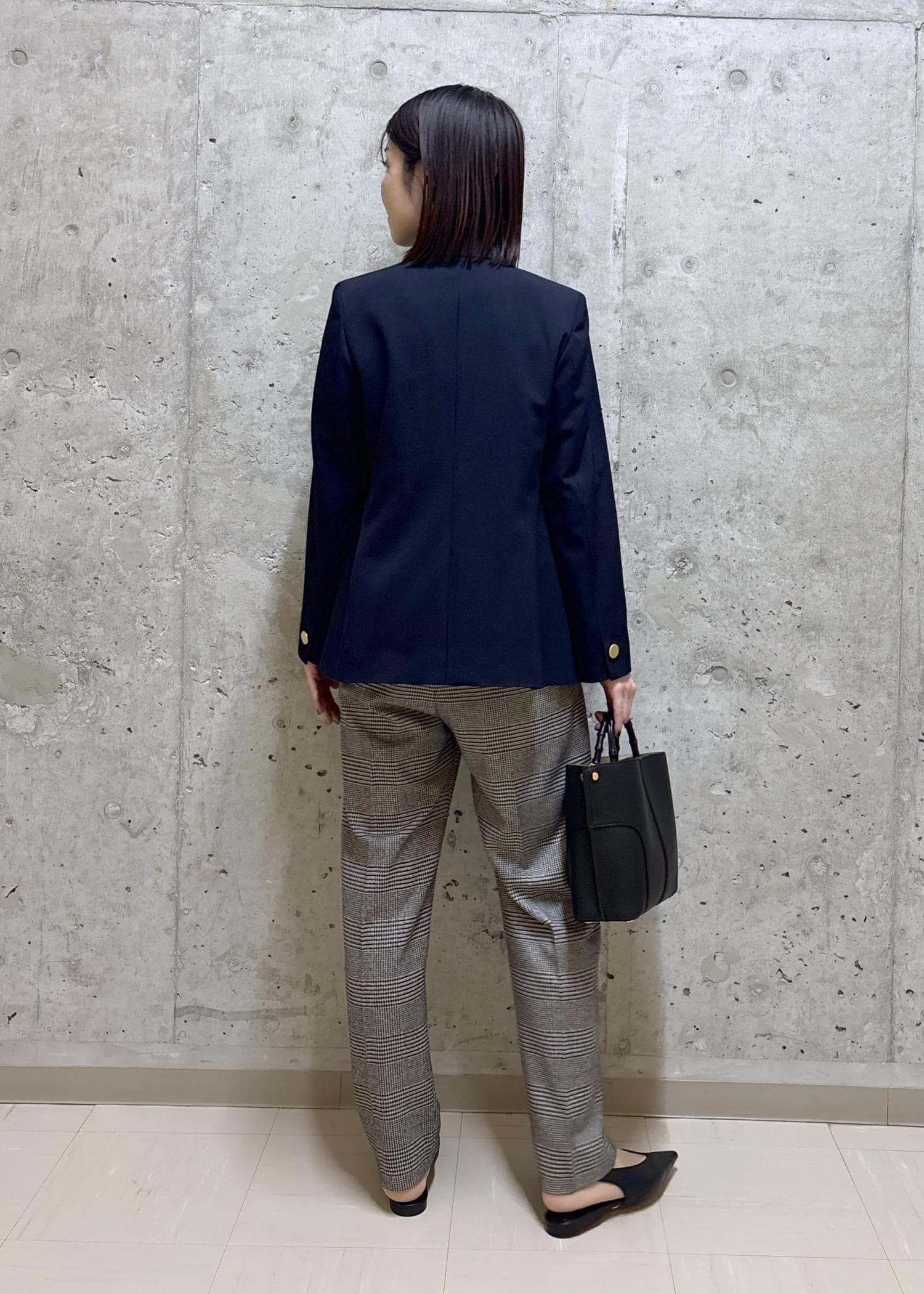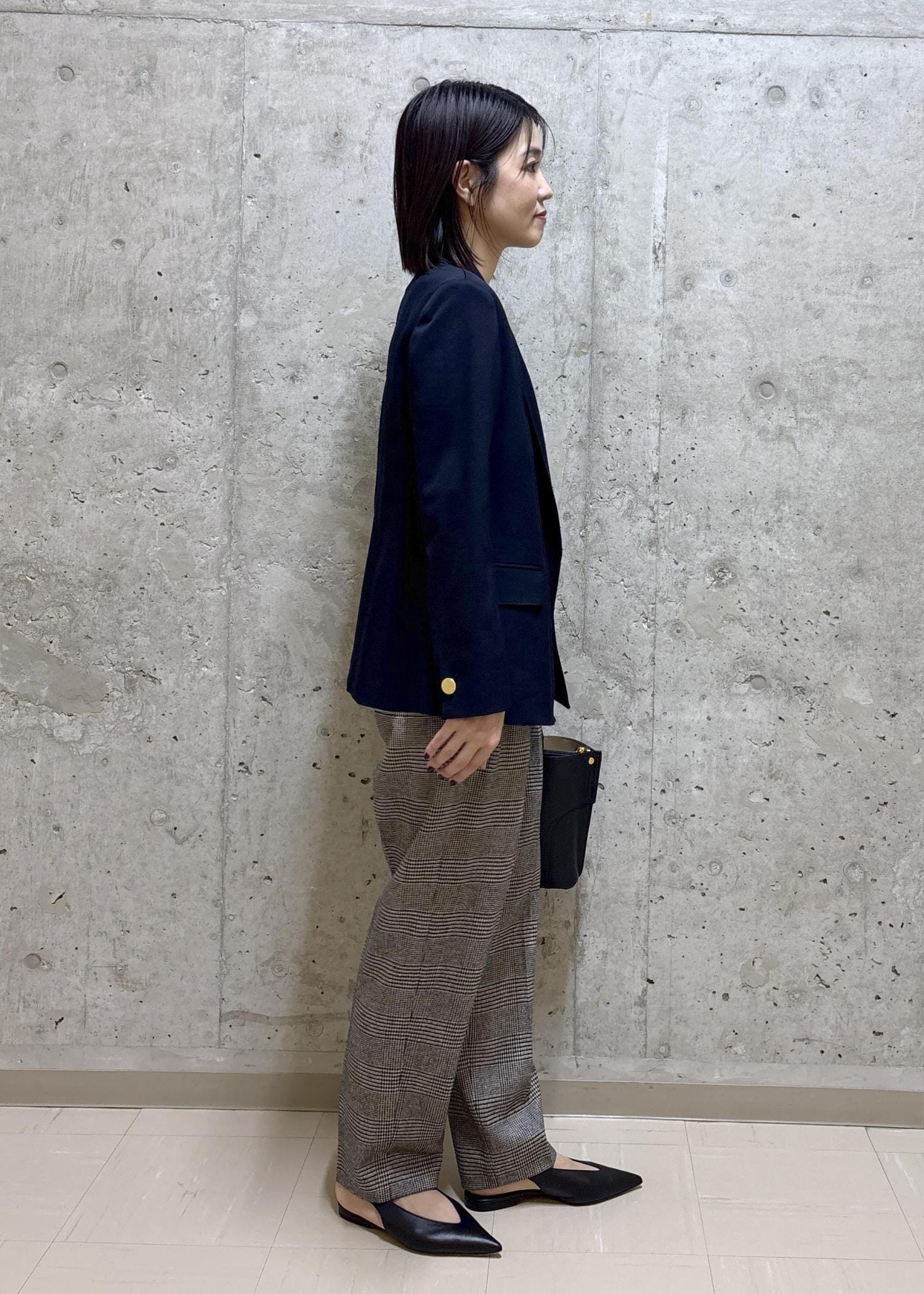 着丈はヒップの半分くらいの長さで、パンツでもスカートでもバランス良く着れる丈感です。