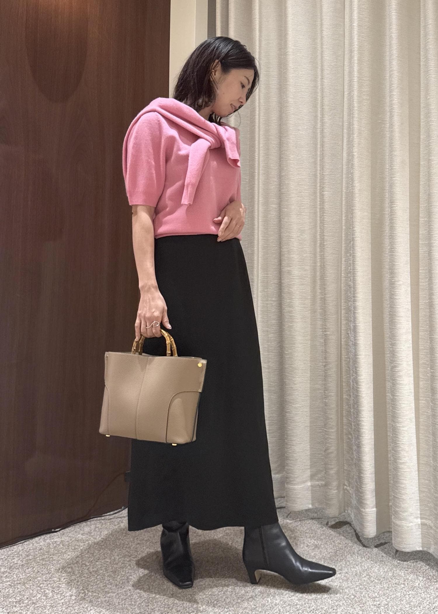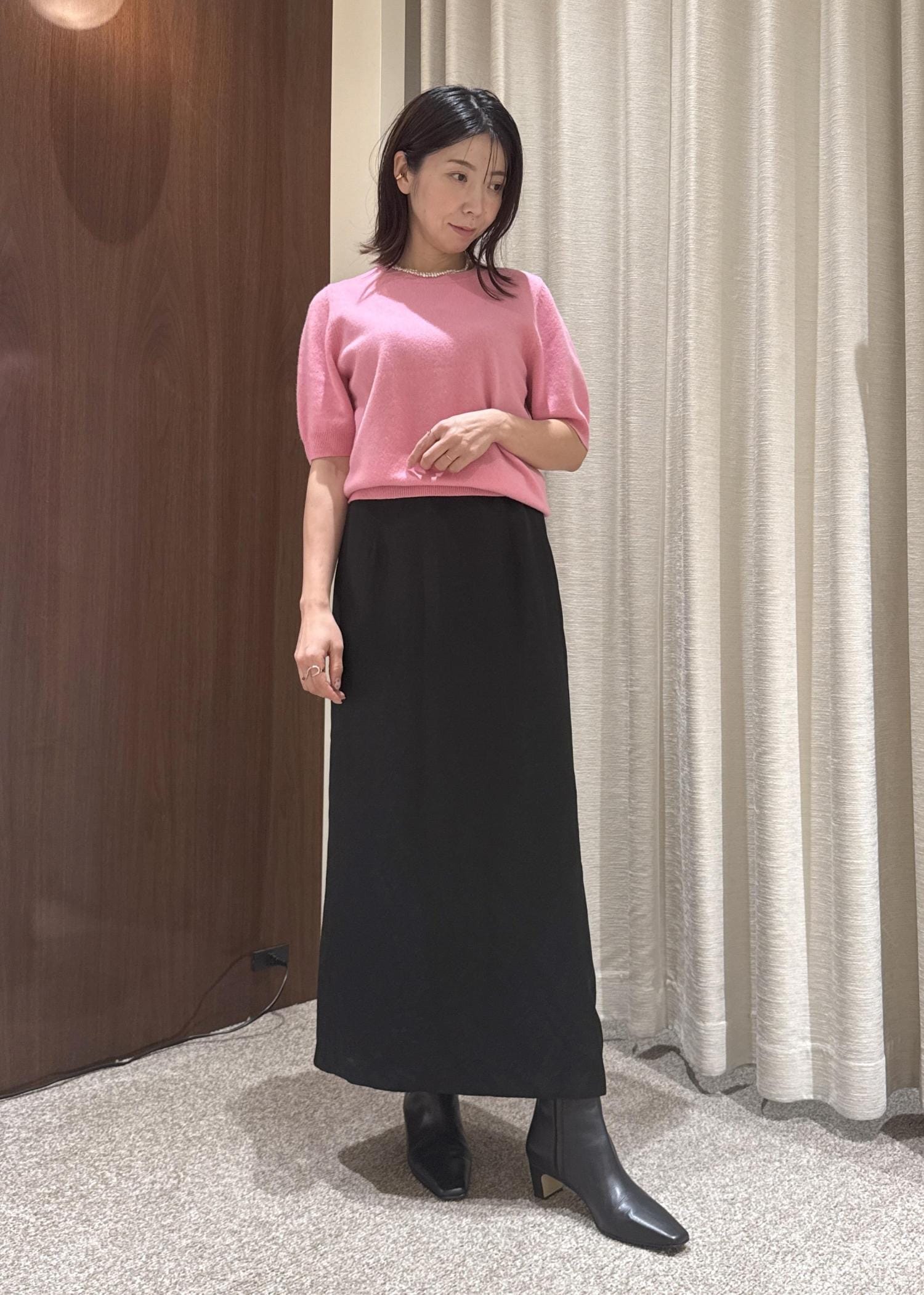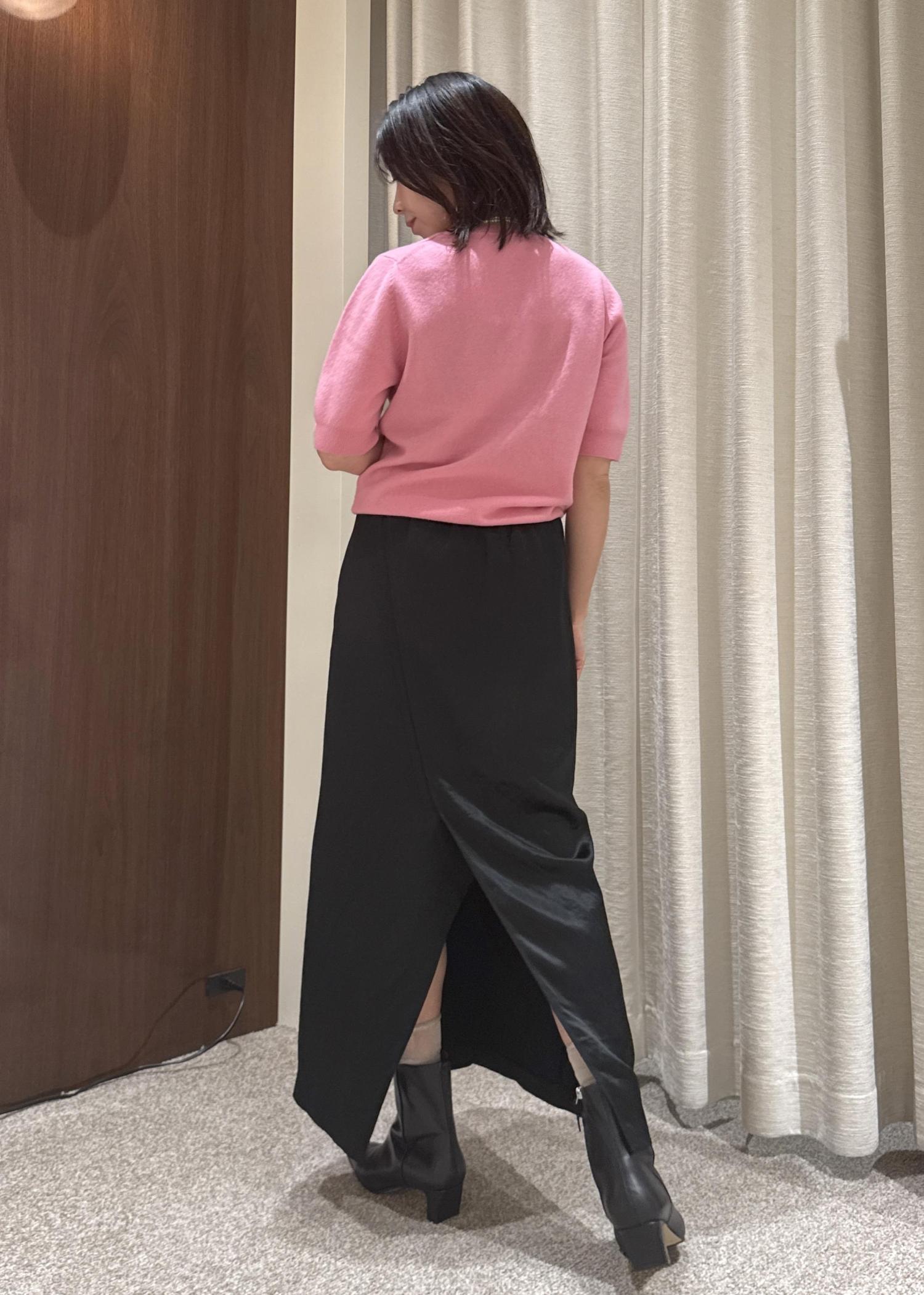 着丈は足首くらいで後ろにスリットがはいっているので足捌きはしやすく、ツルンとした素材感が涼しいです。
