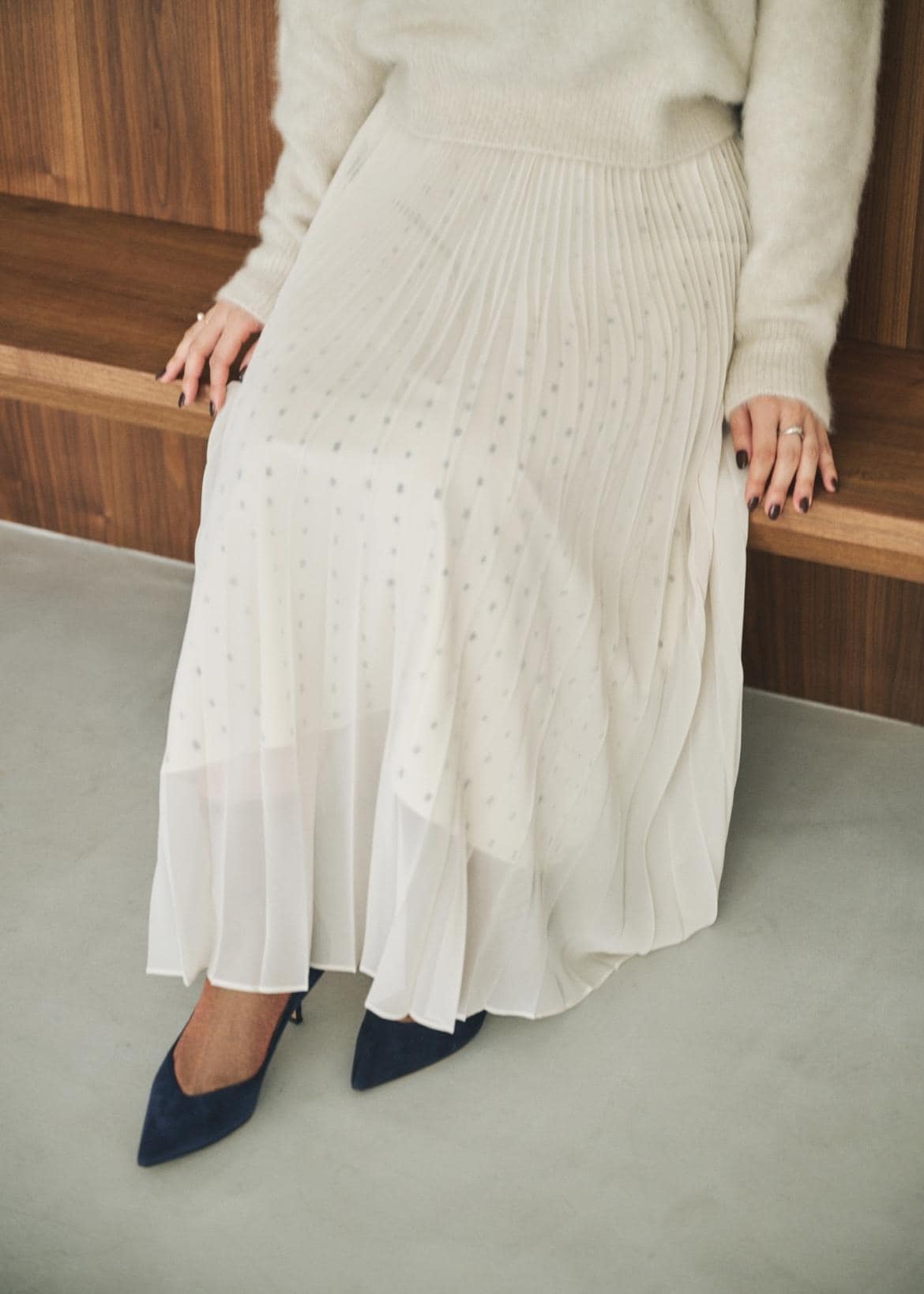 ROPÉスクエアドットプリントププリーツスカートキナリ / 38¥25,410レビュー着丈は足首にかからないくらいの丈感。内側のインナーの方が短く、プリーツの方は透け感があるので重たく見えず軽やかな印象。