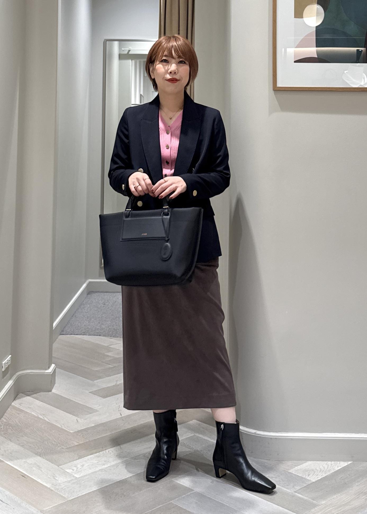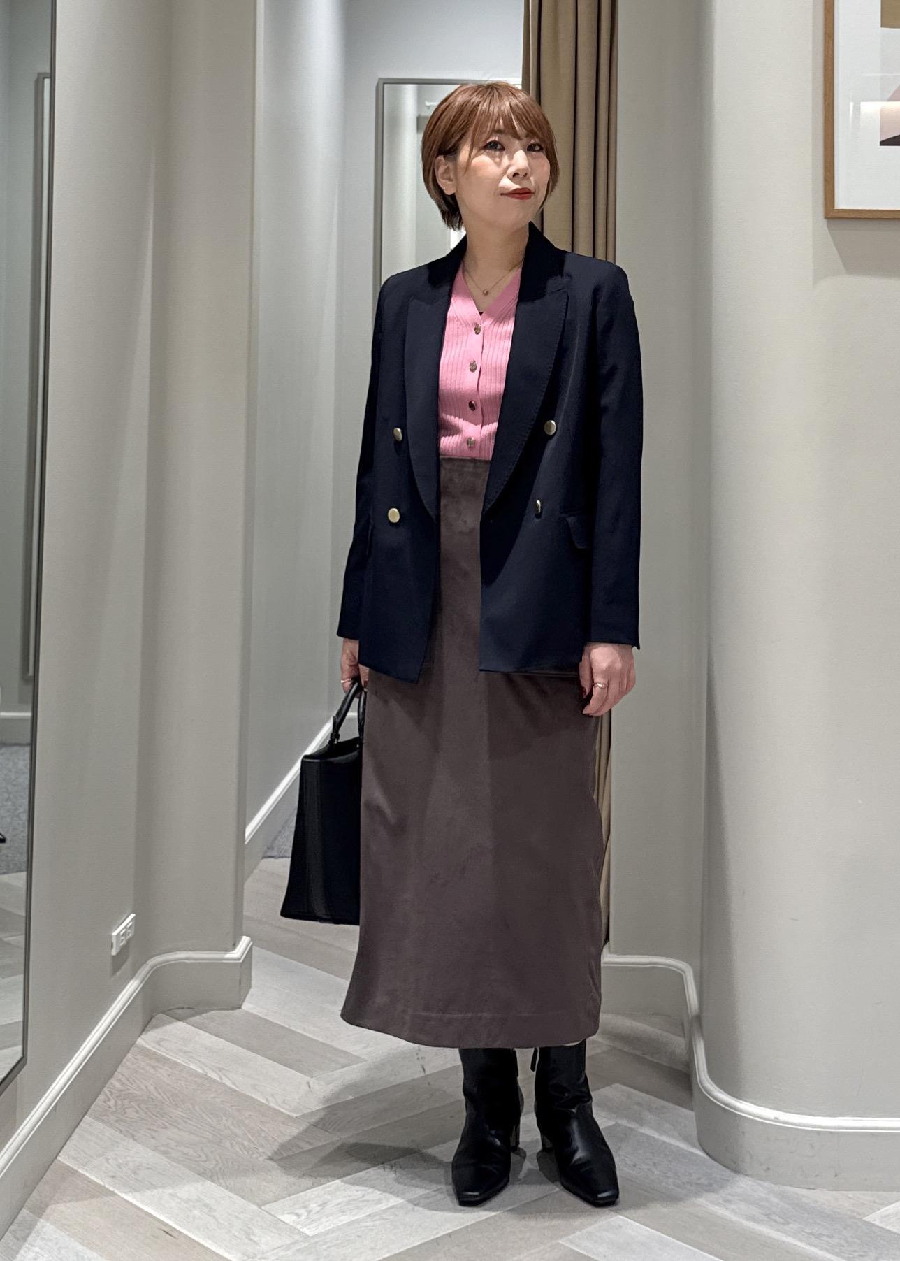 甘くなりすぎないようにかっちりとしたジャケットと小物は黒でまとめました。