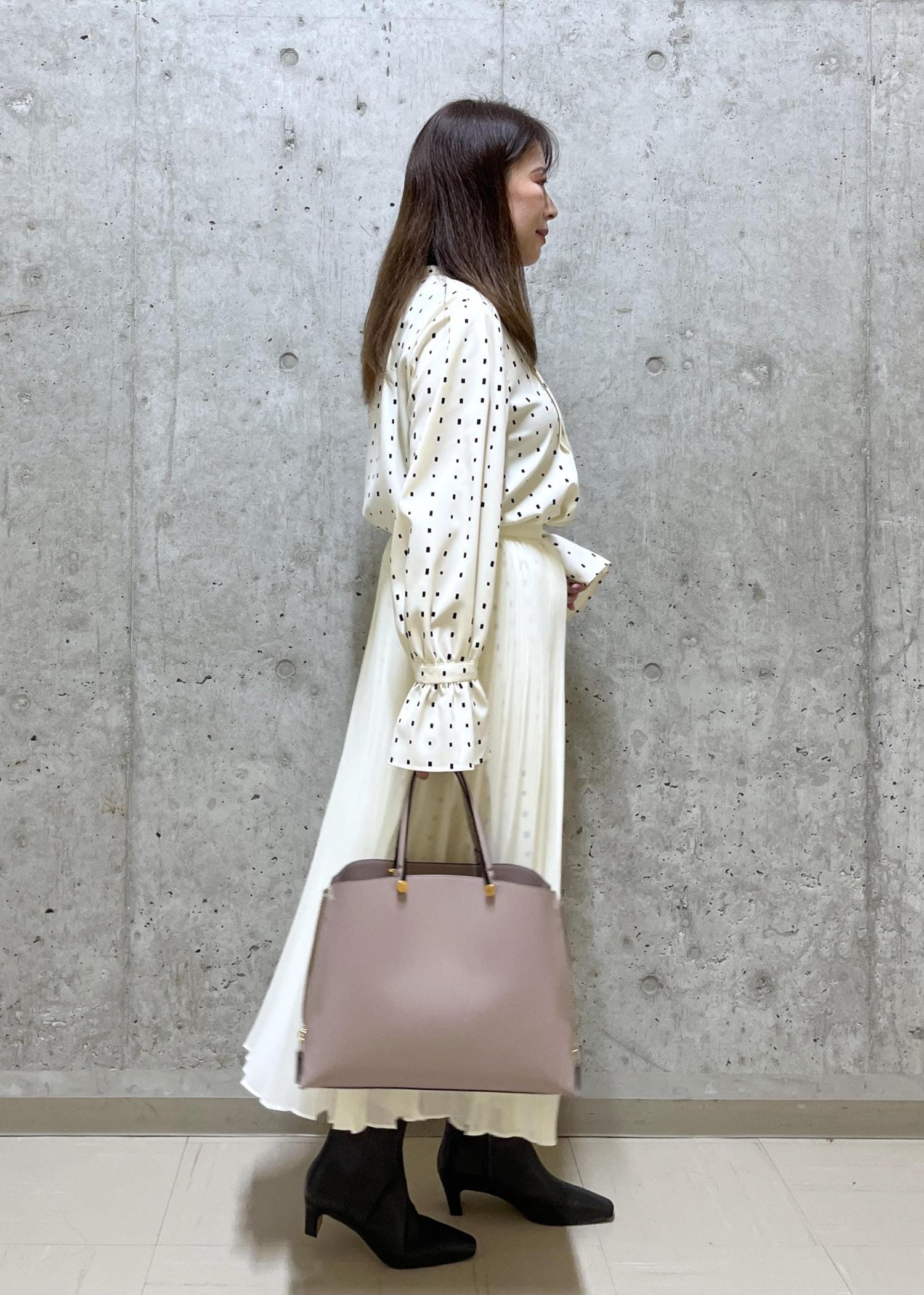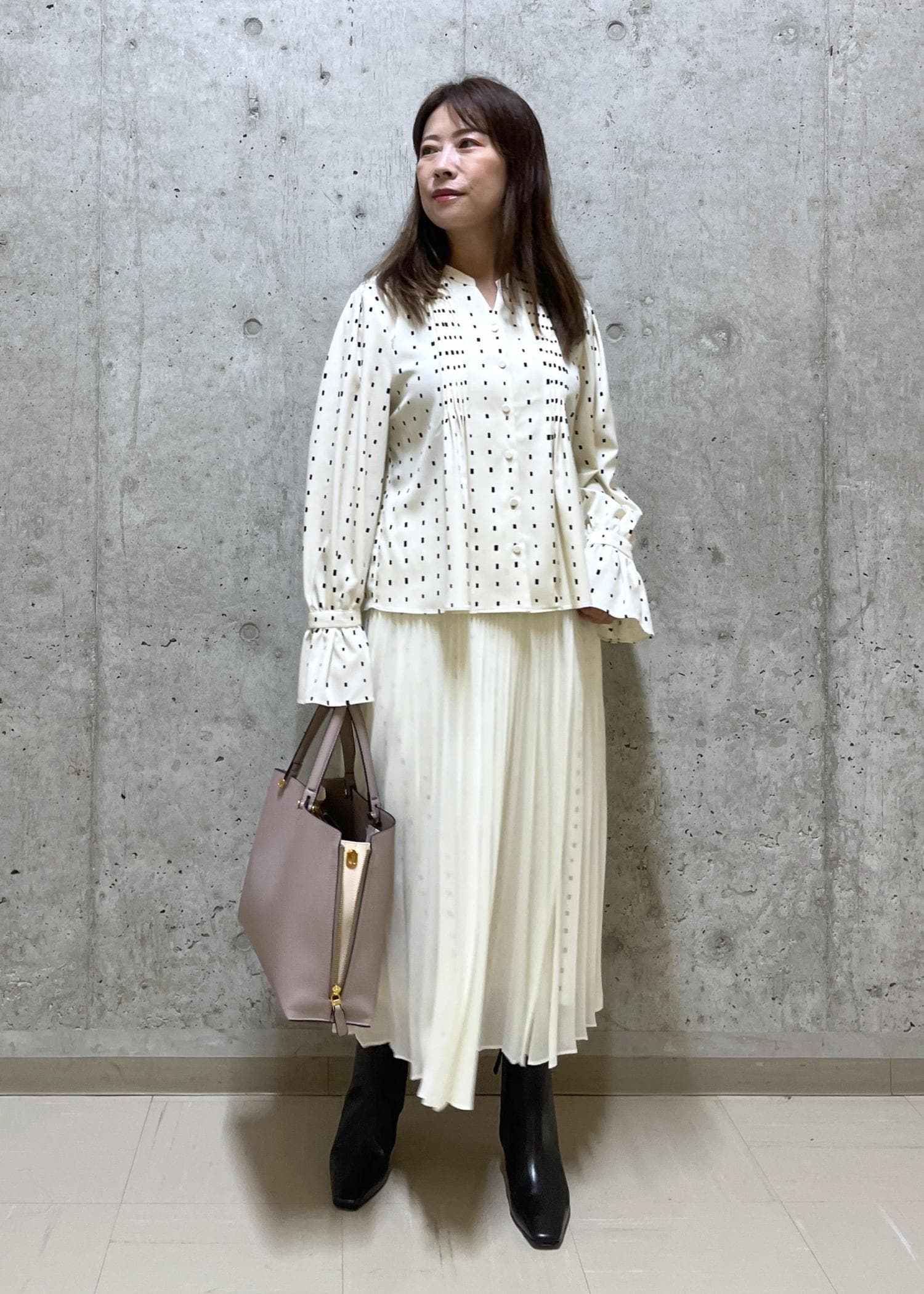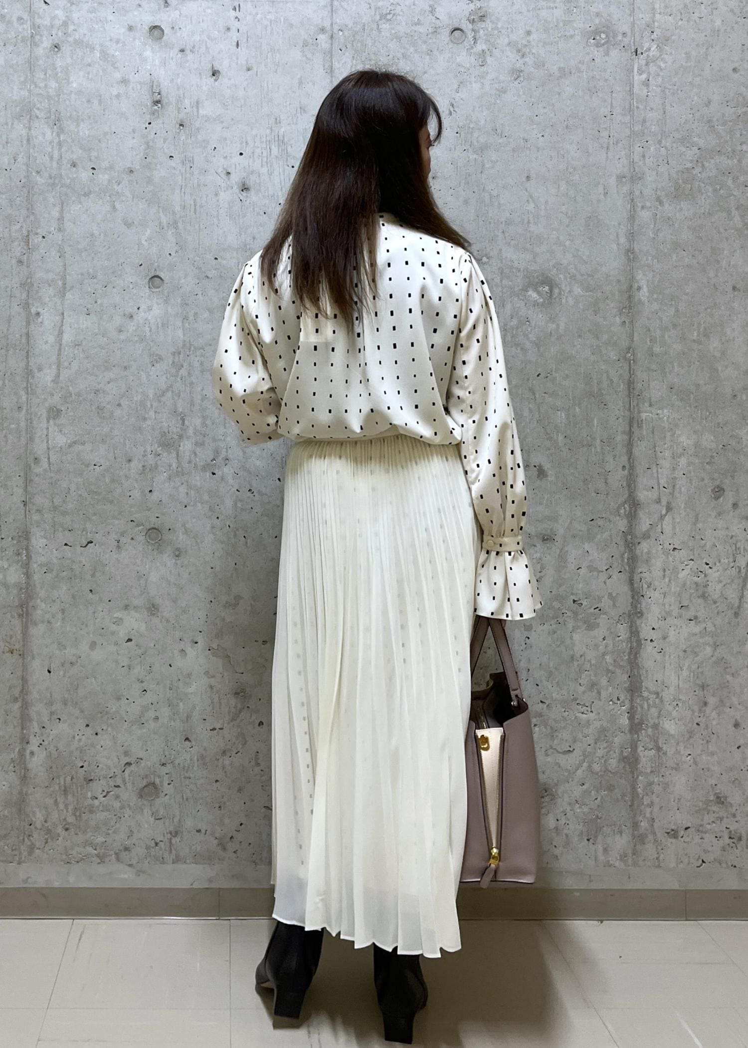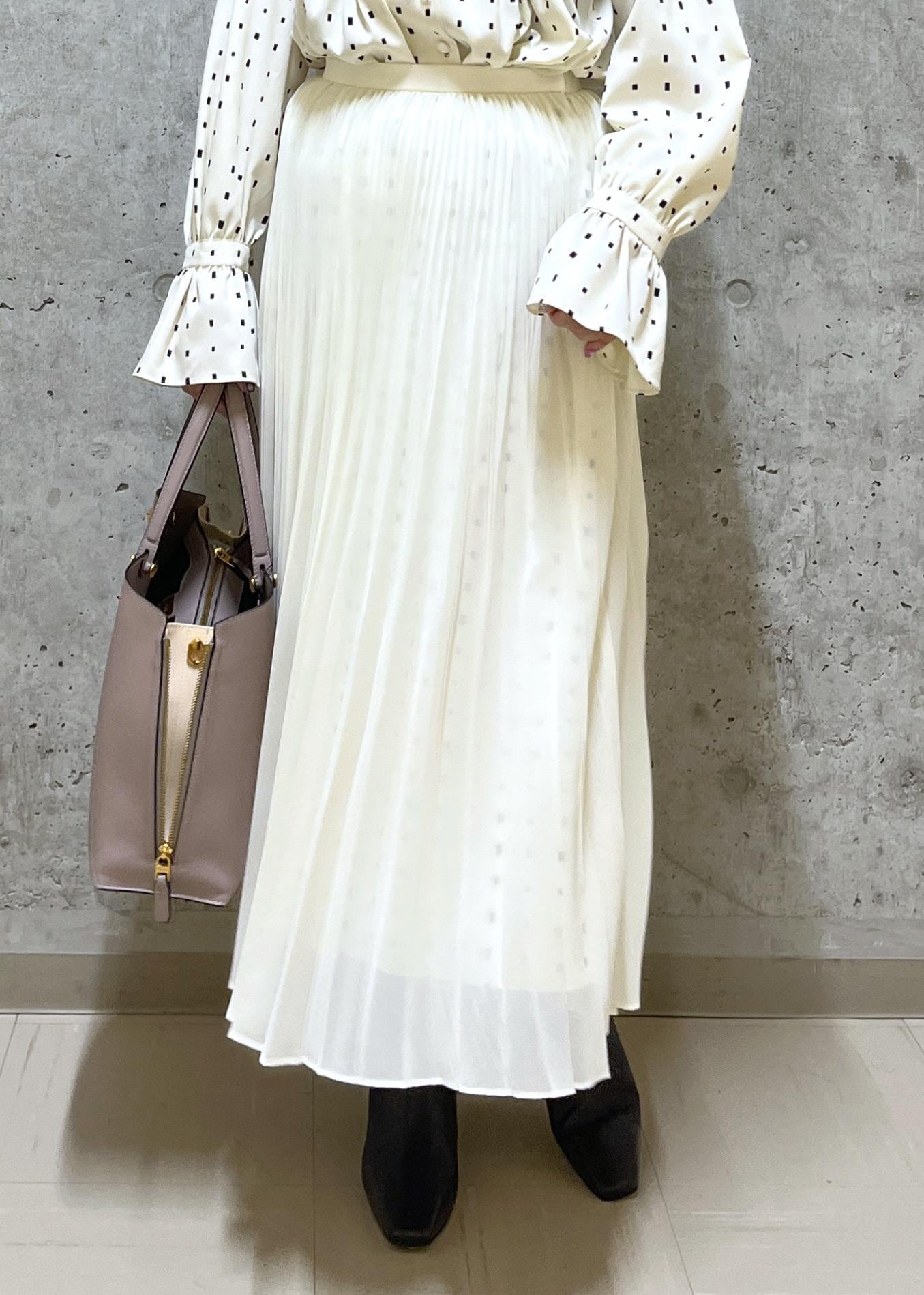 ROPÉスクエアドットプリントププリーツスカートキナリ / 36¥25,410レビュー足首が見える程の長めの丈ですが、裾に透け感があるので小柄な方でも重たく見えず着用できます。
