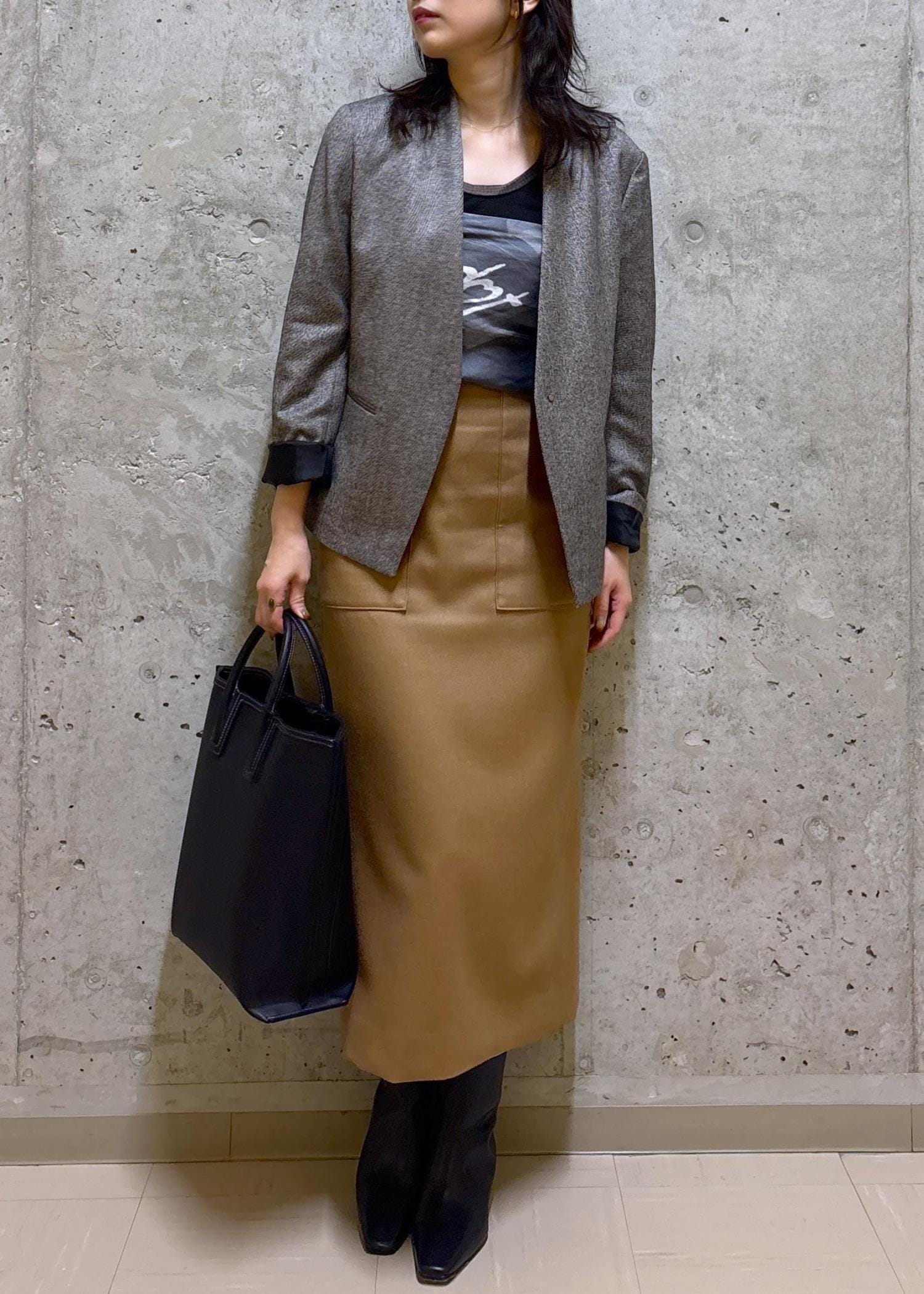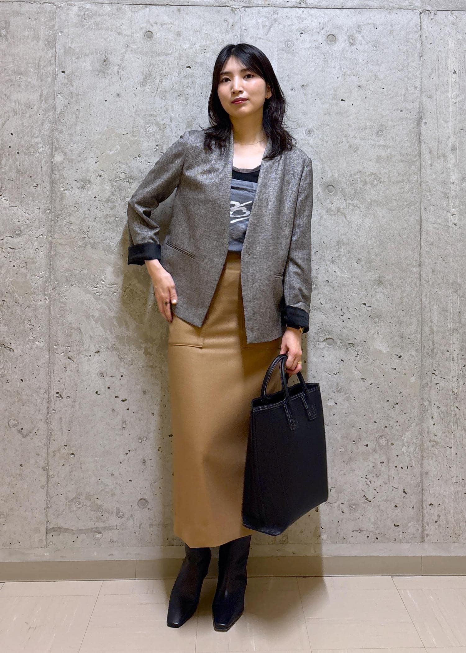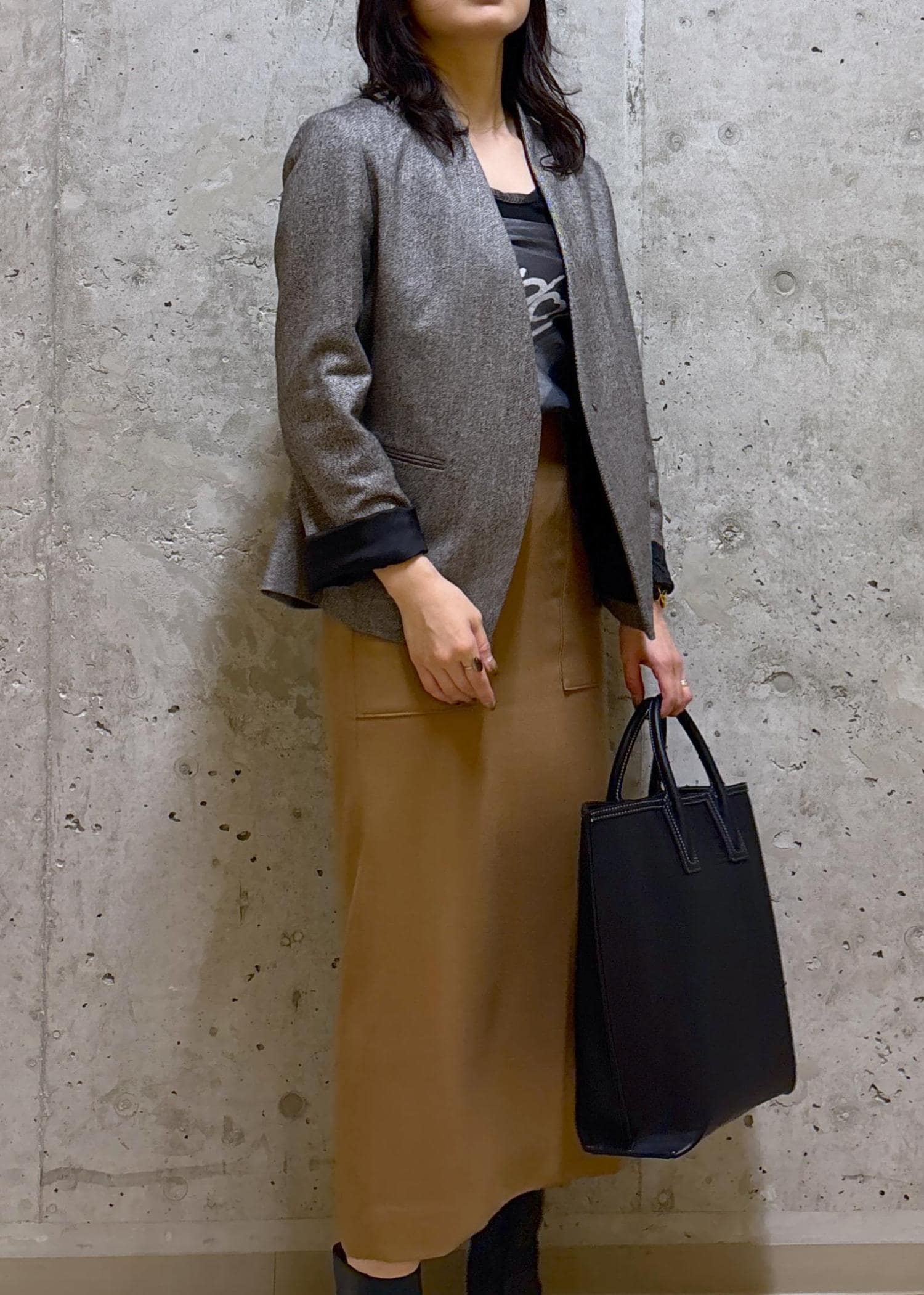 グレー×キャメルの配色で、抜け感のある大人トラッドに。