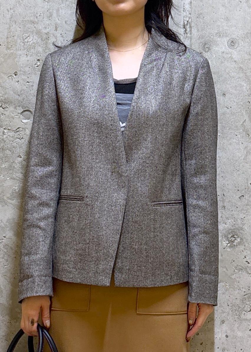 衿腰を少し高く設定したノーカラーデザインで、気軽に羽織りやすいのにきちんと感の出るジャケットです。