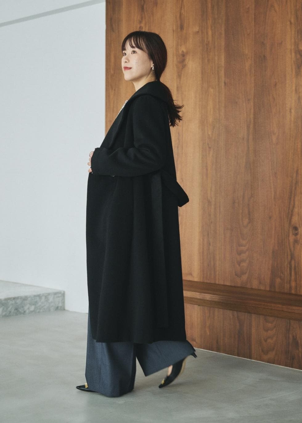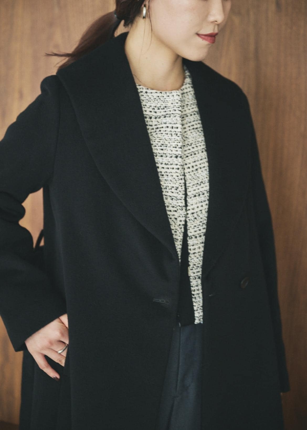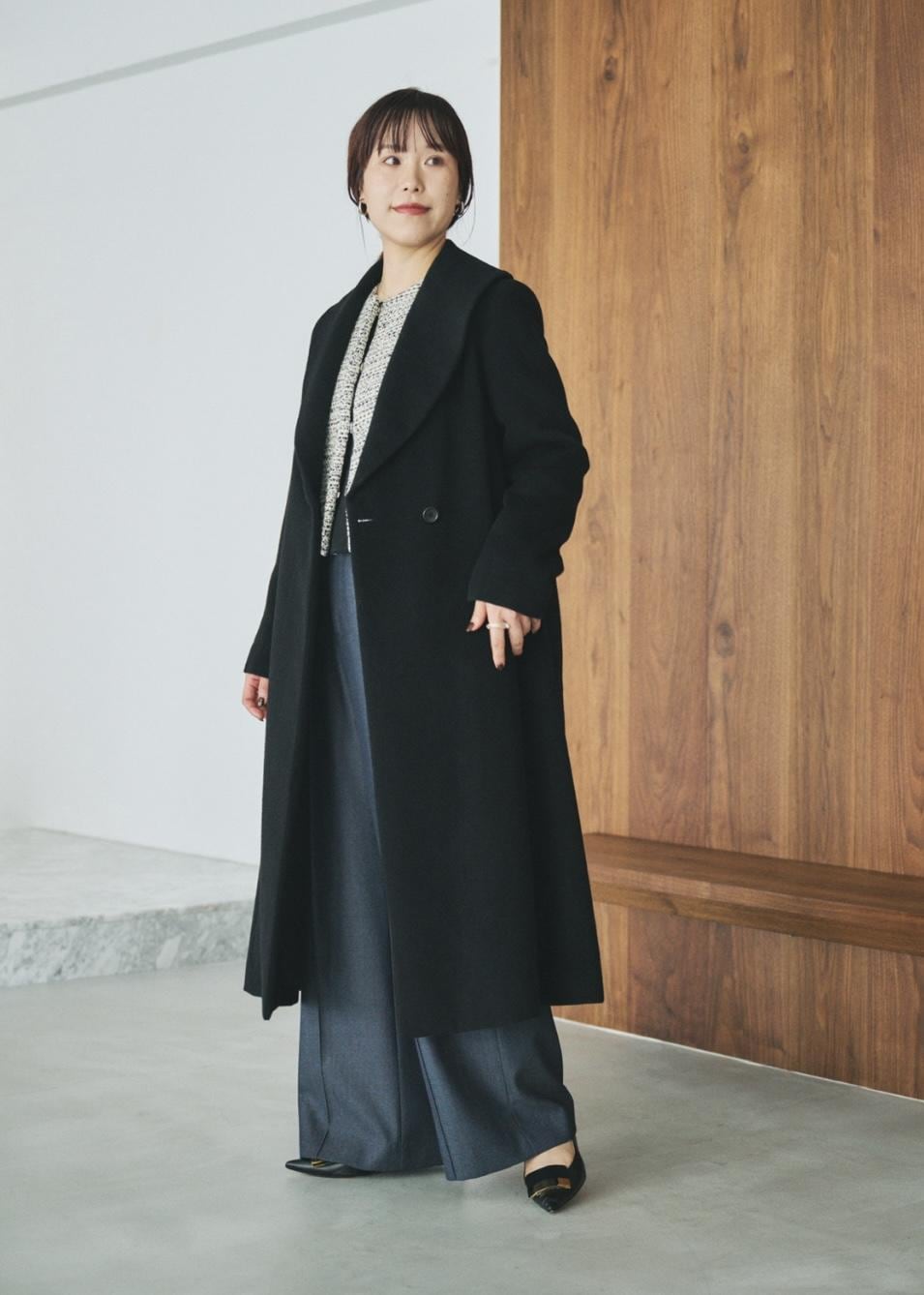 まずは目を惹くショールカラーコート。