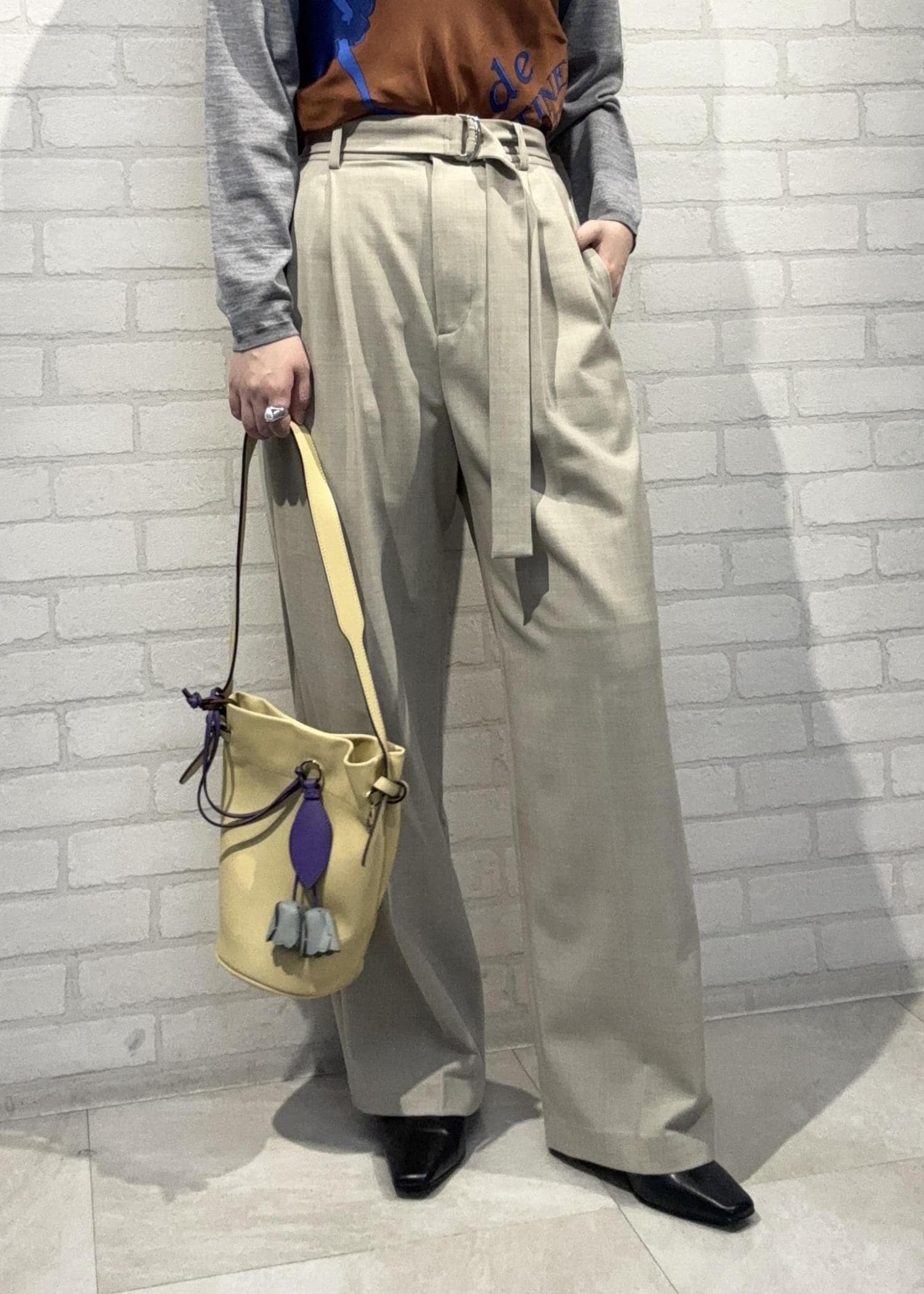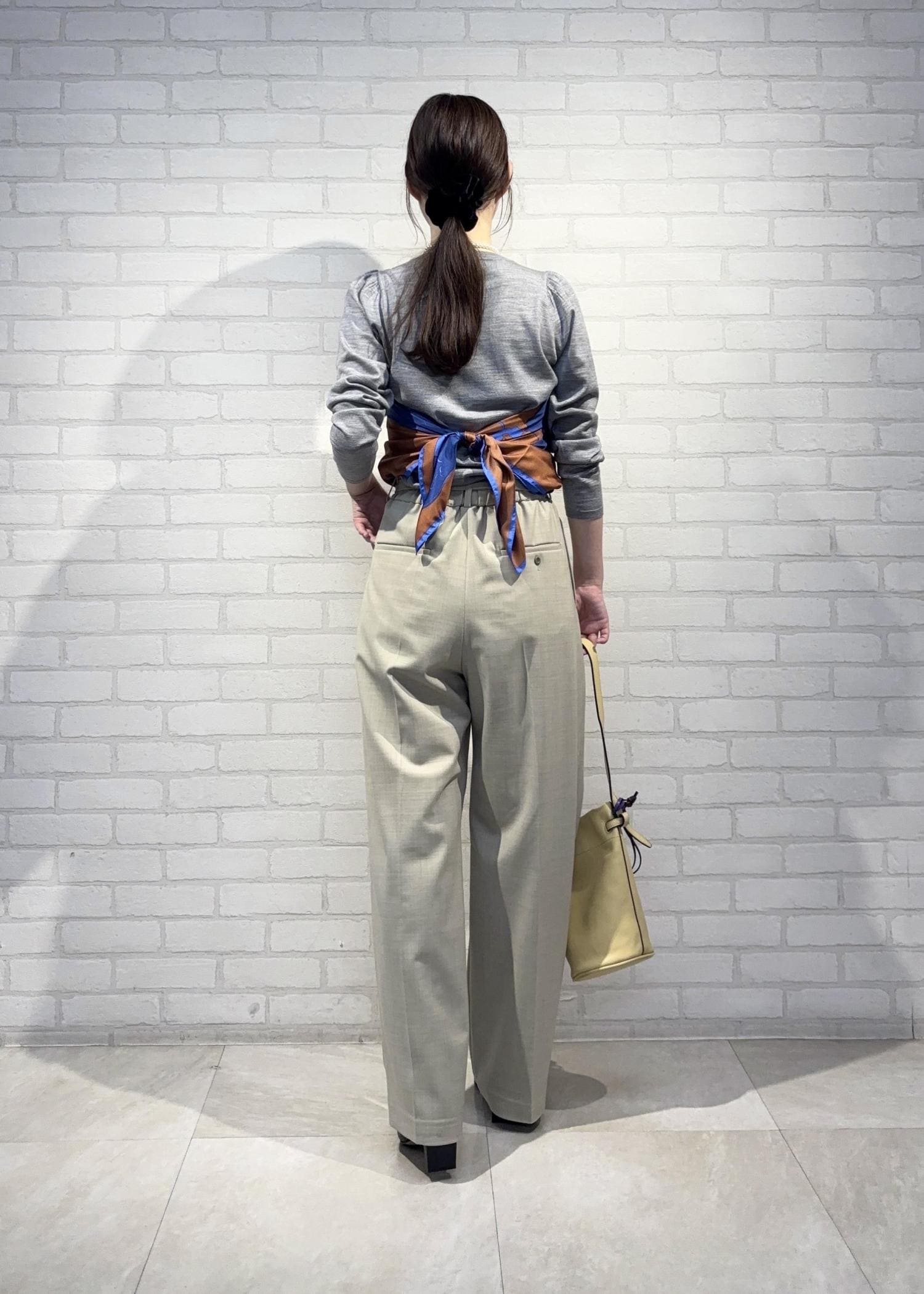ウエストは2タックデザイン。ベルトでウエストを調節でき、パンツの後ろにはゴムが入っているので程よいフィット感もあり綺麗見えします。
