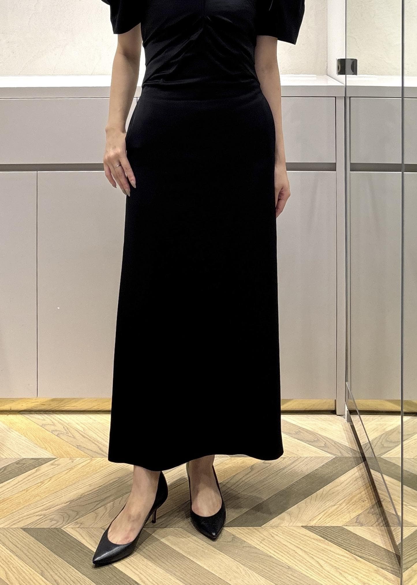 全体のサイズ感はジャスト、肩幅が広めの体型ですがパフの位置が内側に入っているので気にならず着用できました。ウエストは若干余裕あり、骨盤が少しピッタリ感じました。着丈は長めの設定でくるぶしあたり、バックスリットは膝上あたりから。 -