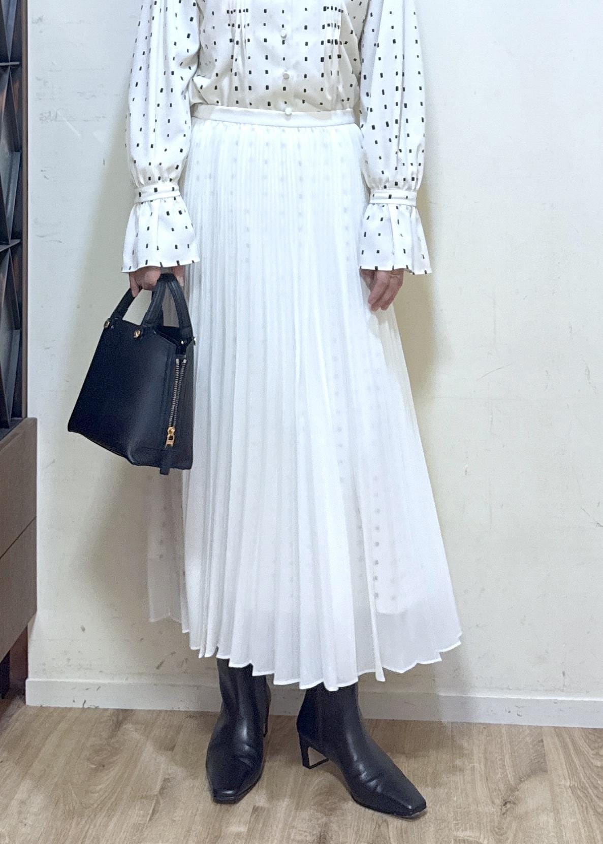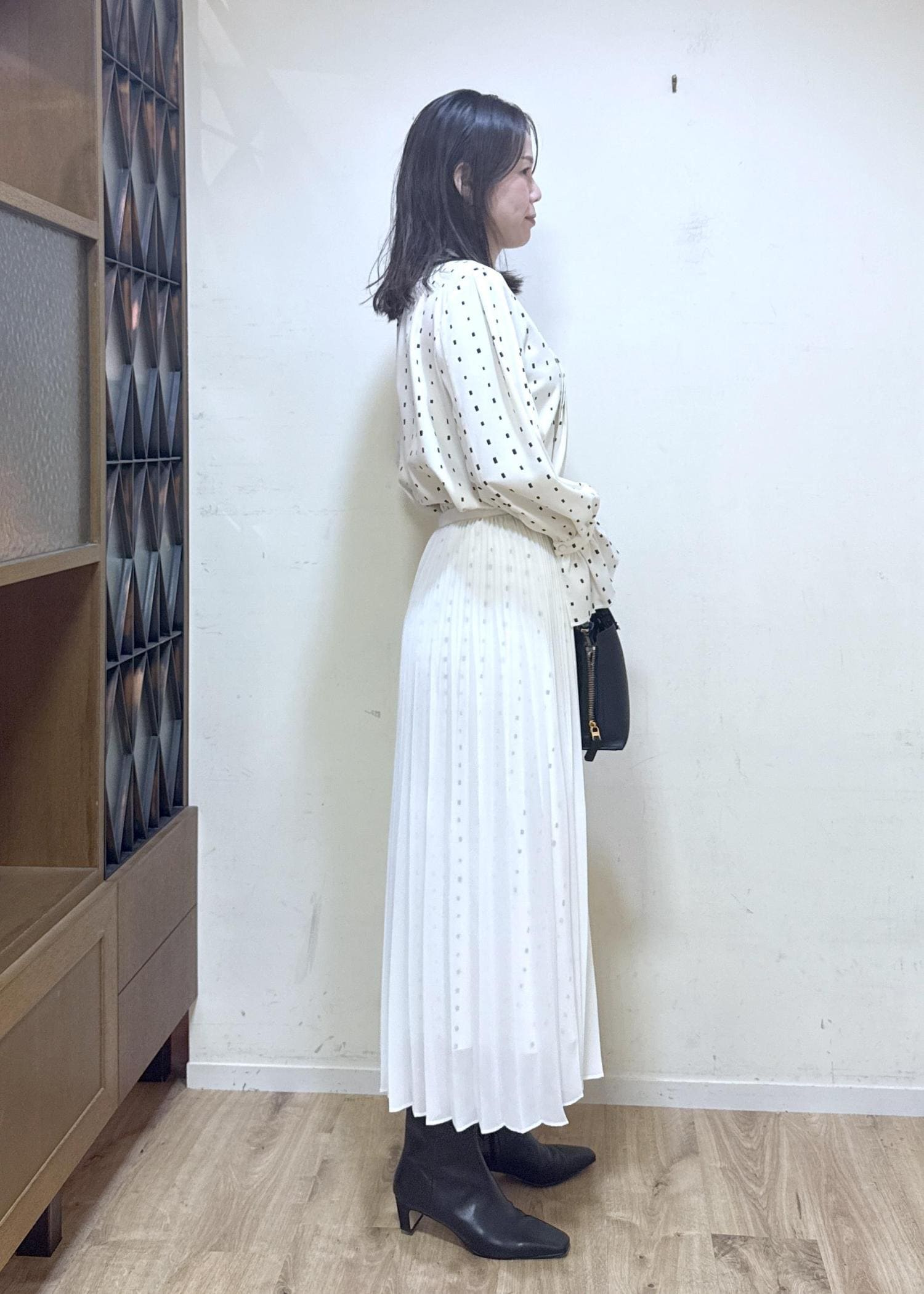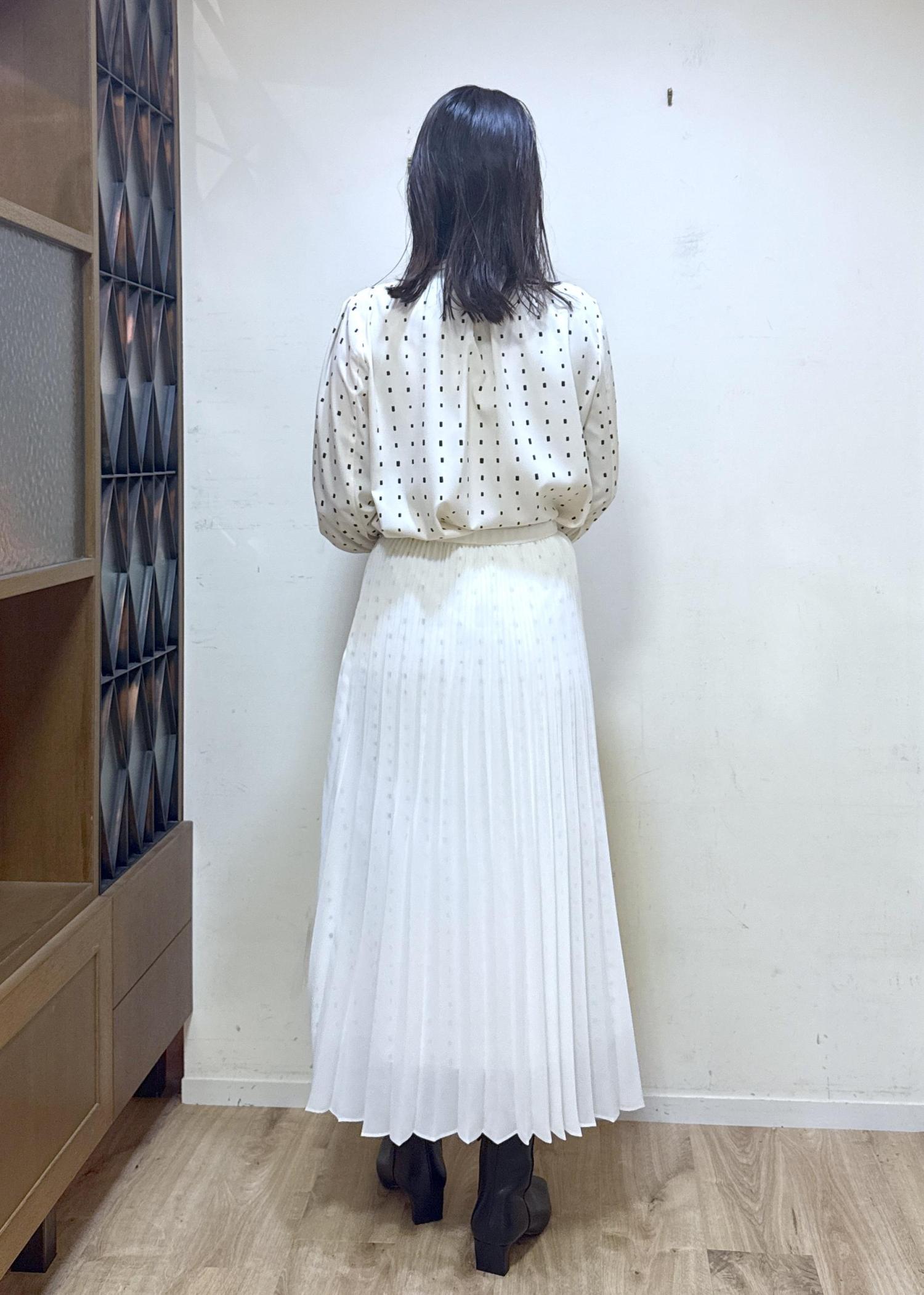 透け感のあるプリーツを重ねているのて、スクエアドットが新鮮で可愛くなりすぎないのも◎ -