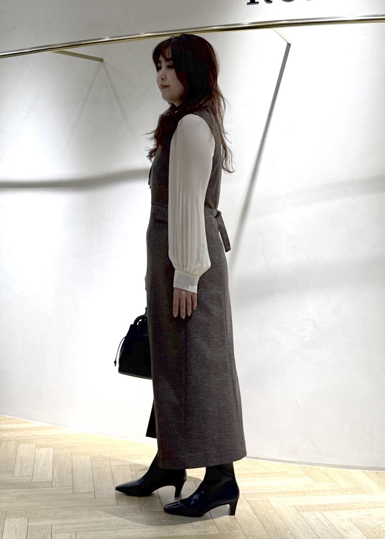 着丈はしっかり長くラインもスッキリしていて大人も甘くならず着用できるジャンパースカートだと思います。