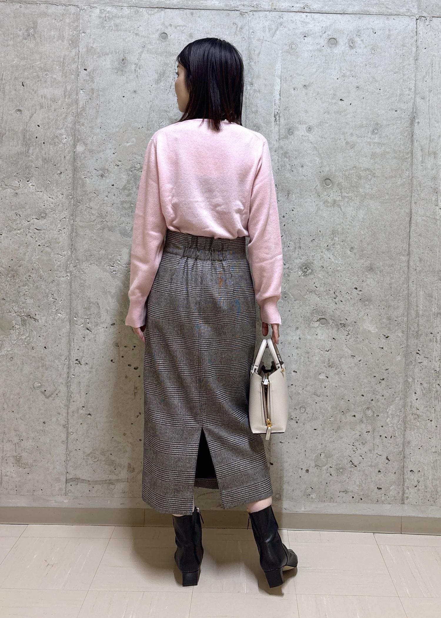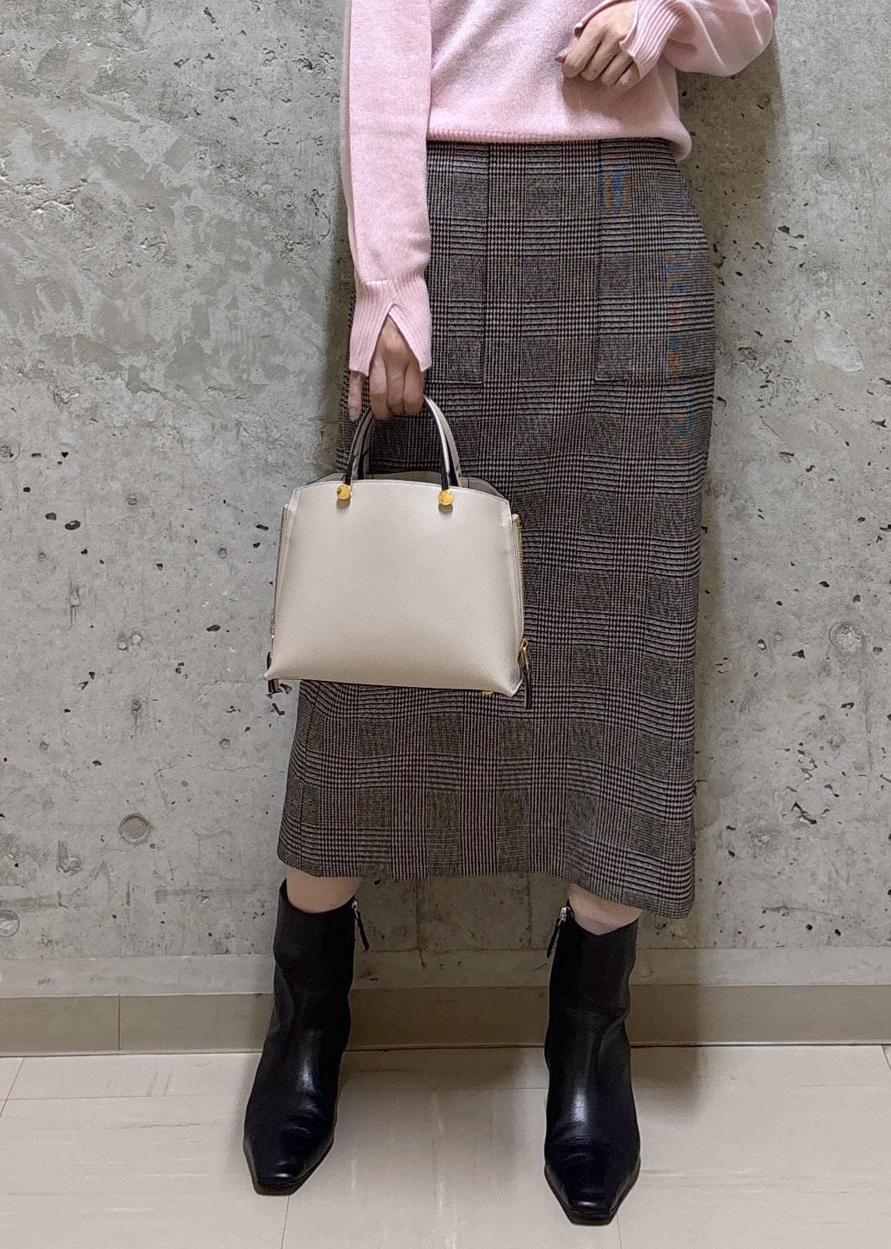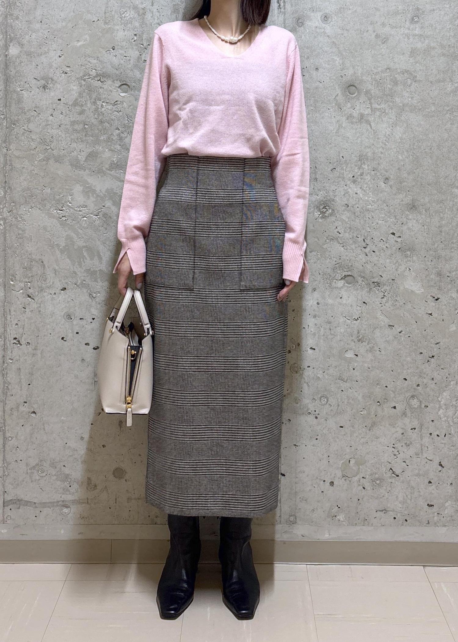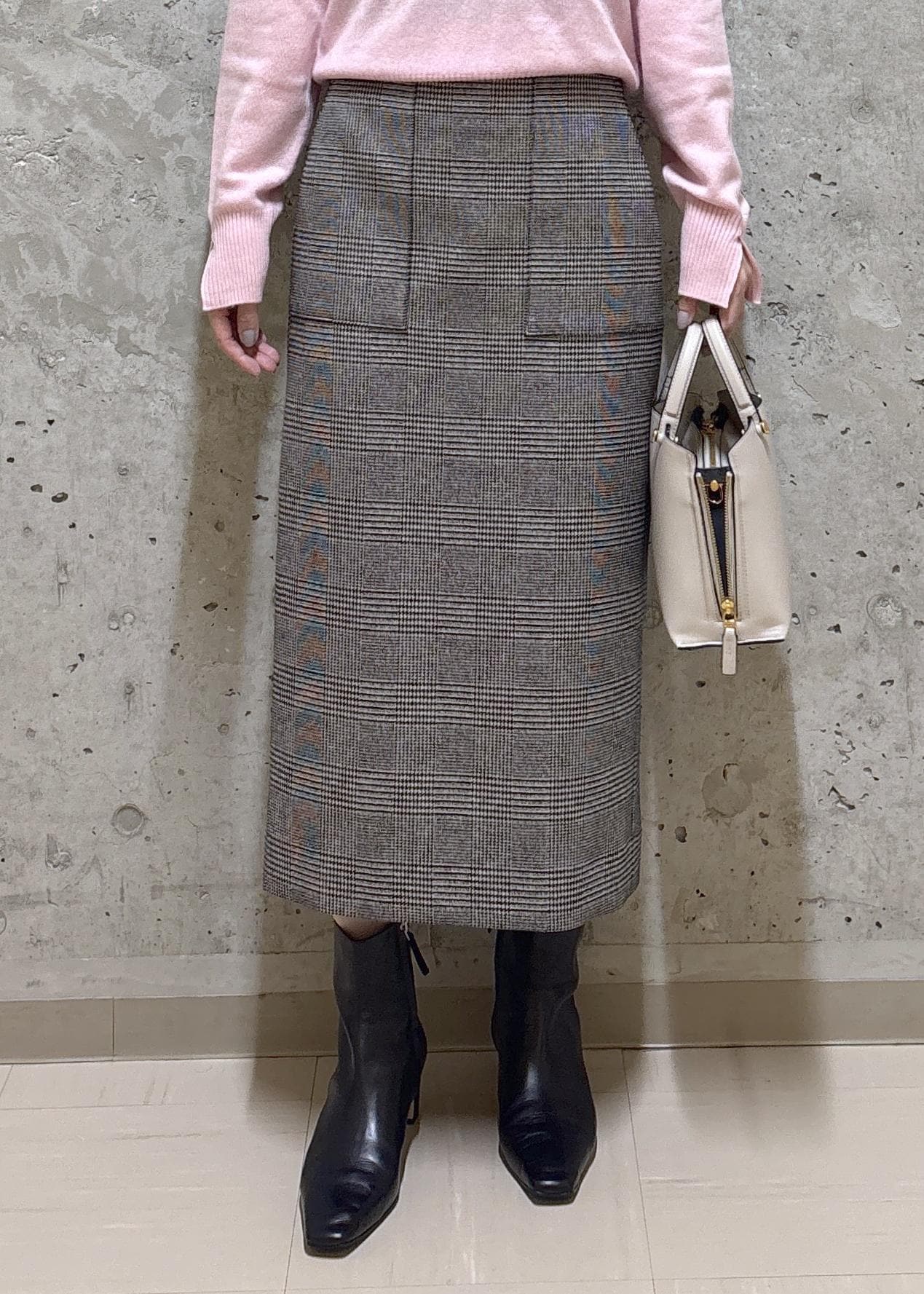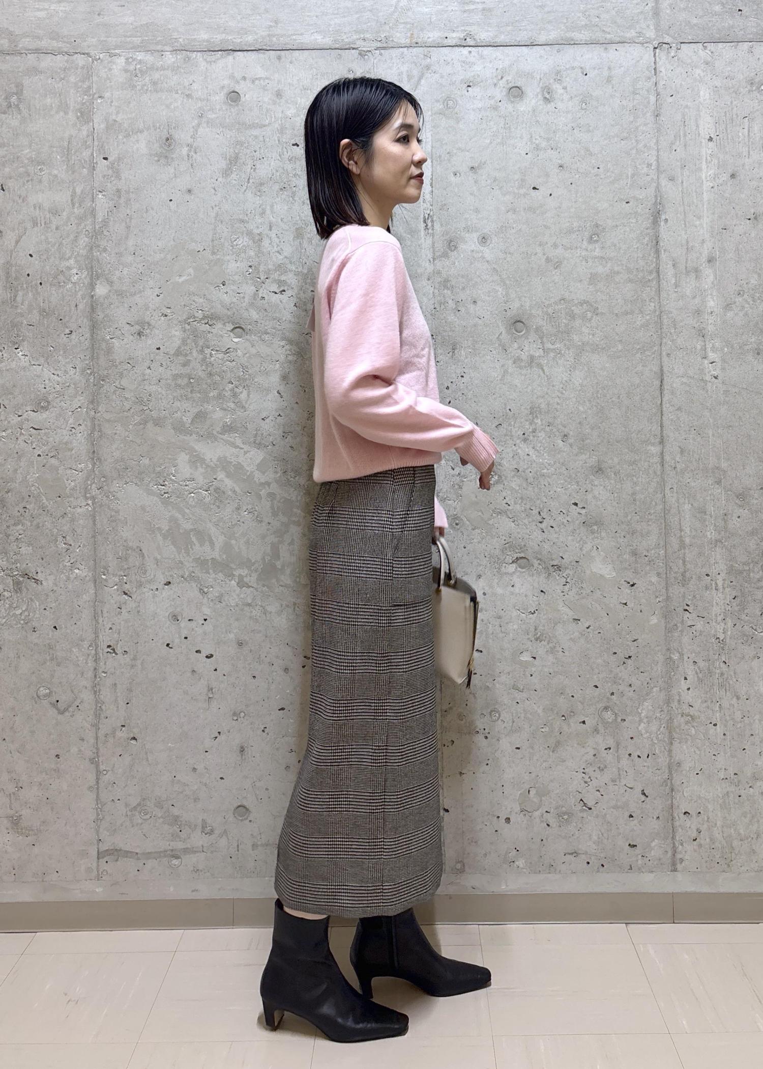 今回はチェック柄のタイトスカートを合わせてメリハリ感のあるキレイめなコーディネイトに。