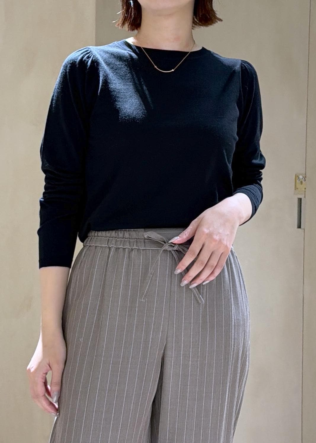 ROPÉ袖ギャザークルーネックニットプルオーバー/イージーケアブラック / F¥19,800レビューほどよいゆとり感があるため身体のラインを拾うことなく1枚着としてはもちろんですが、ジャケットのインナーとしてもおすすめです。
