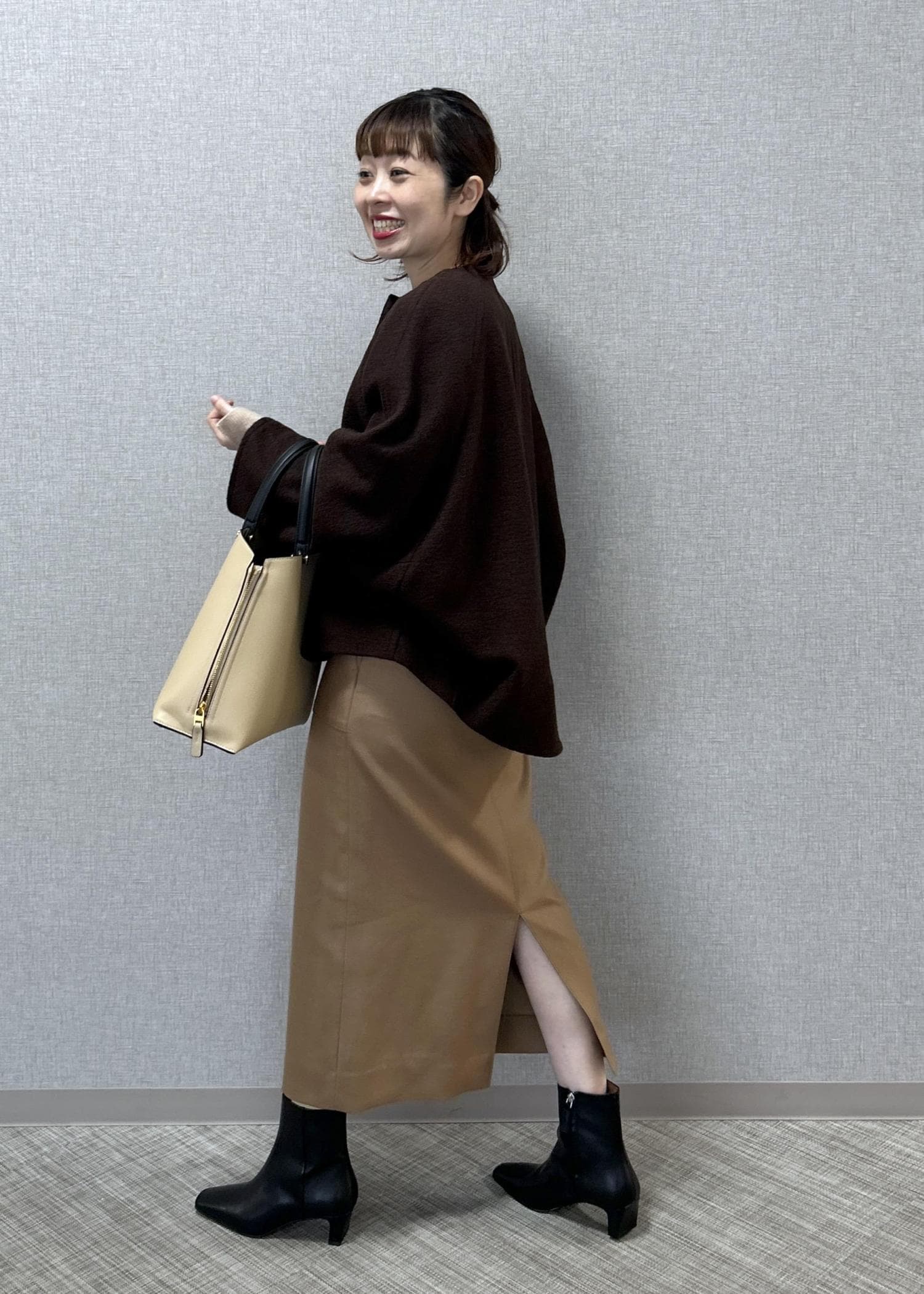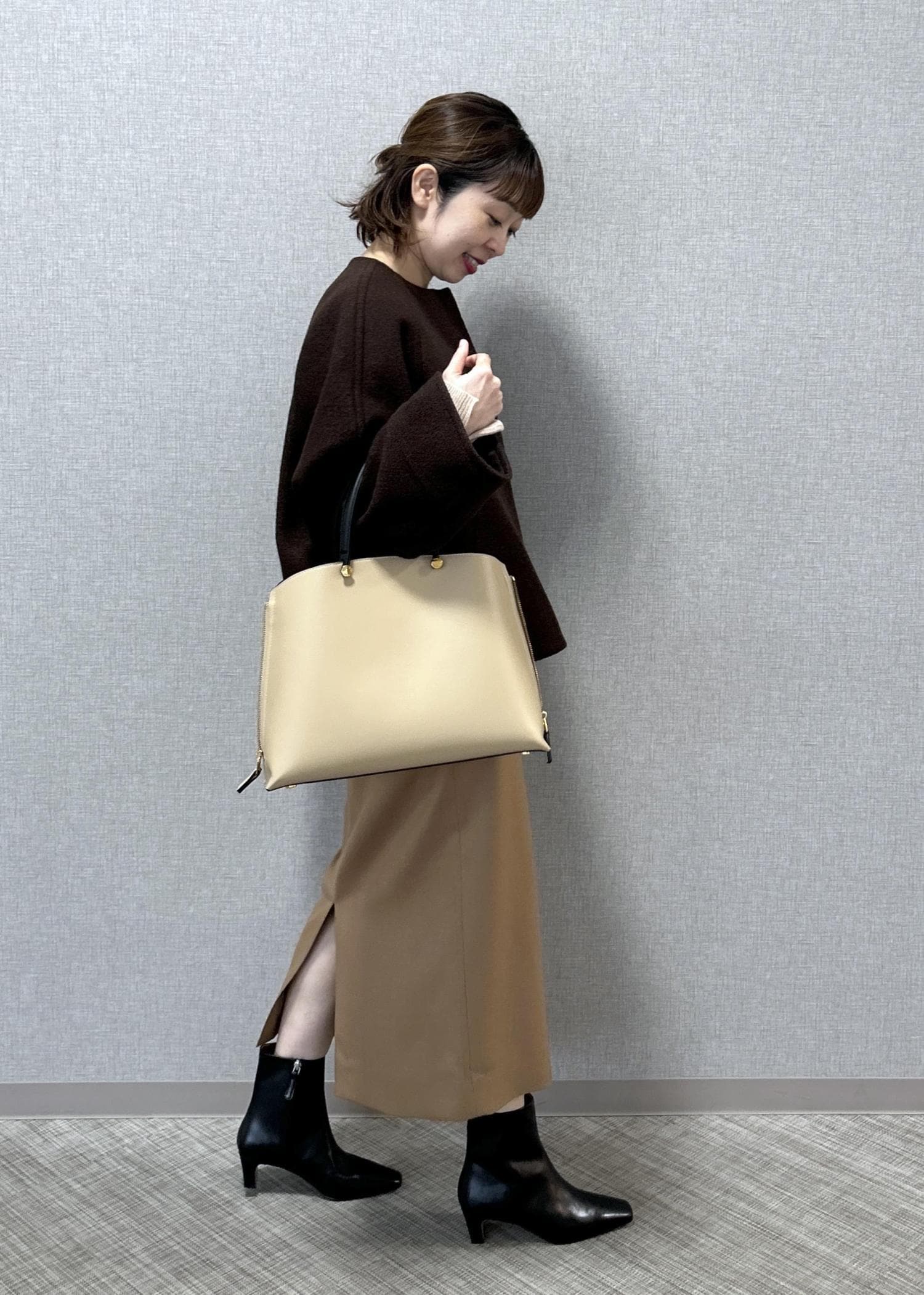 ブーツは艶感もあり綺麗めやカジュアルのどのコーディネートにも合わせやすいです。