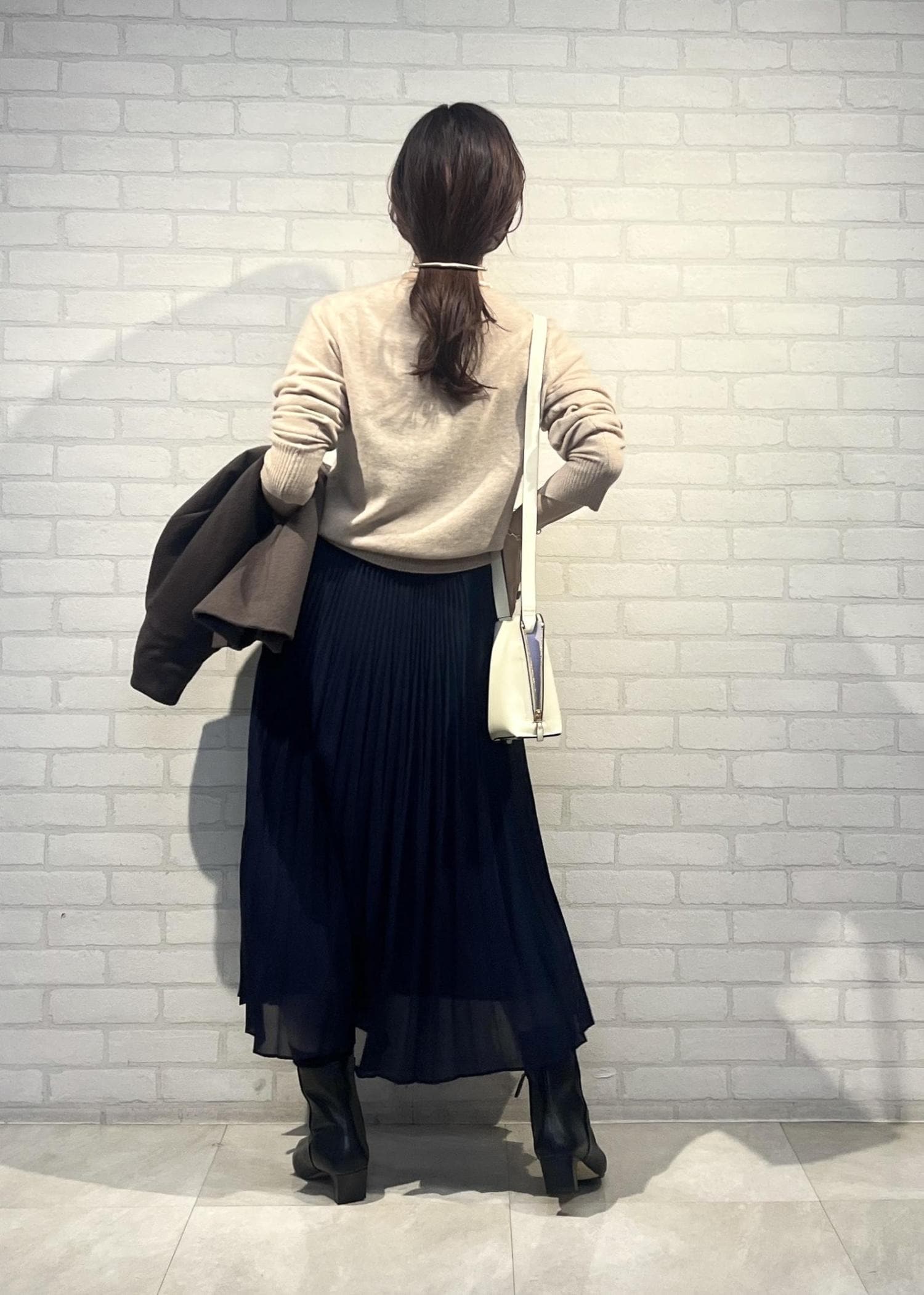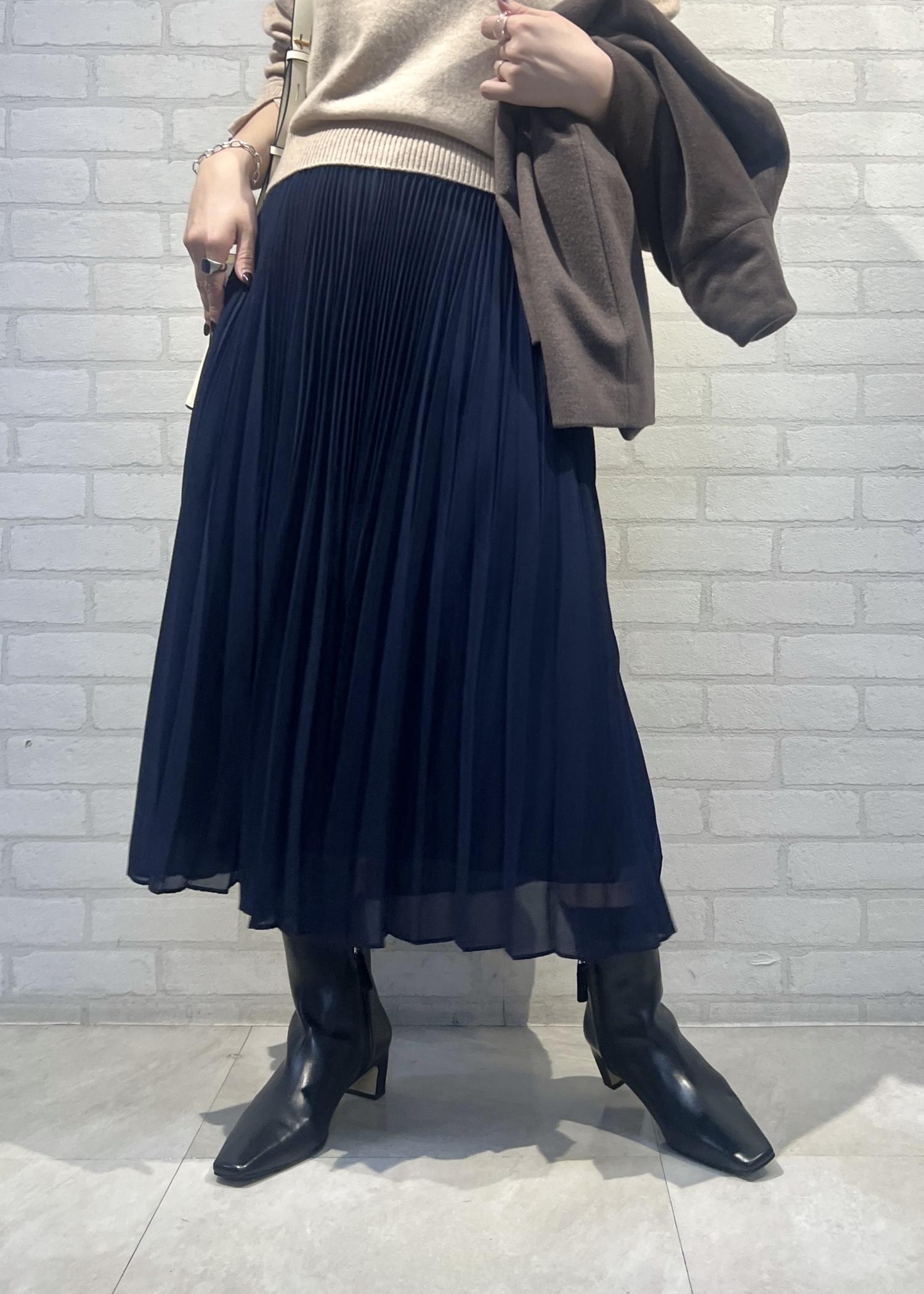 ROPÉプリーツスカート(無地)ネイビー / 36¥21,560レビュー着丈はふくらはぎ半分くらいの丈感。内側のインナーの方が短く、プリーツの方は透け感があるので重たく見えず軽やかな印象。