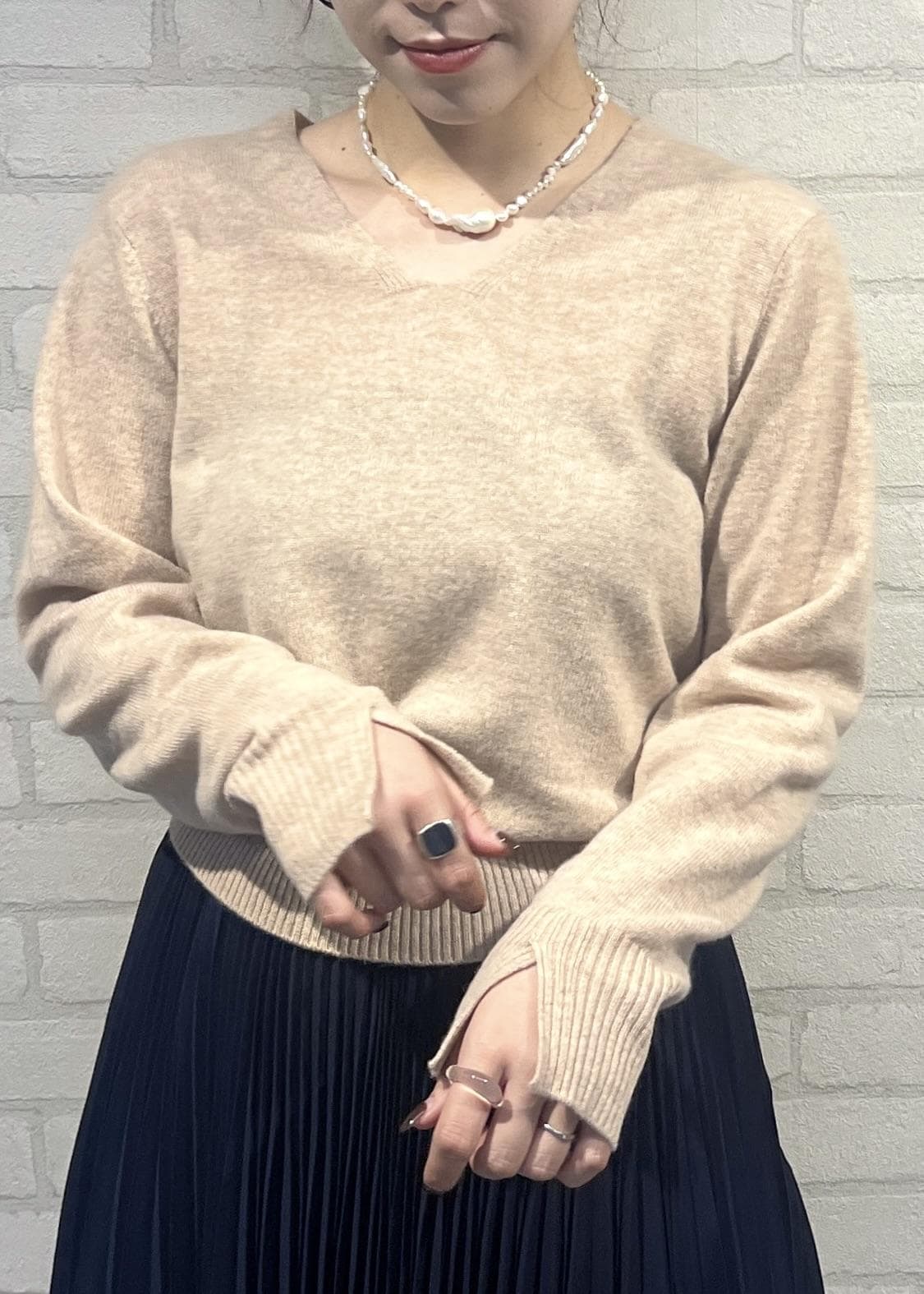 NEW!ROPÉカシミヤVネックニットプルオーバーベージュ / F¥25,300レビュー着丈はお腹周りがカバーできるくらいでお尻は隠れない短めの丈感。裾にリブを施しているので、ブラウジングが簡単に出来ます◎