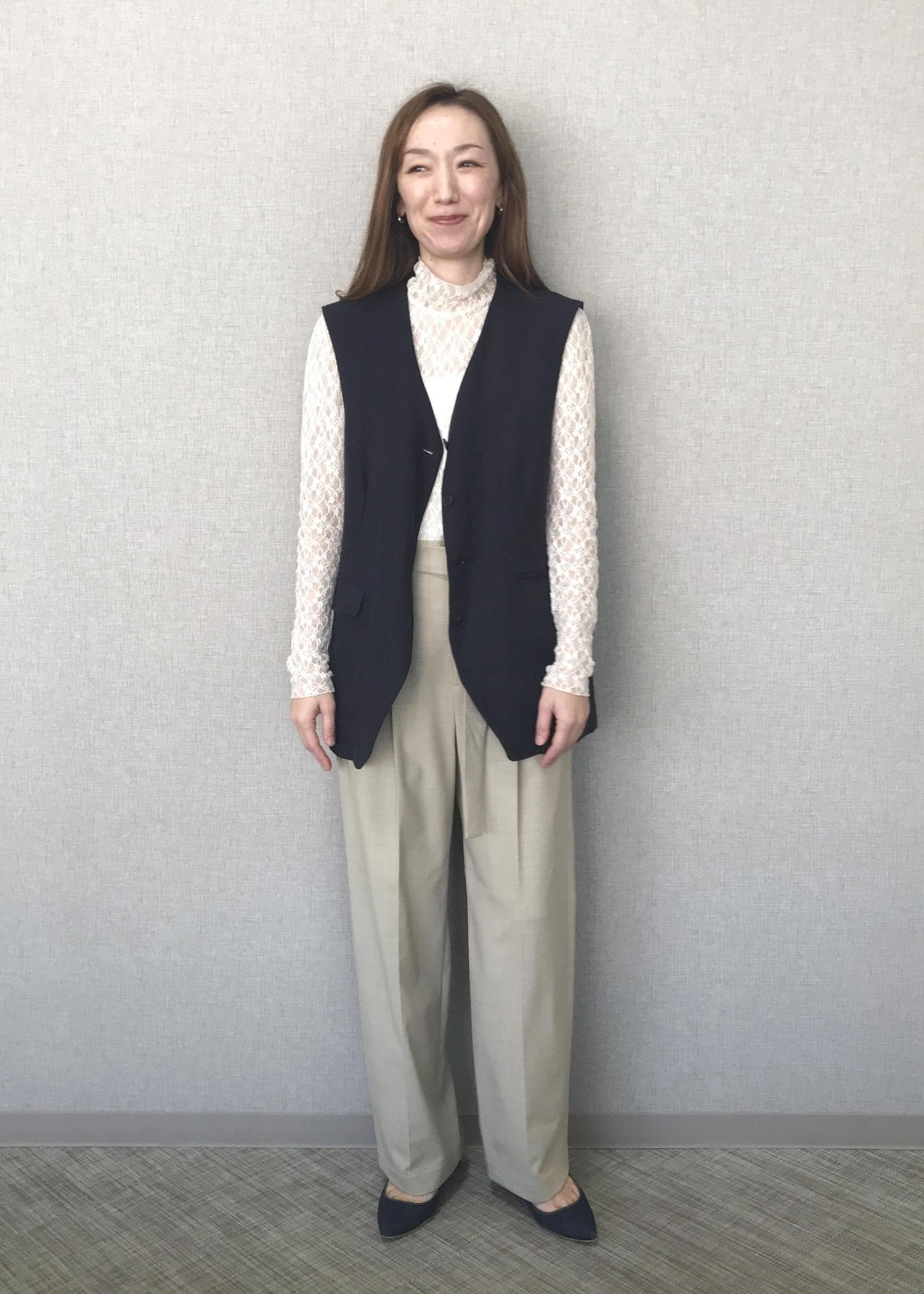 後ろ下りのデザインで前は後ろより8〜10cm程丈の長さが短いです。
