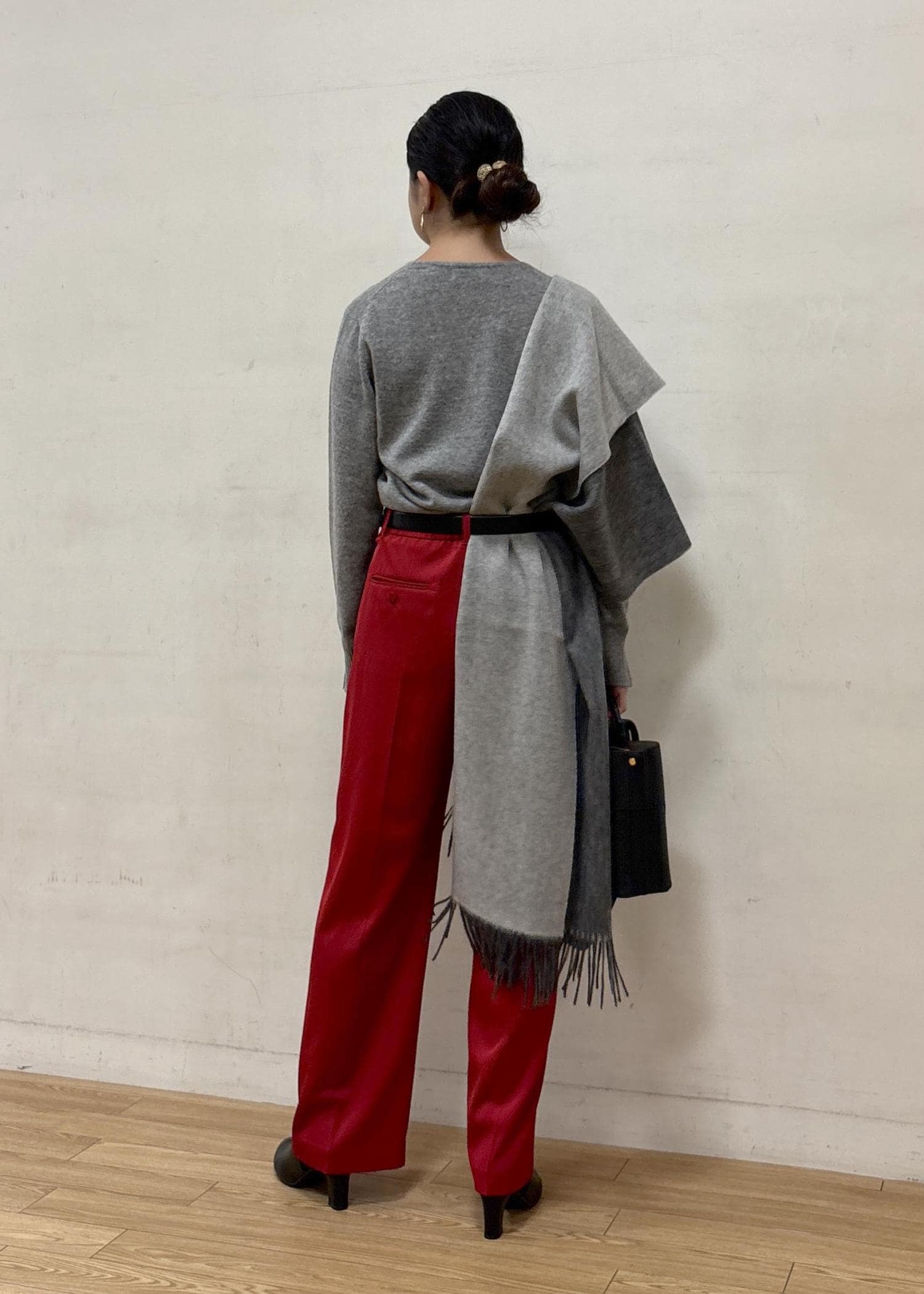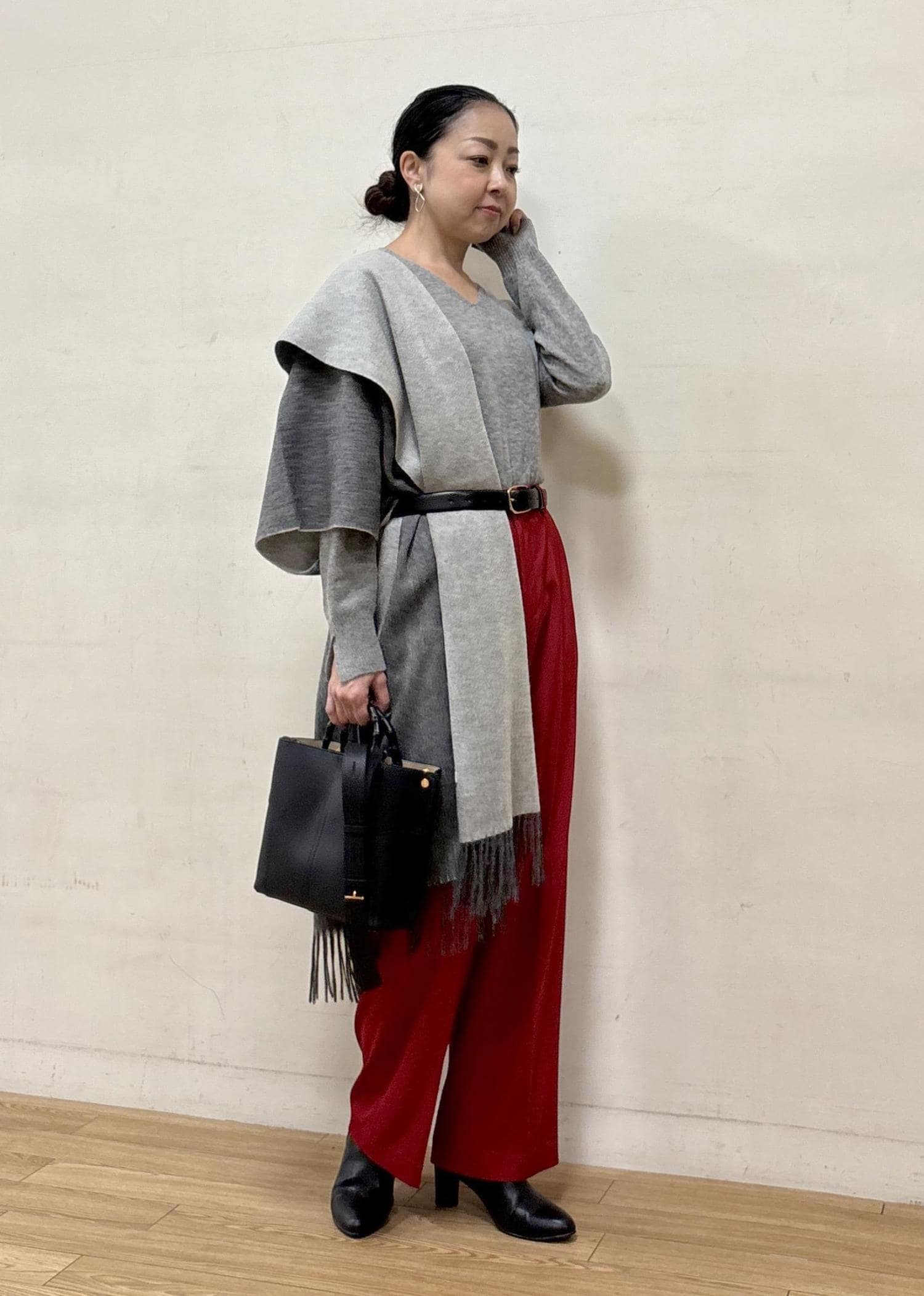 肌あたりのよいカシミア100%のニットに同色のストールを合わせた秋晴れの日におすすめの軽やかコーディネート。