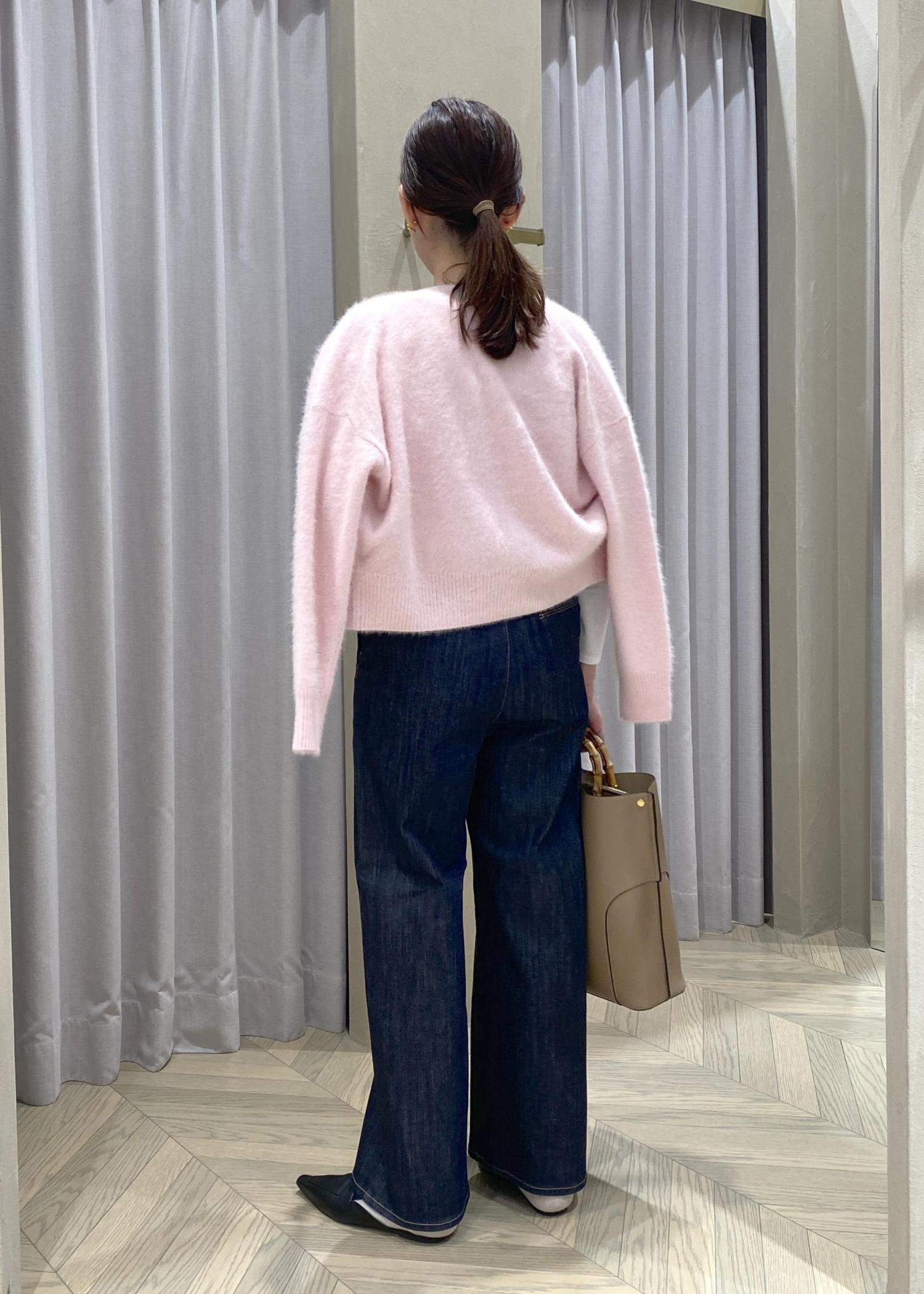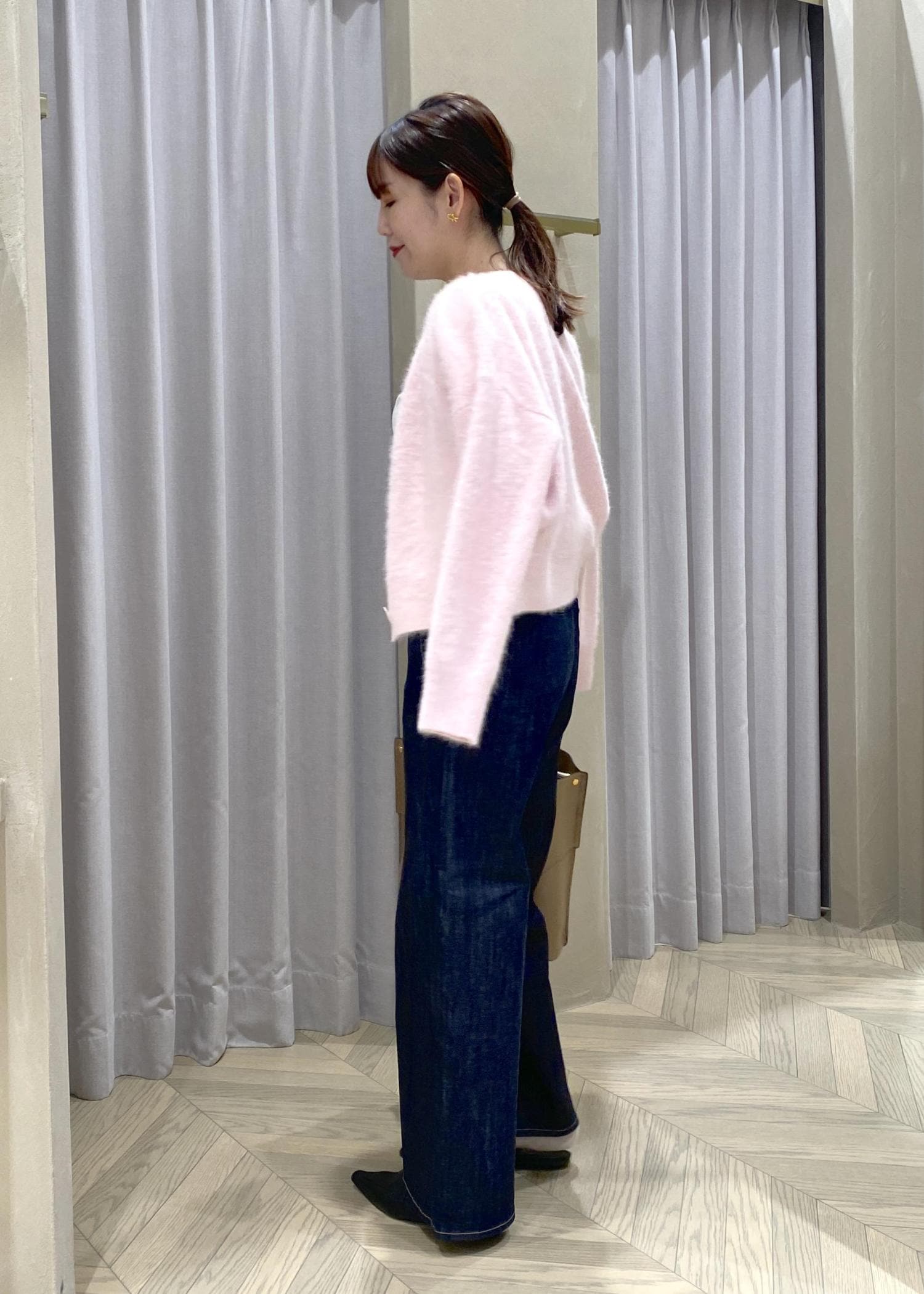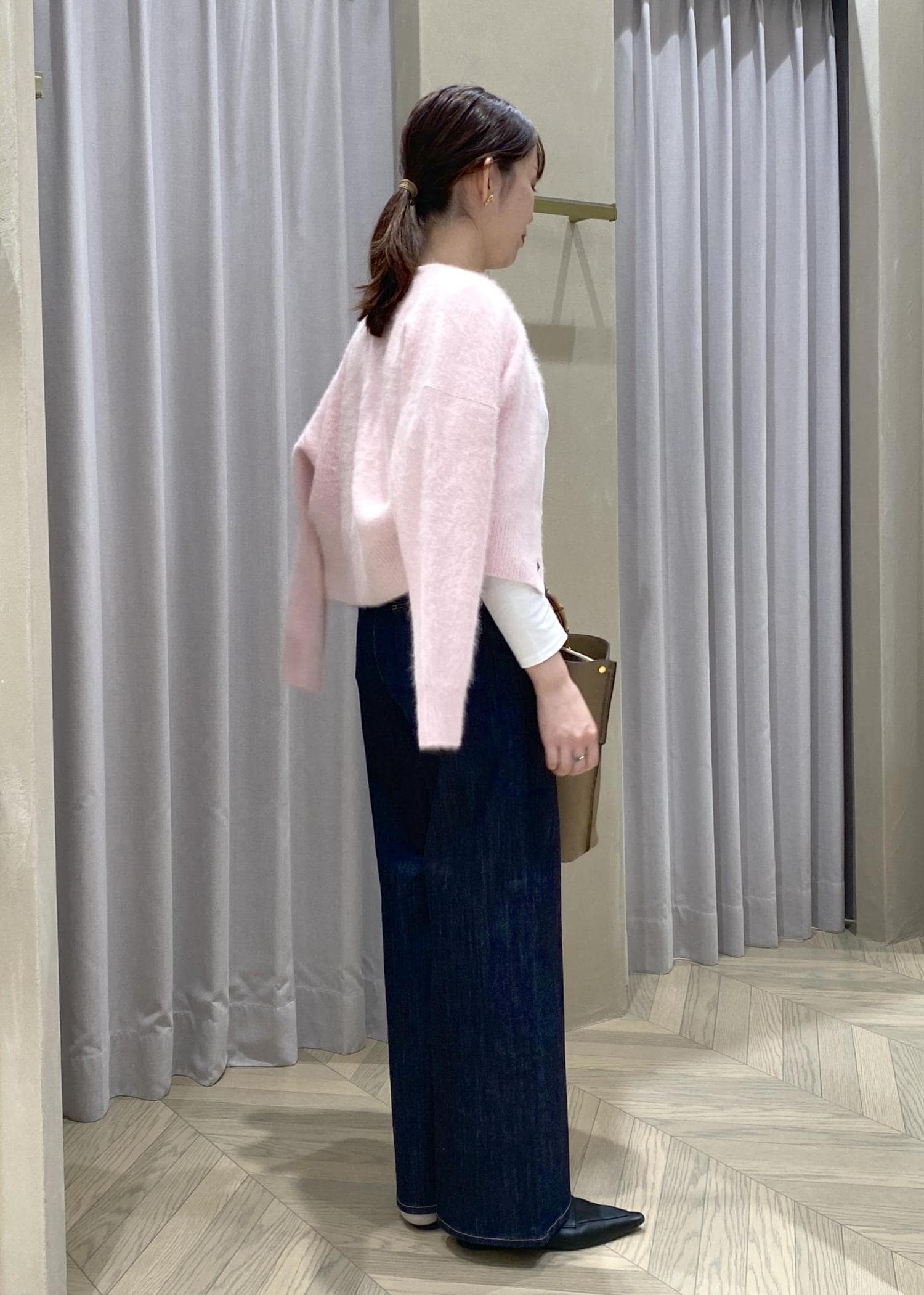 淡いピンクのカーディガンに濃色デニムを合わせて、甘さを抑えた大人のフェミニンカジュアルに。