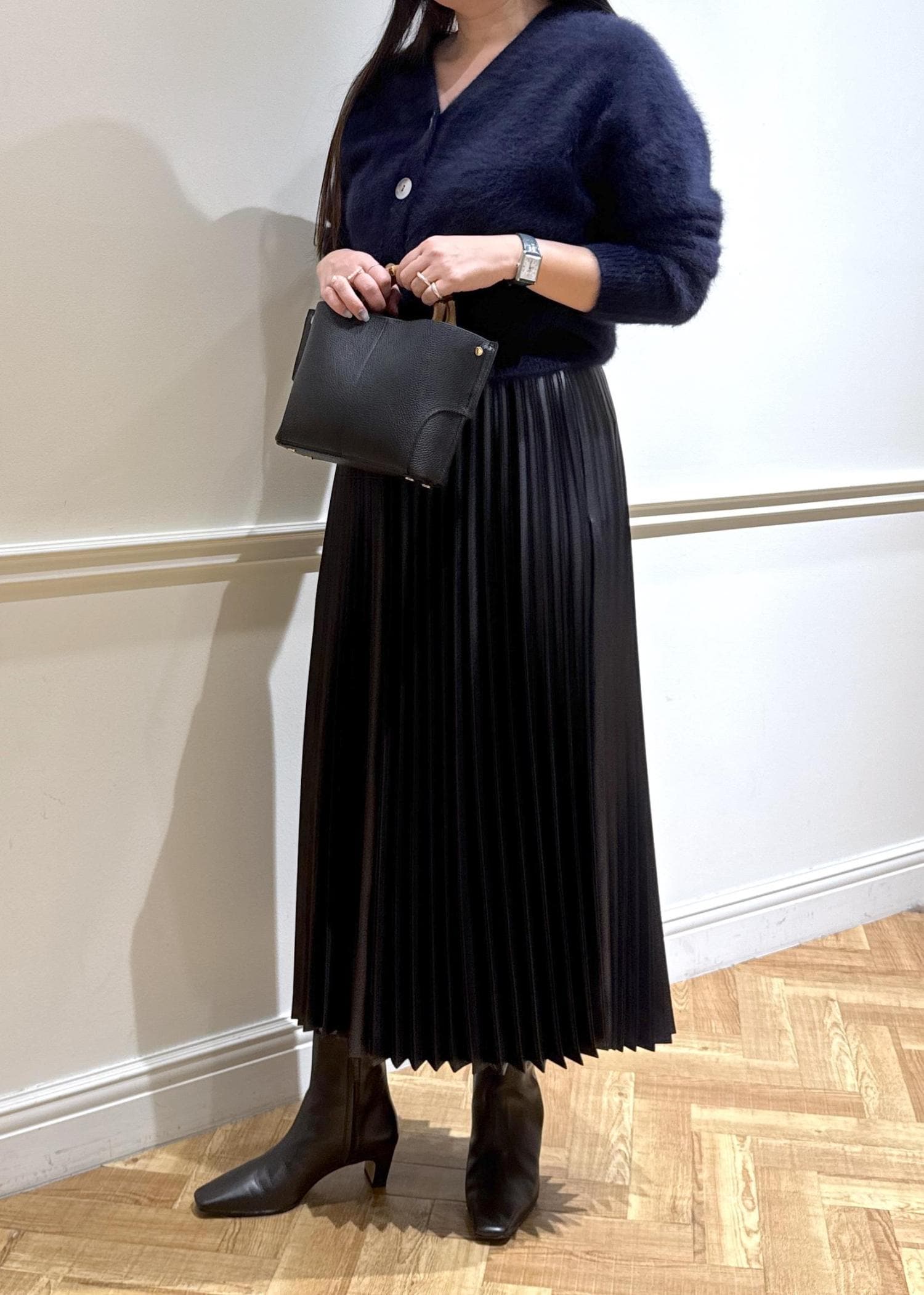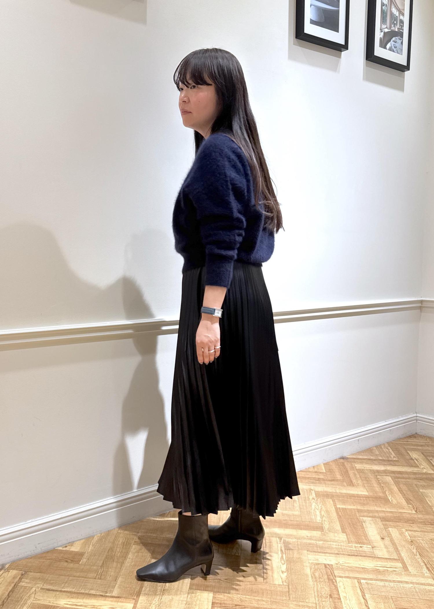 スカート、バッグ、ショートブーツはブラックですっきり。