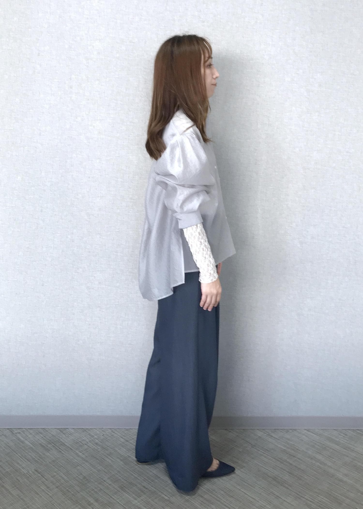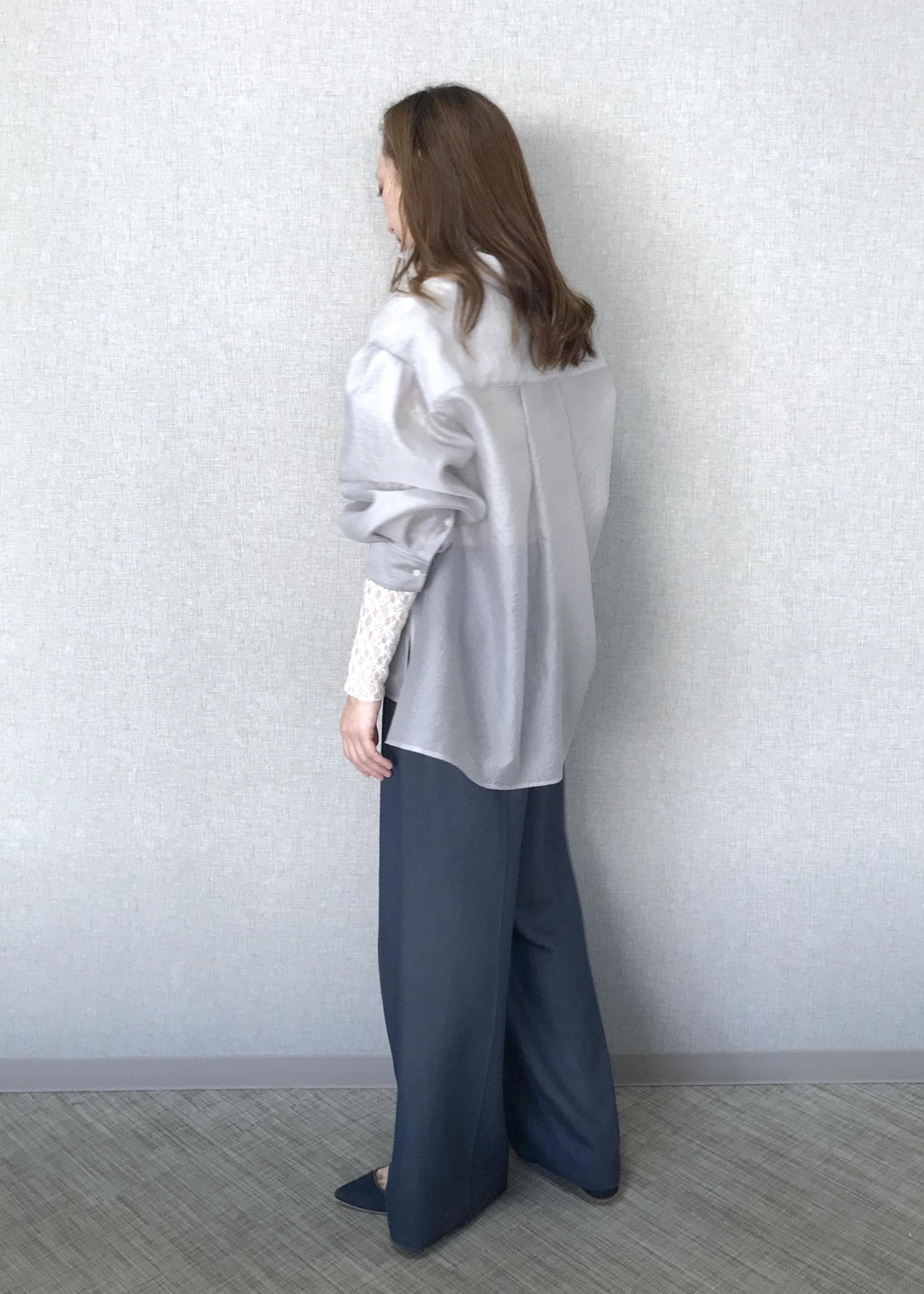 グレーカラーを普段着ないですが、ライトな色合いと光沢感があり、入りやすい色合いです。