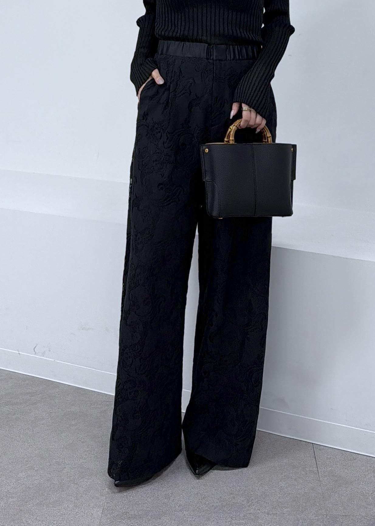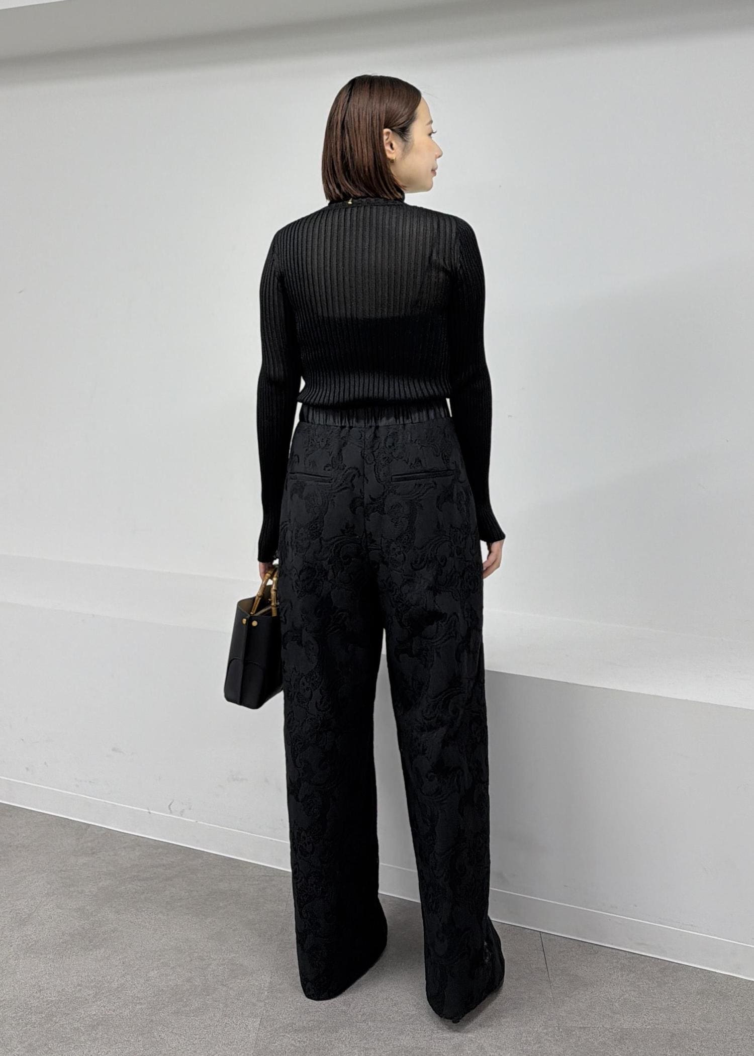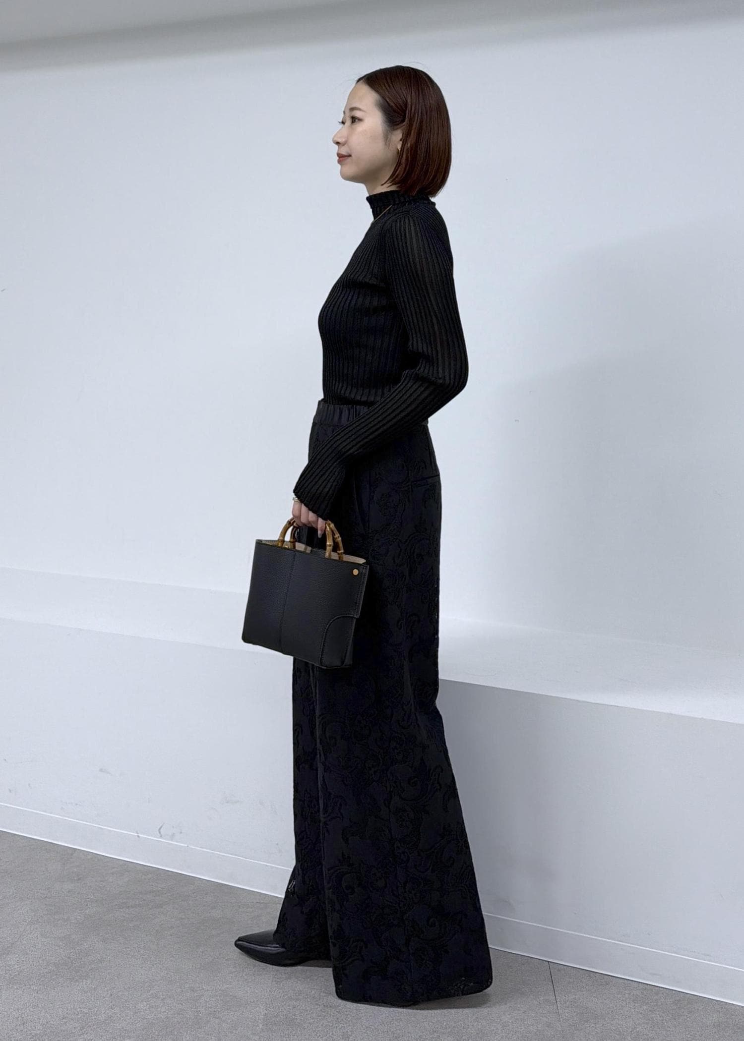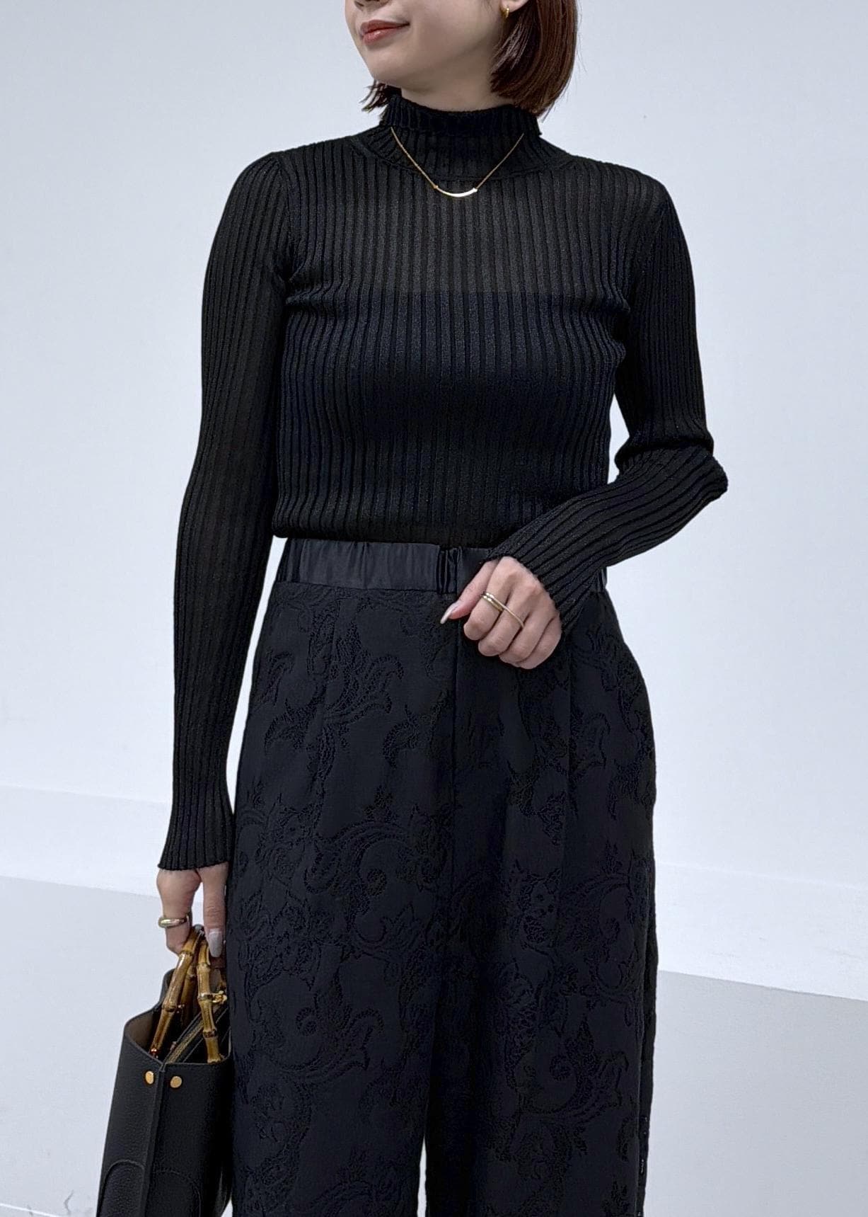 オールブラックコーデでも重たく見えないようにトップスはラメ感のあるシアーニット、ボトムは柔らかな印象になるレースボトムを合わせました!