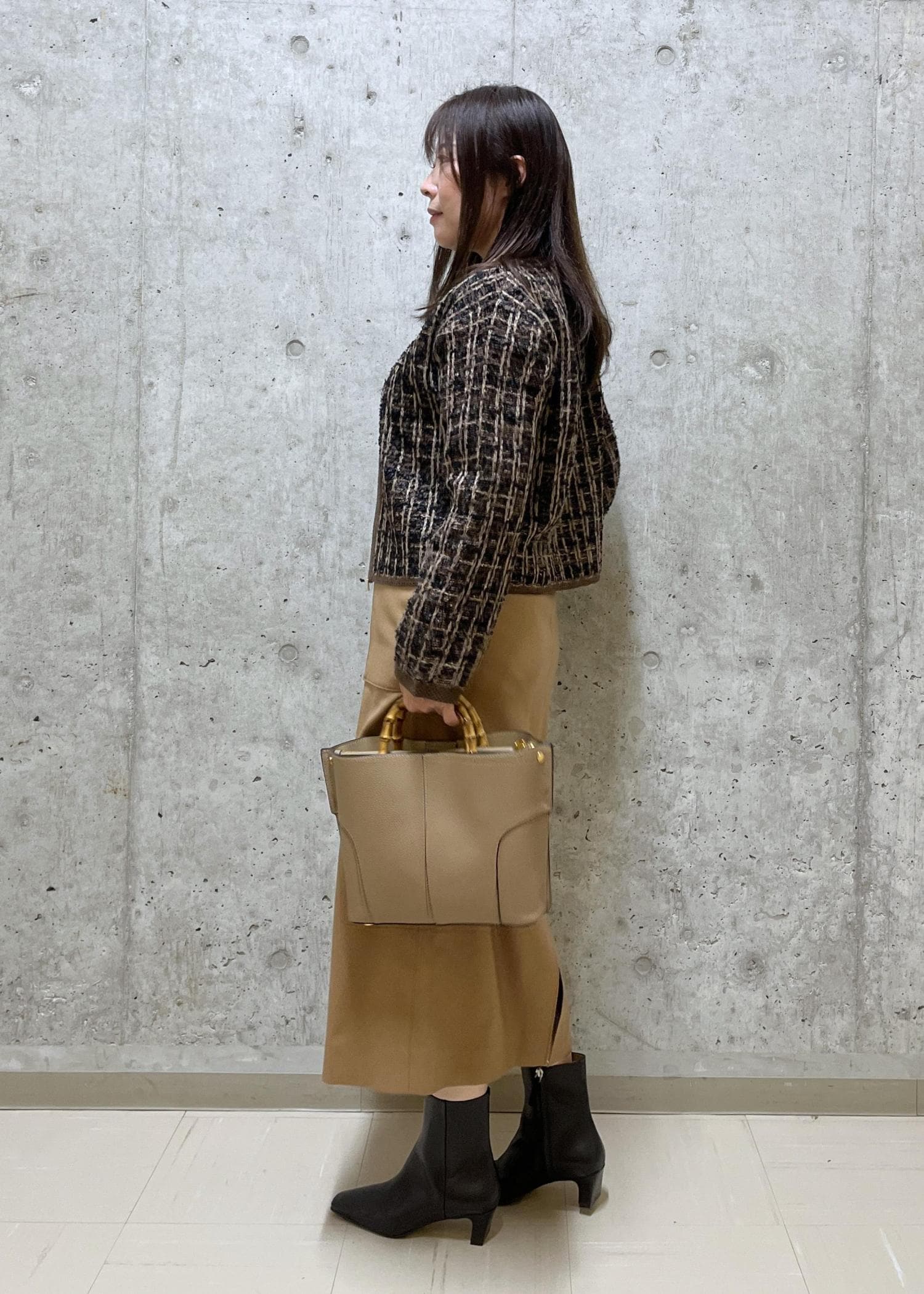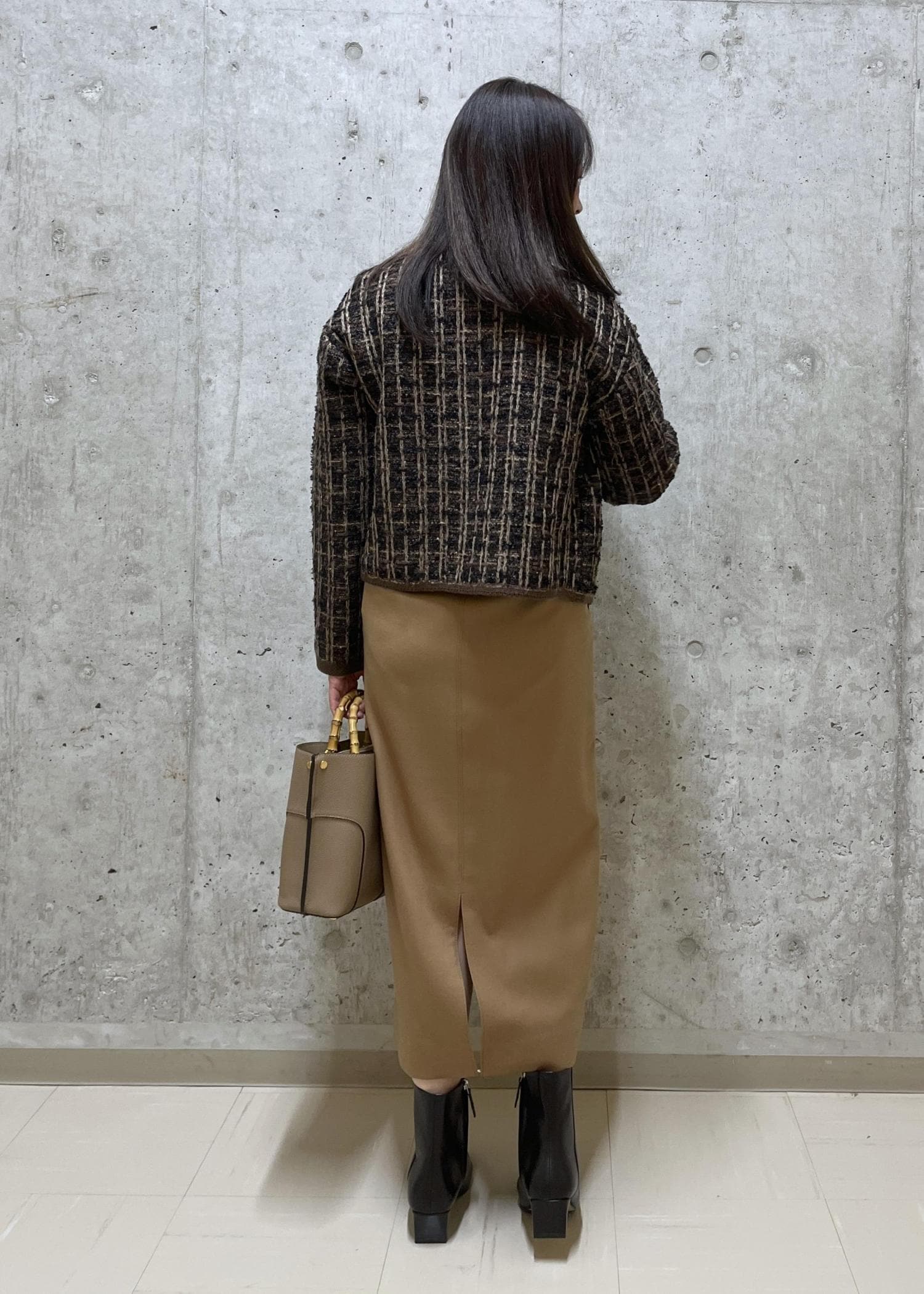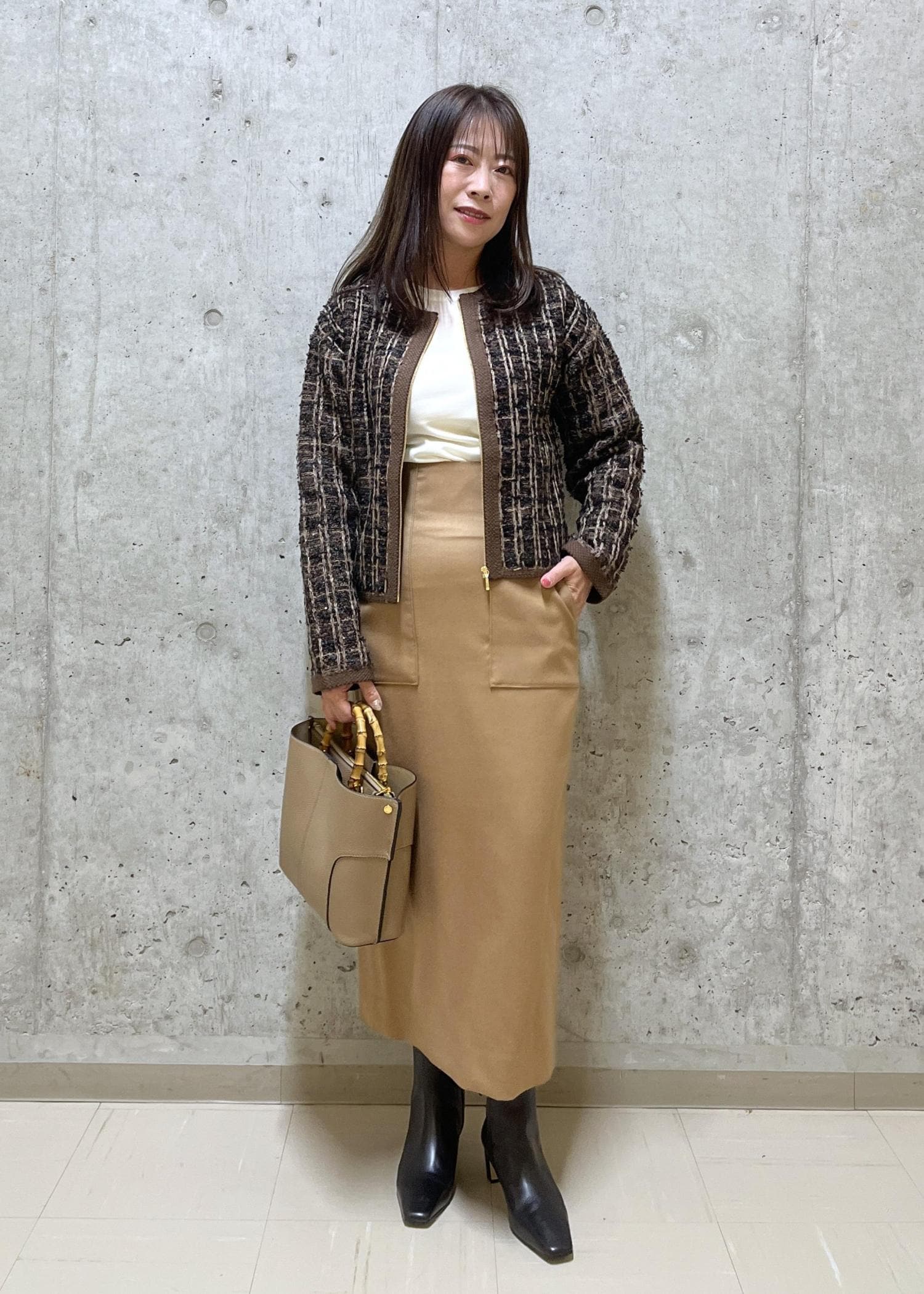 スパコールの入ったツイード調のニットが上品で、華やかさもあり、お仕事から普段使いまで着れるコーディネートです。