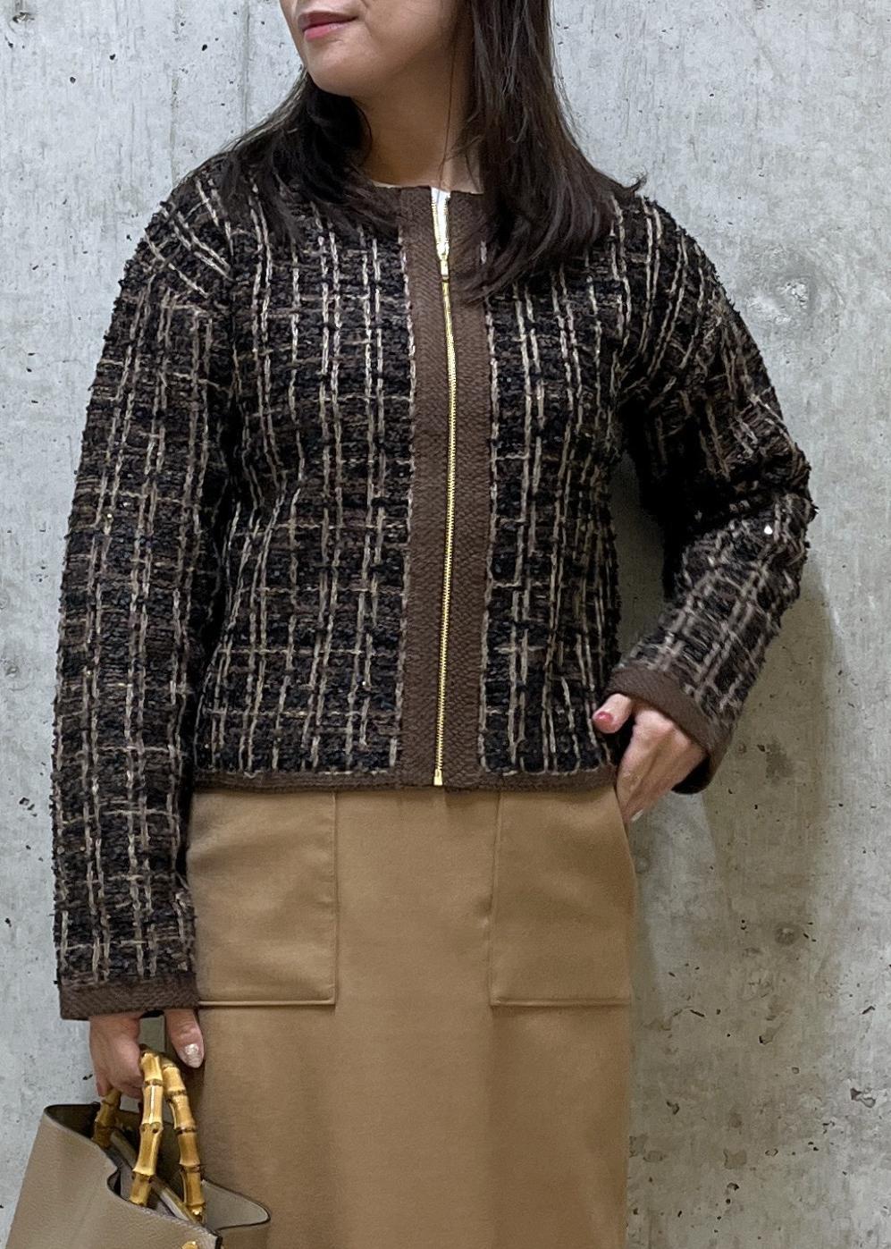 ツイード調ですがニットなのでカーディガン感覚で使えて、きちんとしたシーンでも来て行けます。