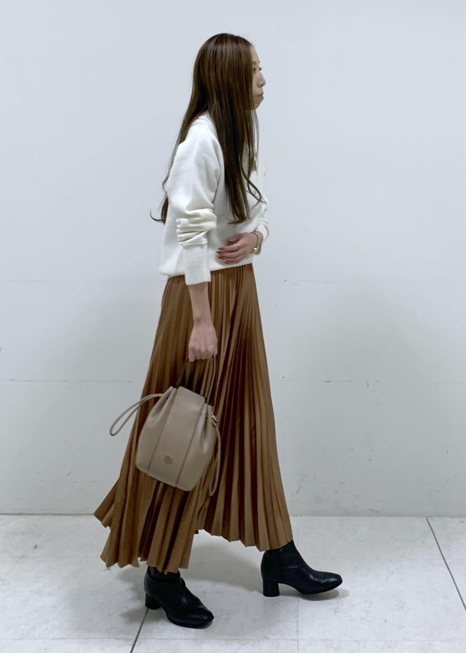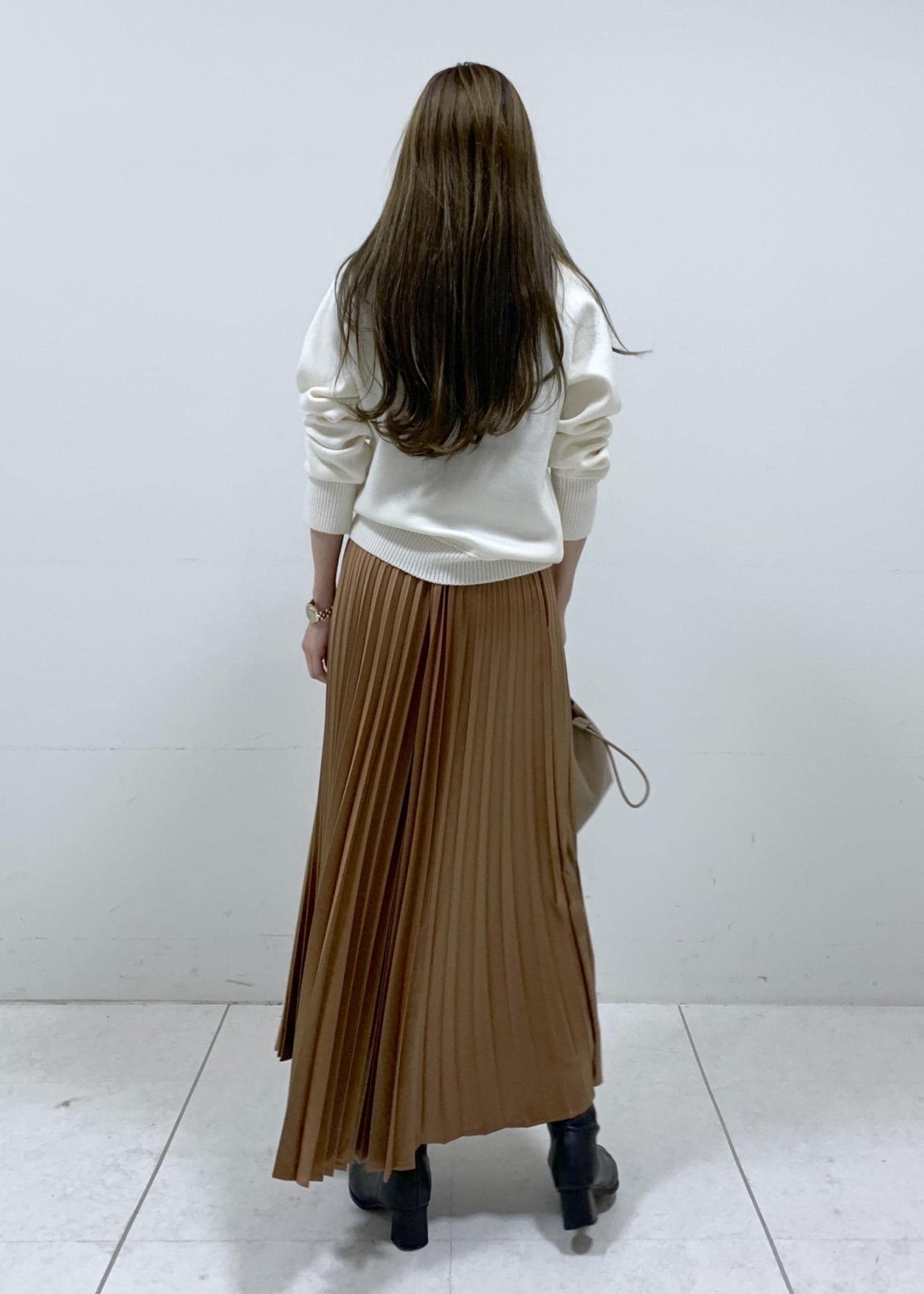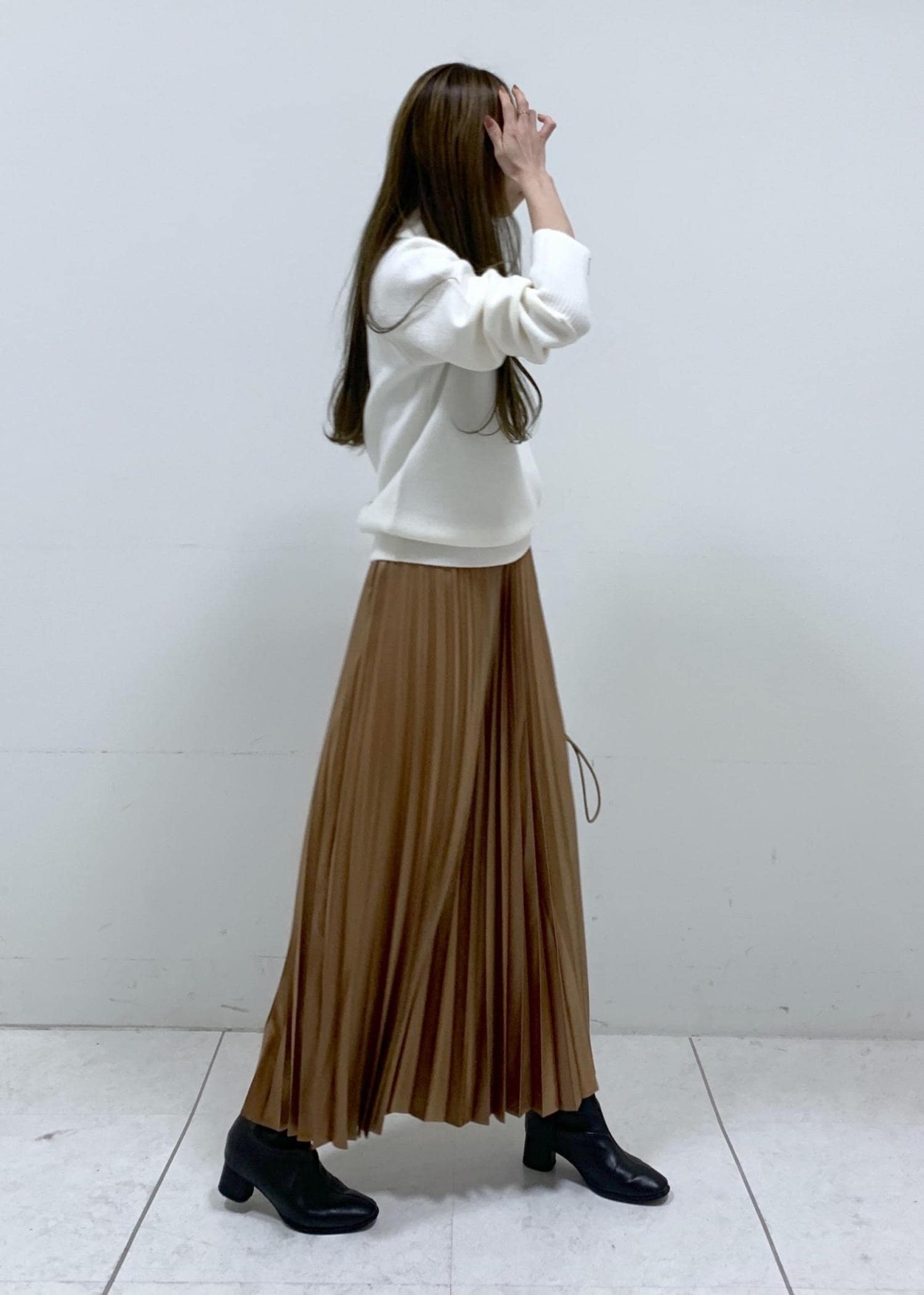 ROPÉシャイニープリーツスカート/イージーケアキャメル / F¥26,400レビュー程よい艶感がレザー見えするサテンのプリーツスカート。
