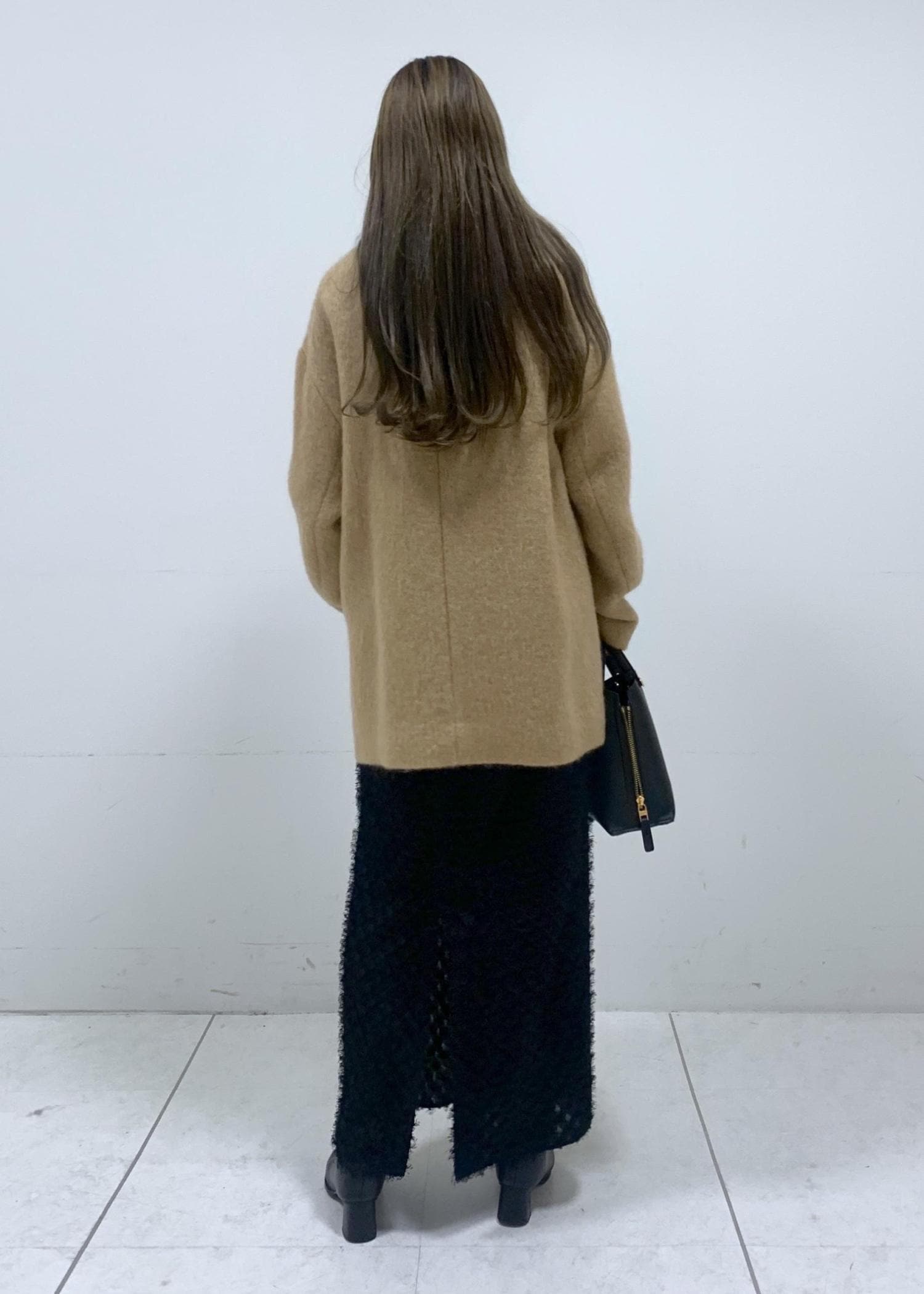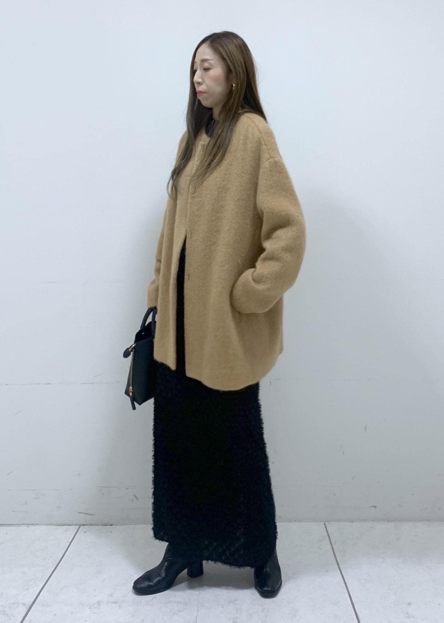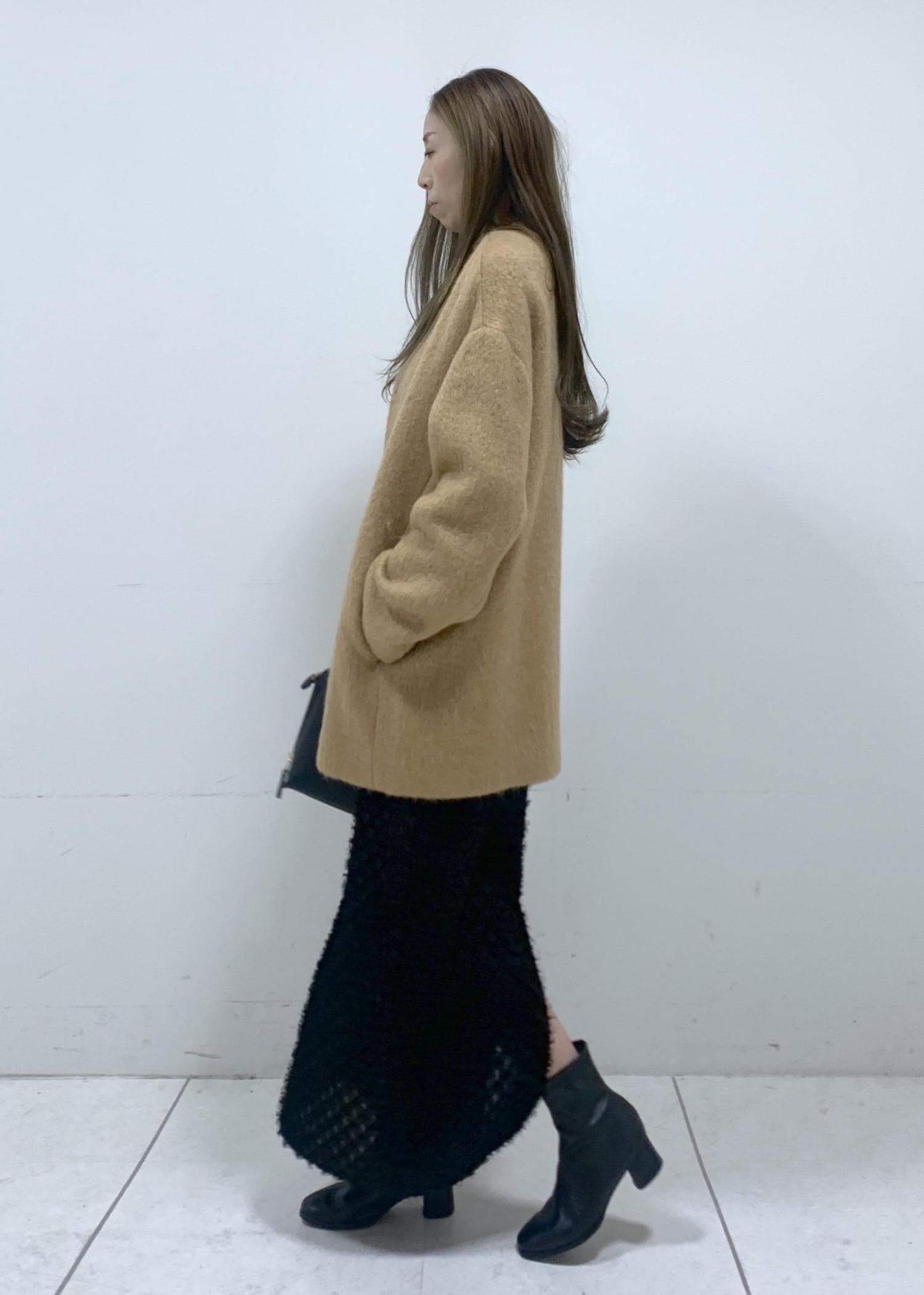フワフワした毛足の長さと軽い着心地のキャメルのモヘアコートに、軽くて温かいFOXニット、素材が華やかなジャガードスカートを合わせた綺麗めスタイルです。