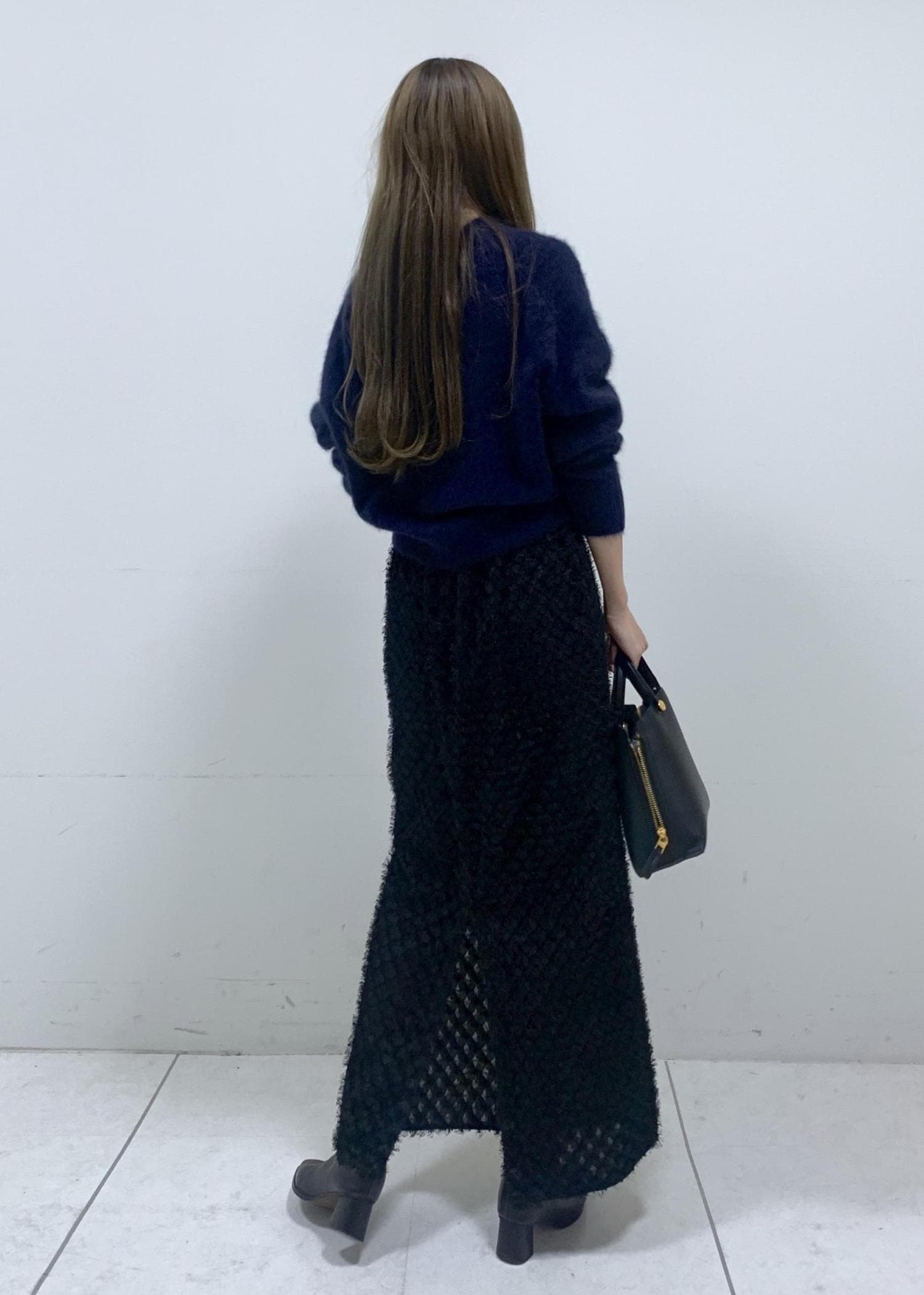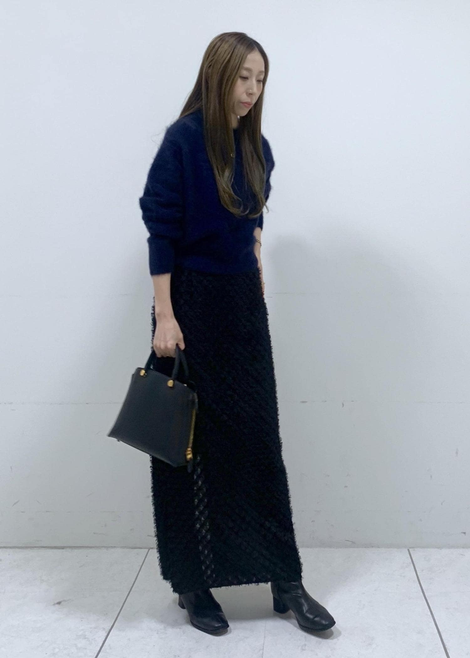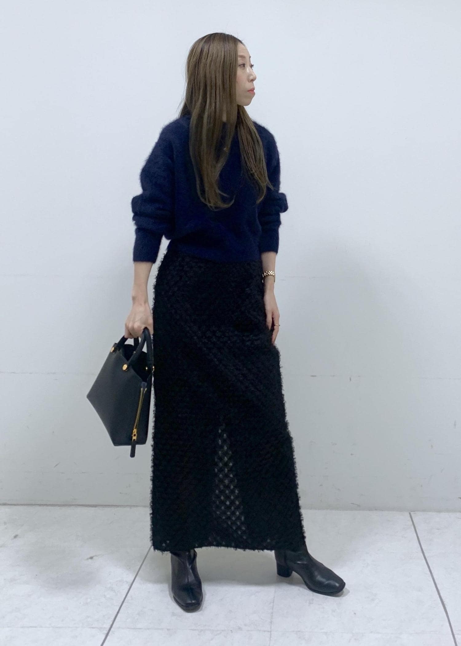 フワフワした毛足の長さと軽い着心地のキャメルのモヘアコートに、軽くて温かいFOXニット、素材が華やかなジャガードスカートを合わせた綺麗めスタイルです。