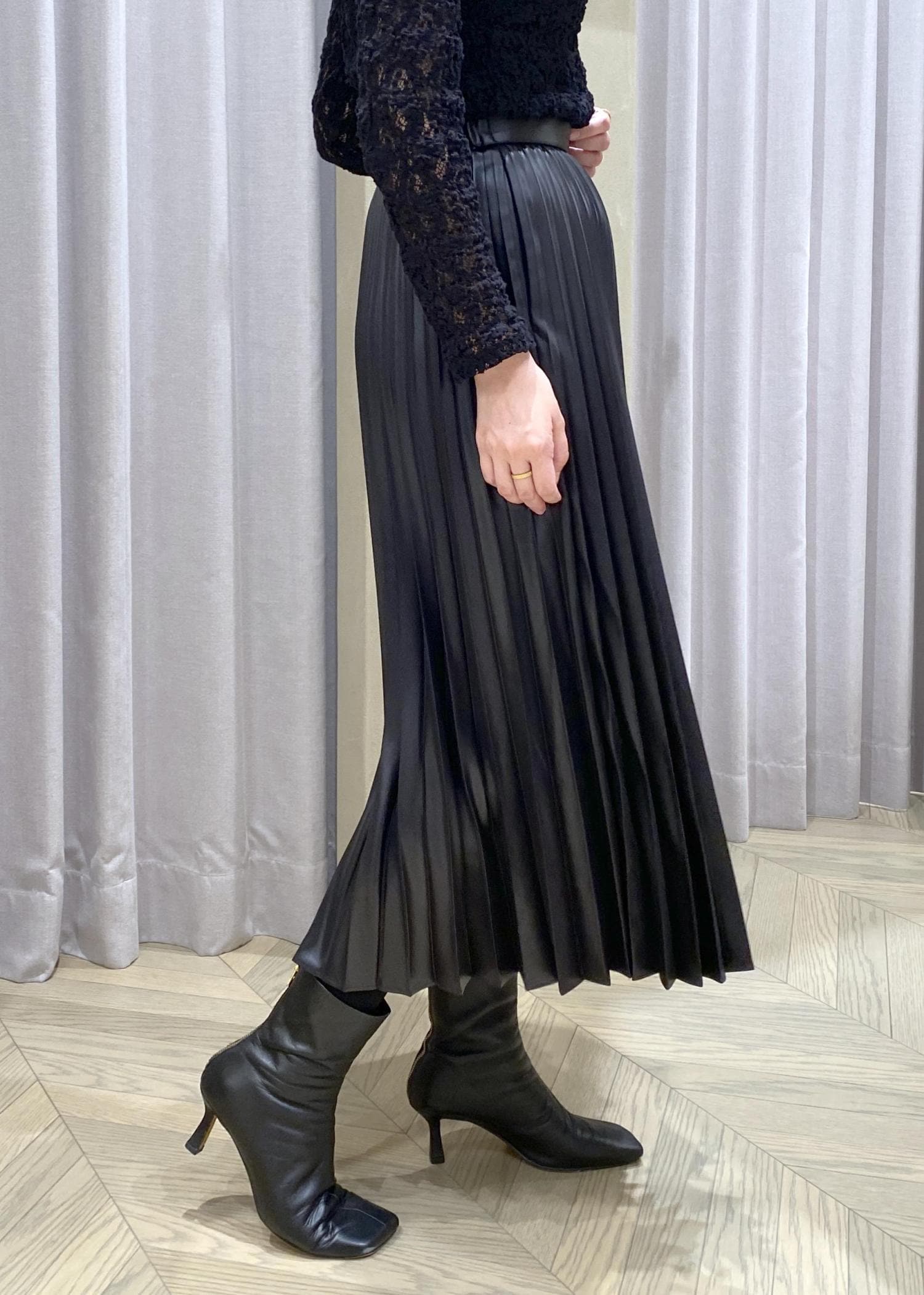 レースインナーで抜け感を出しつつ、レザー見えのプリーツスカートで上品なツヤをプラス。