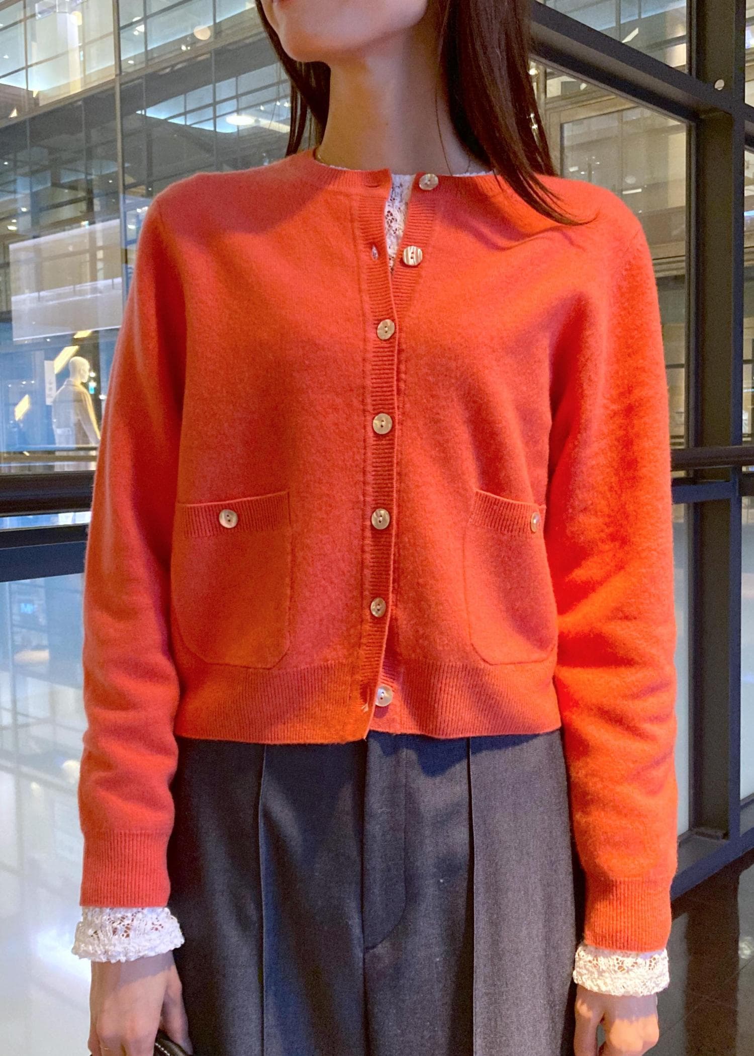 フロントの天然の真珠ボタンとポケットデザインがポイントになるカーディガンです。