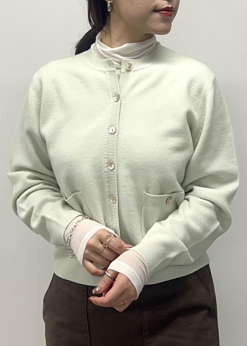 柔らかいカシミヤ素材で透け感があるため、インナー必須。