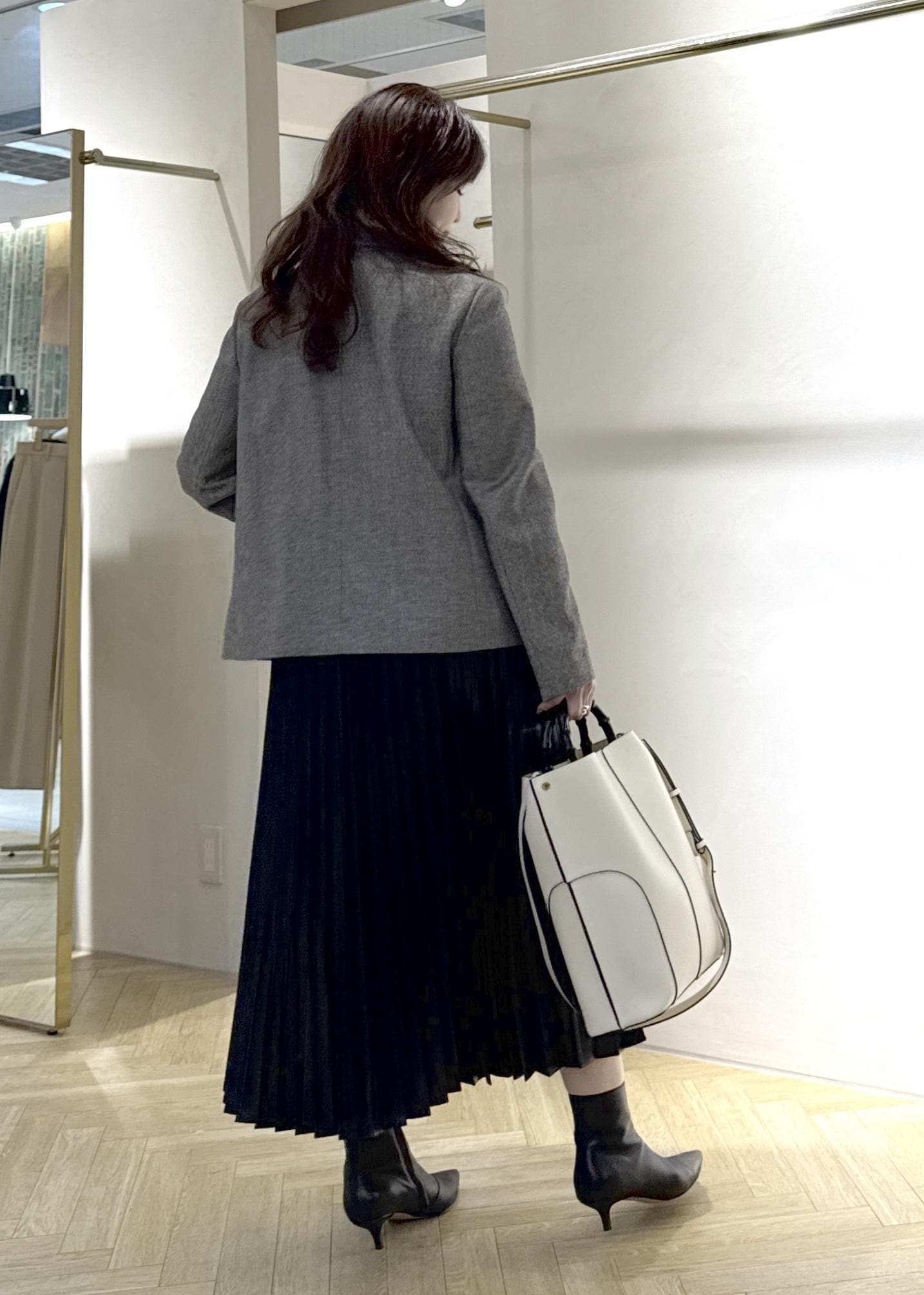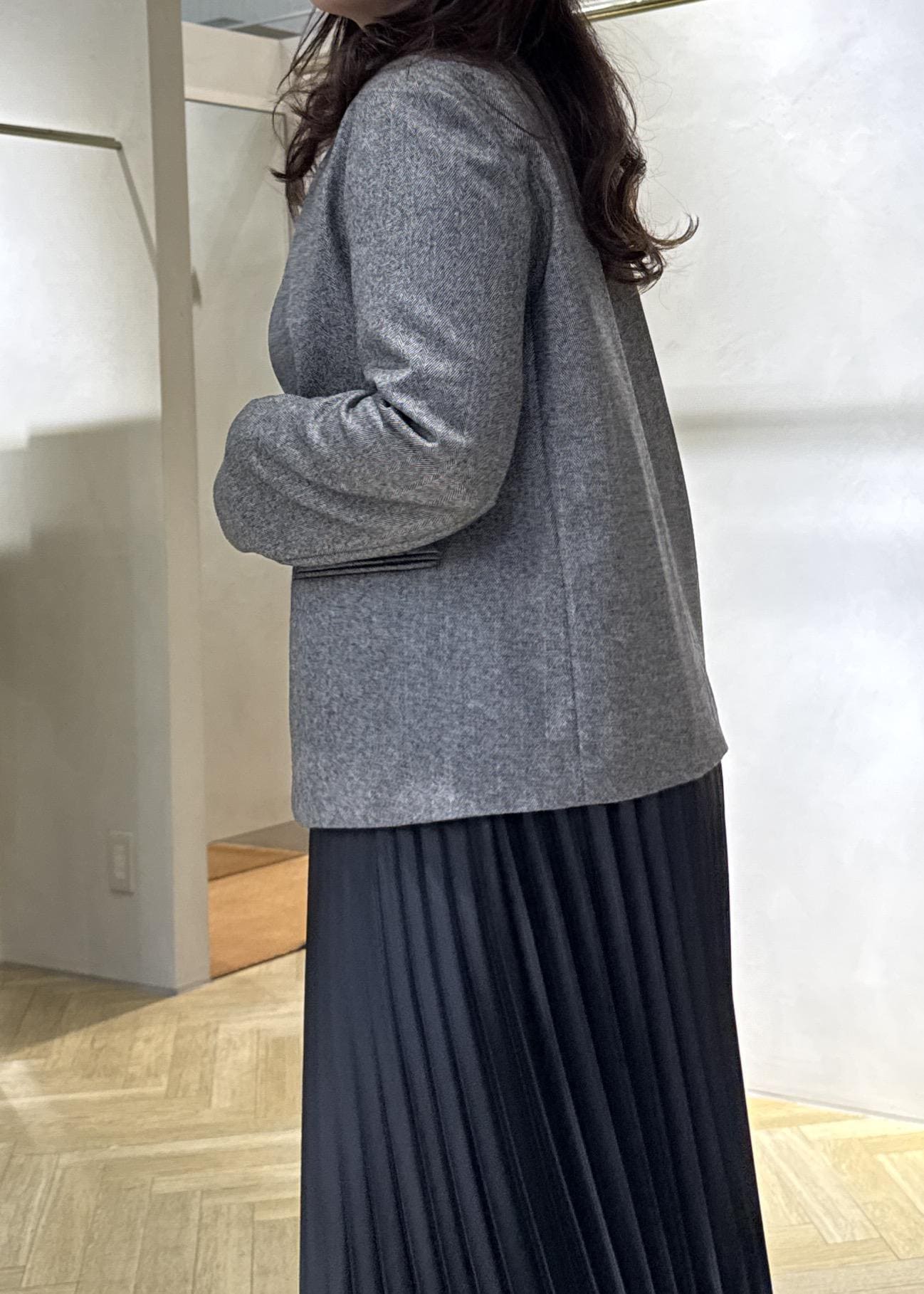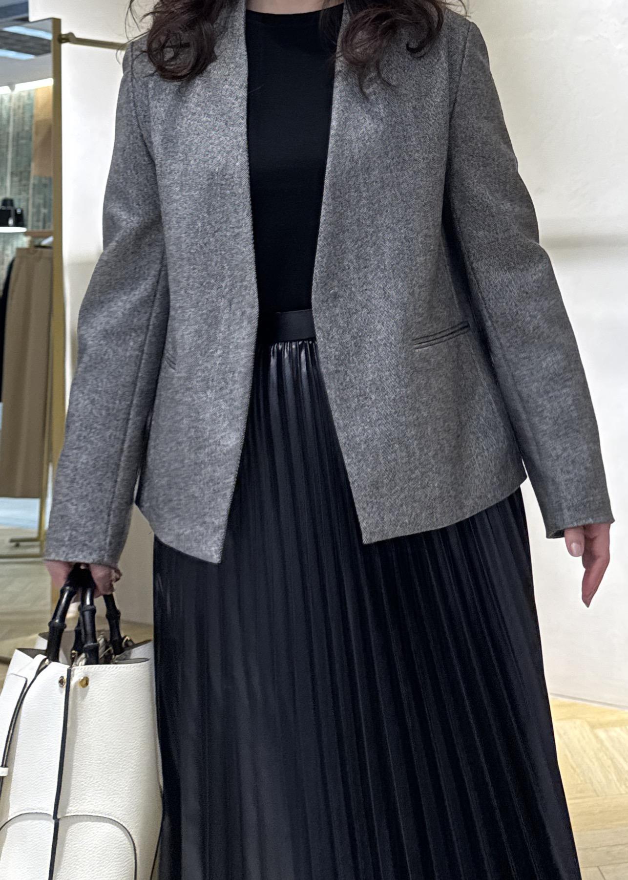 スッキリノーカラーのジャケットはフェミニンさのあるプリーツスカートを合わせてもカッコ良さがプラスされ大人のキレイめスタイルに◯