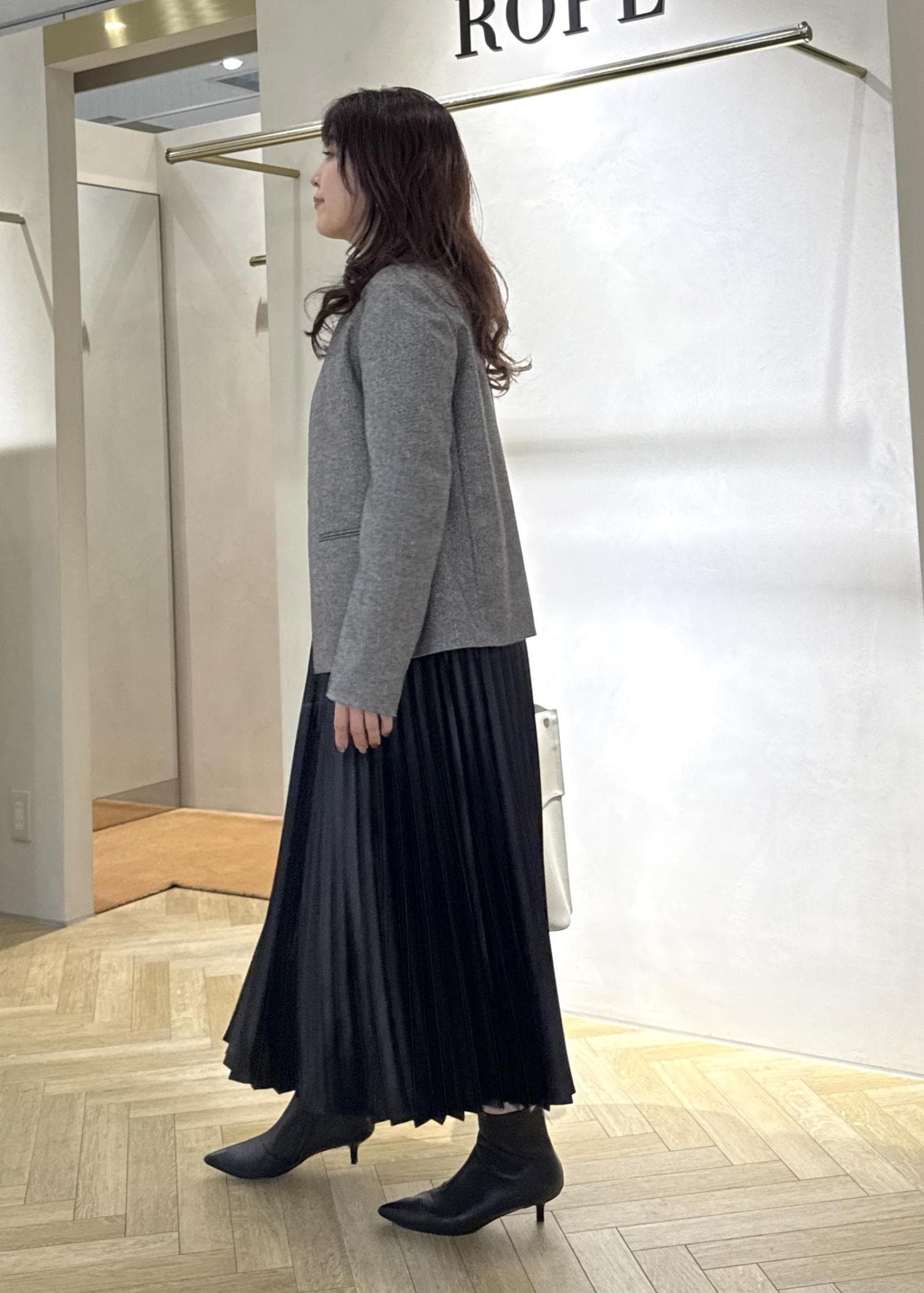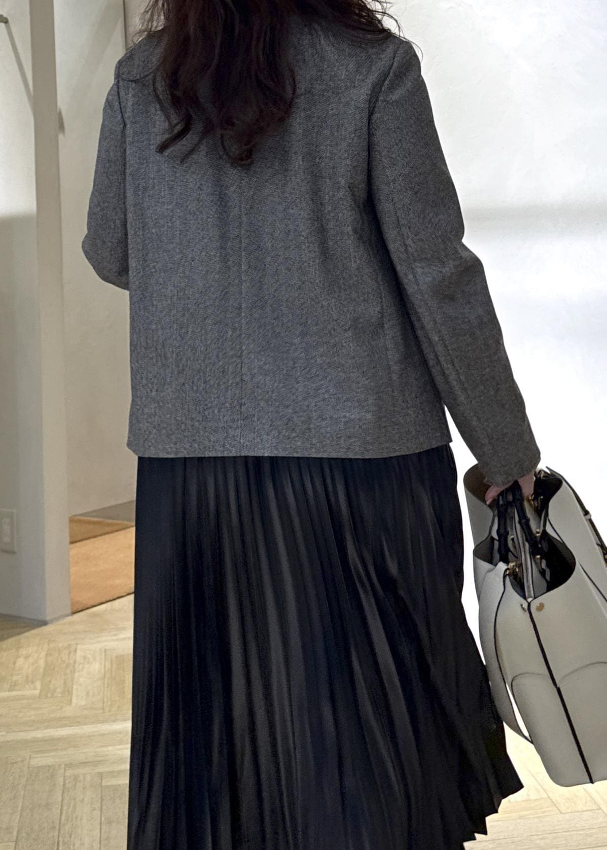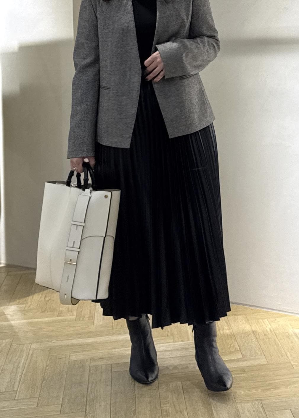 スッキリノーカラーのジャケットはフェミニンさのあるプリーツスカートを合わせてもカッコ良さがプラスされ大人のキレイめスタイルに◯