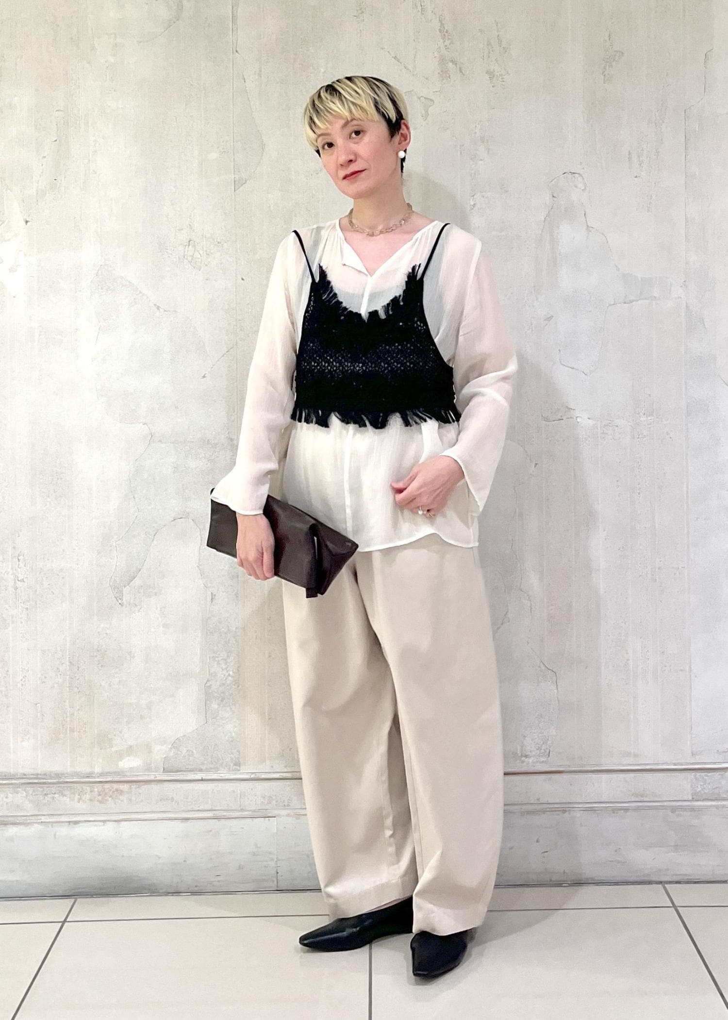 軽く透け感がありますので、キャミソールや薄手のタートルネックなど、インナーの形でも印象が変わります。