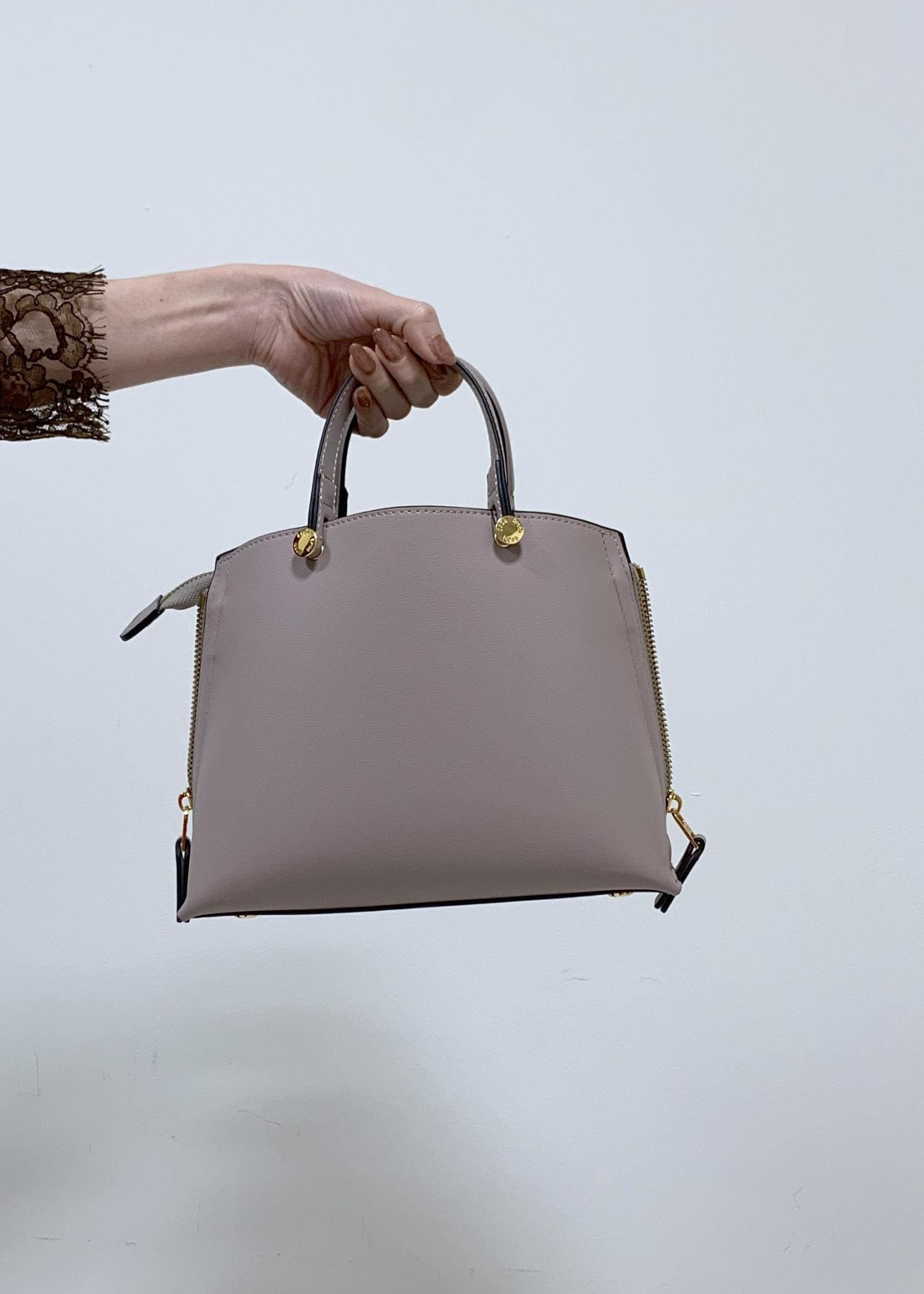 マットな質感のフェイクレザーで高見えしますし、ショルダー付きで斜め掛けも出来ます。