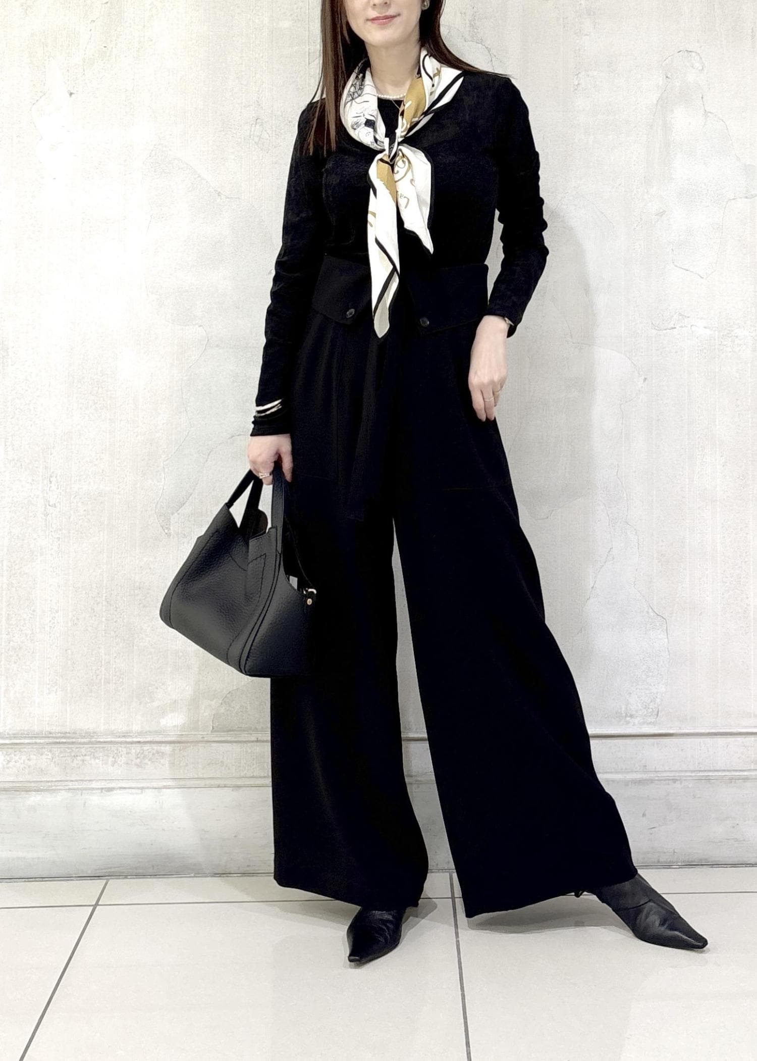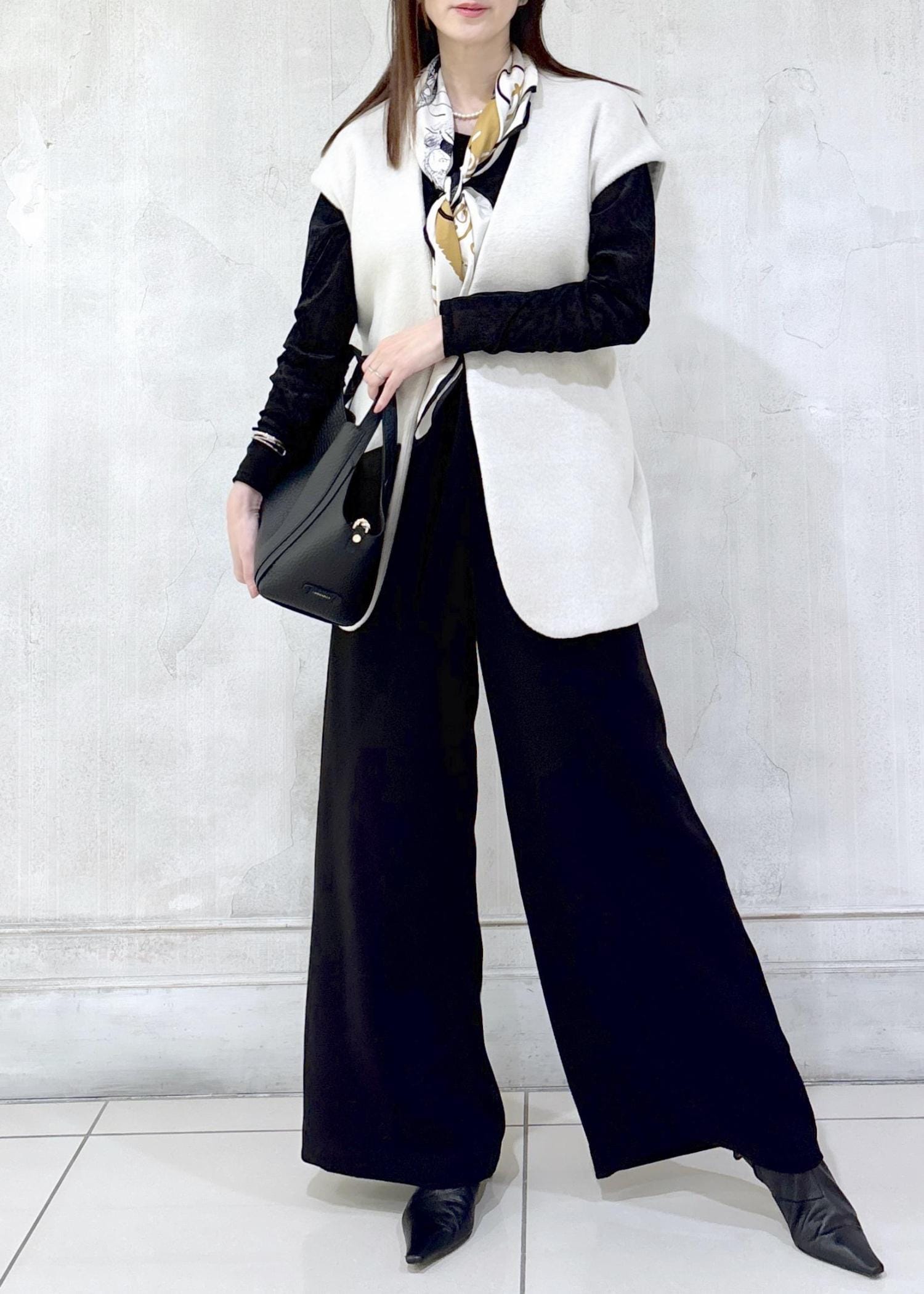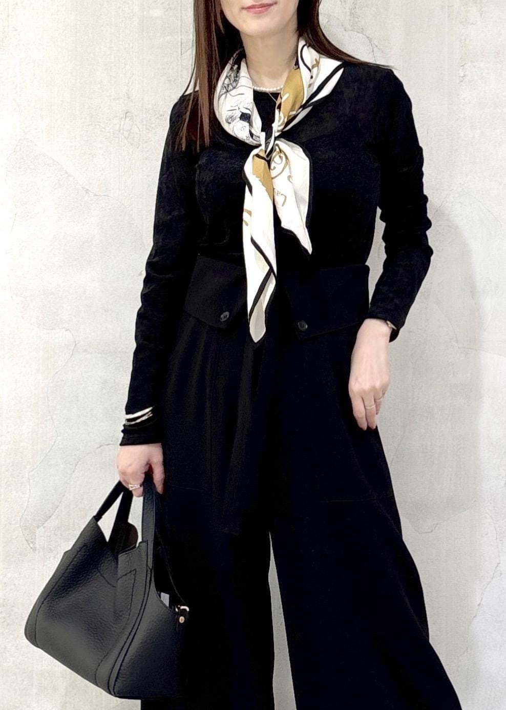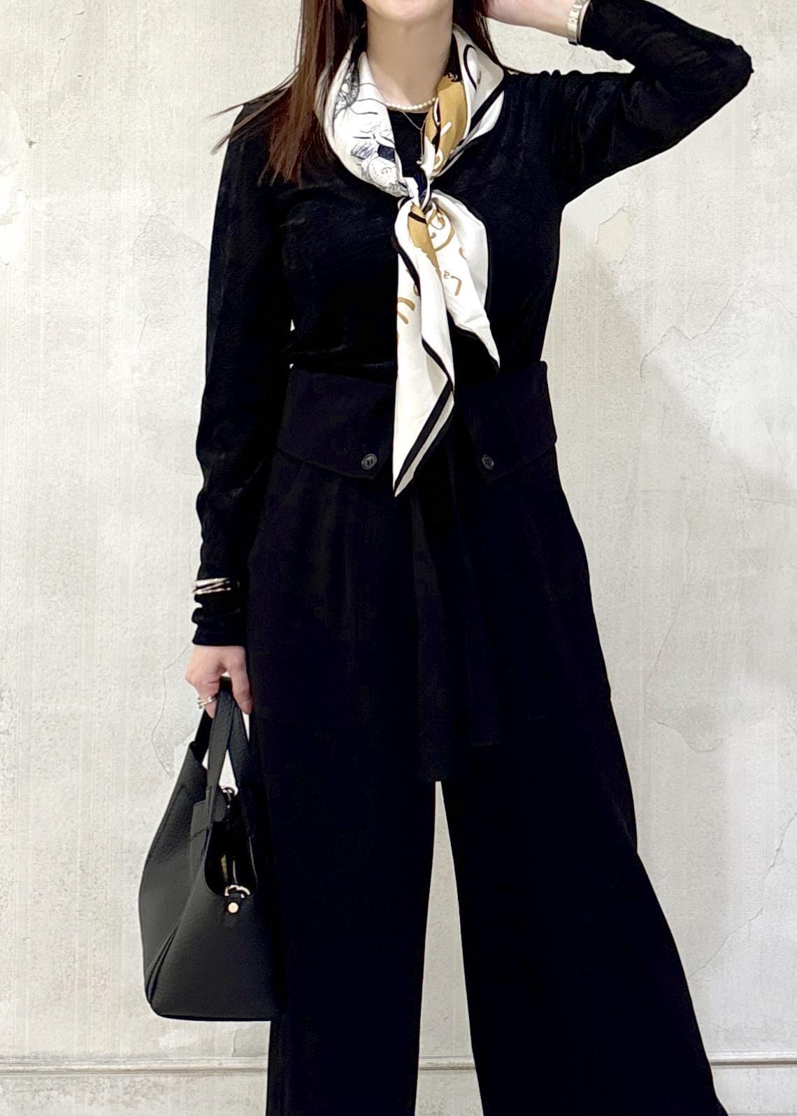 シンプルですがオシャレ見え、お持ちのスカーフやストールをアクセントにstylingするのも◎