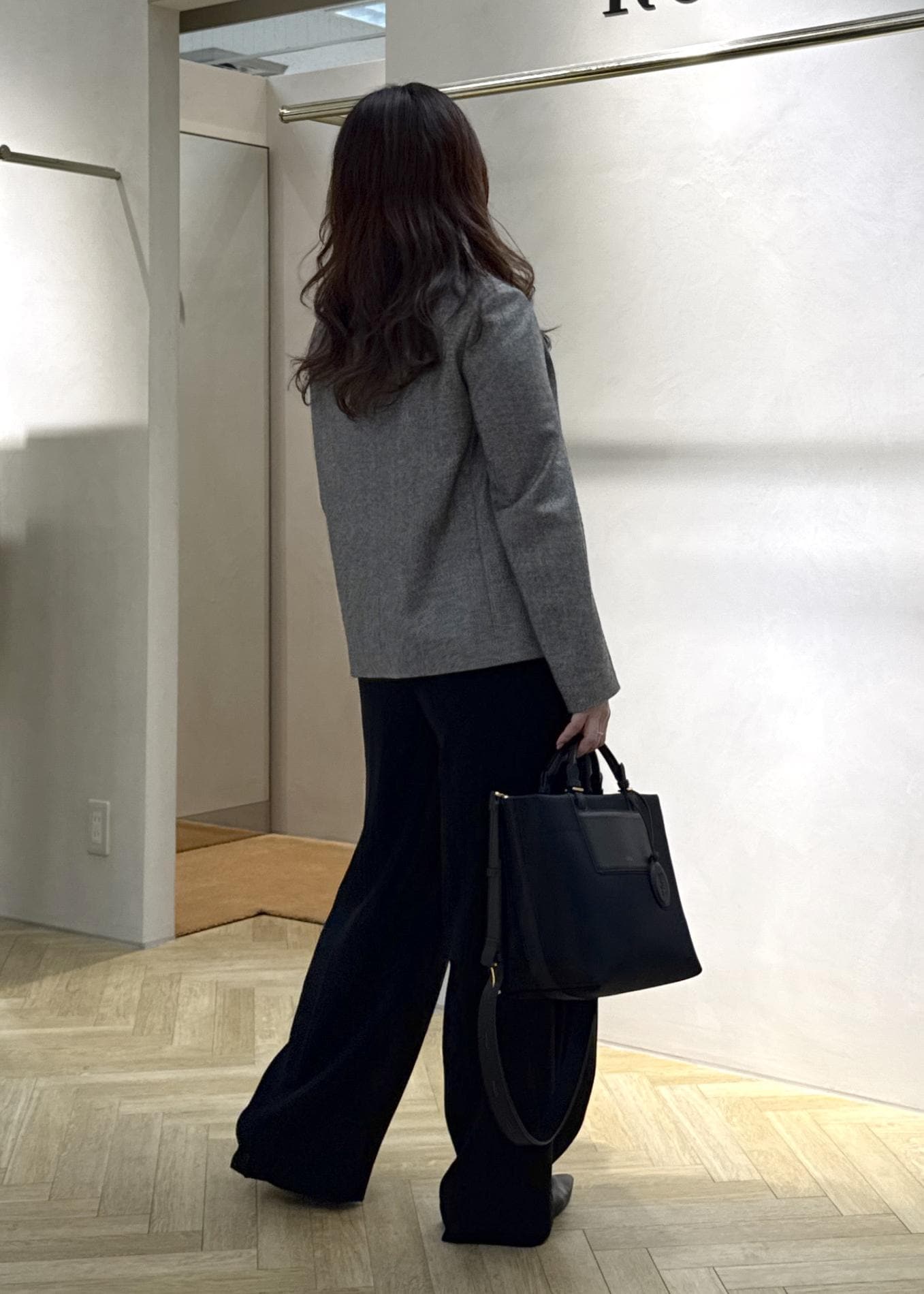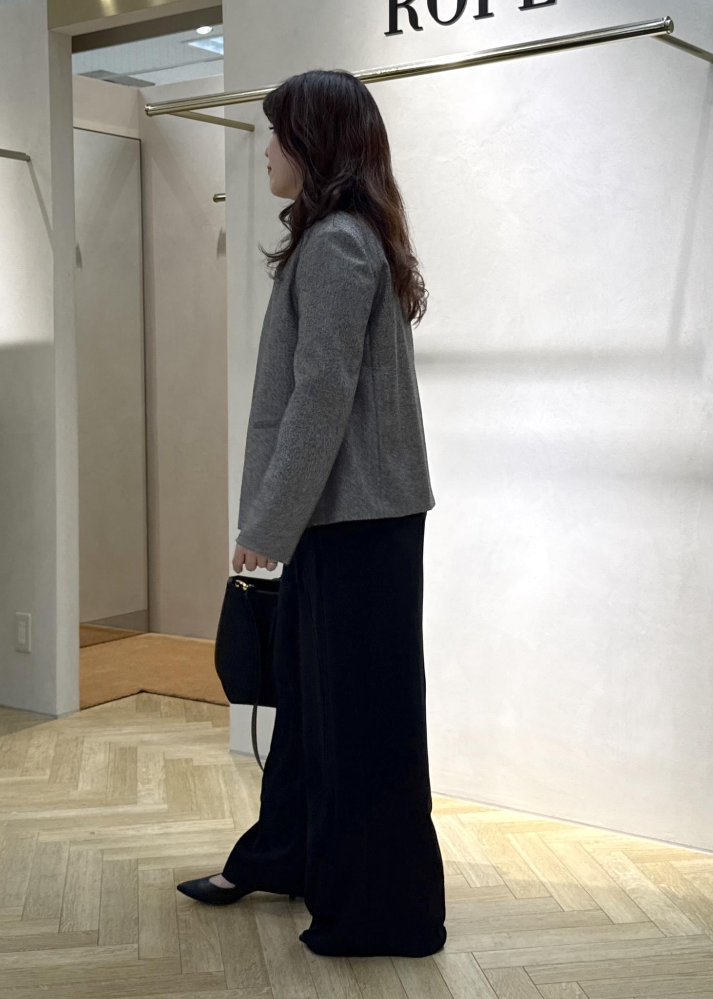 ノーカラーでスッキリ見え、着丈はヒップが隠れて安心感あり◯でも長すぎないのでボトムのシルエットを選ばずバランスよく着れそうです。