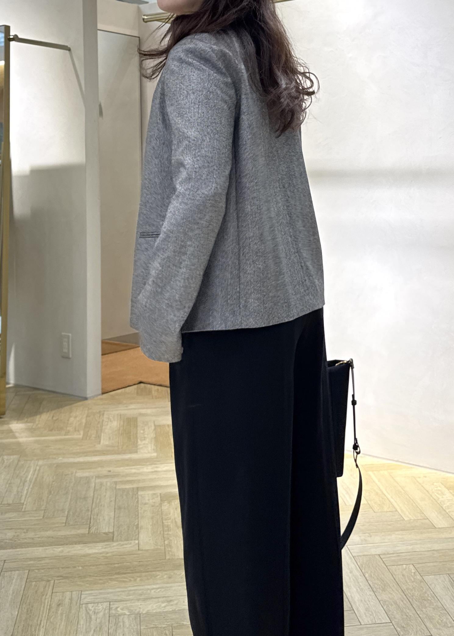 シャープなノーカラージャケットはシンプルなパンツ合わせでよりカッコ良いスタイルに。