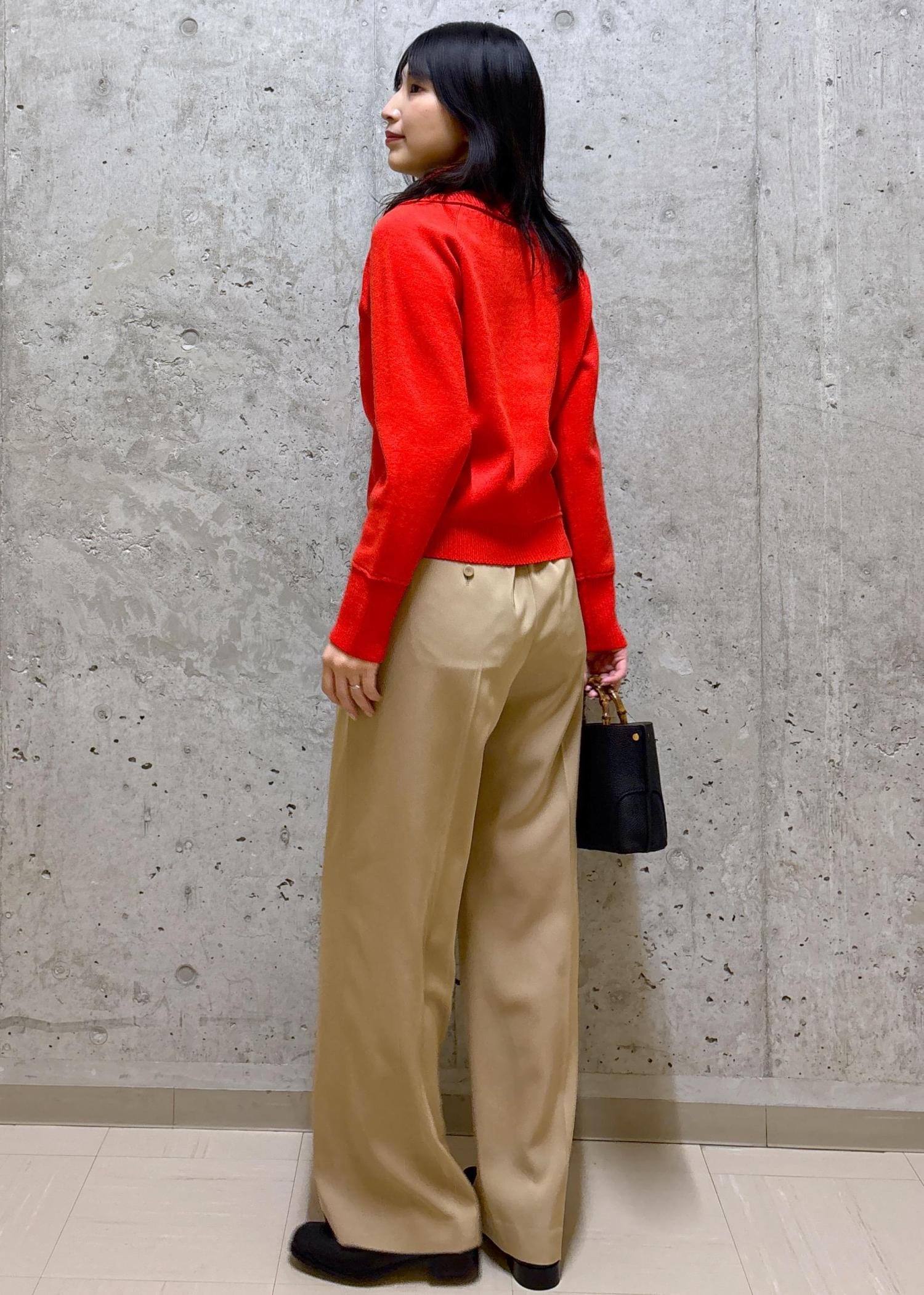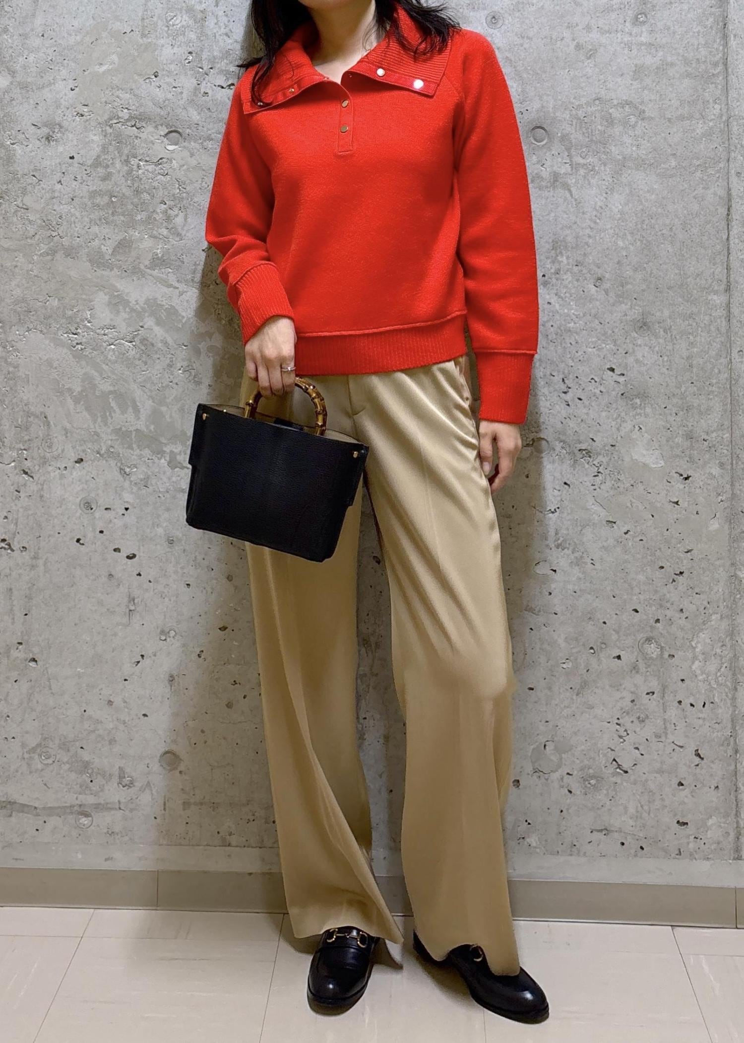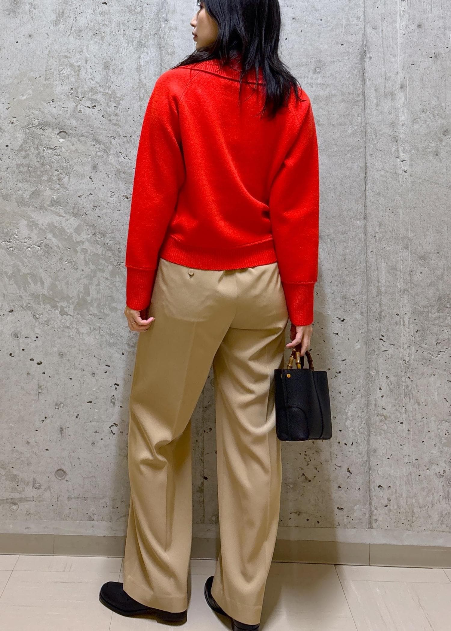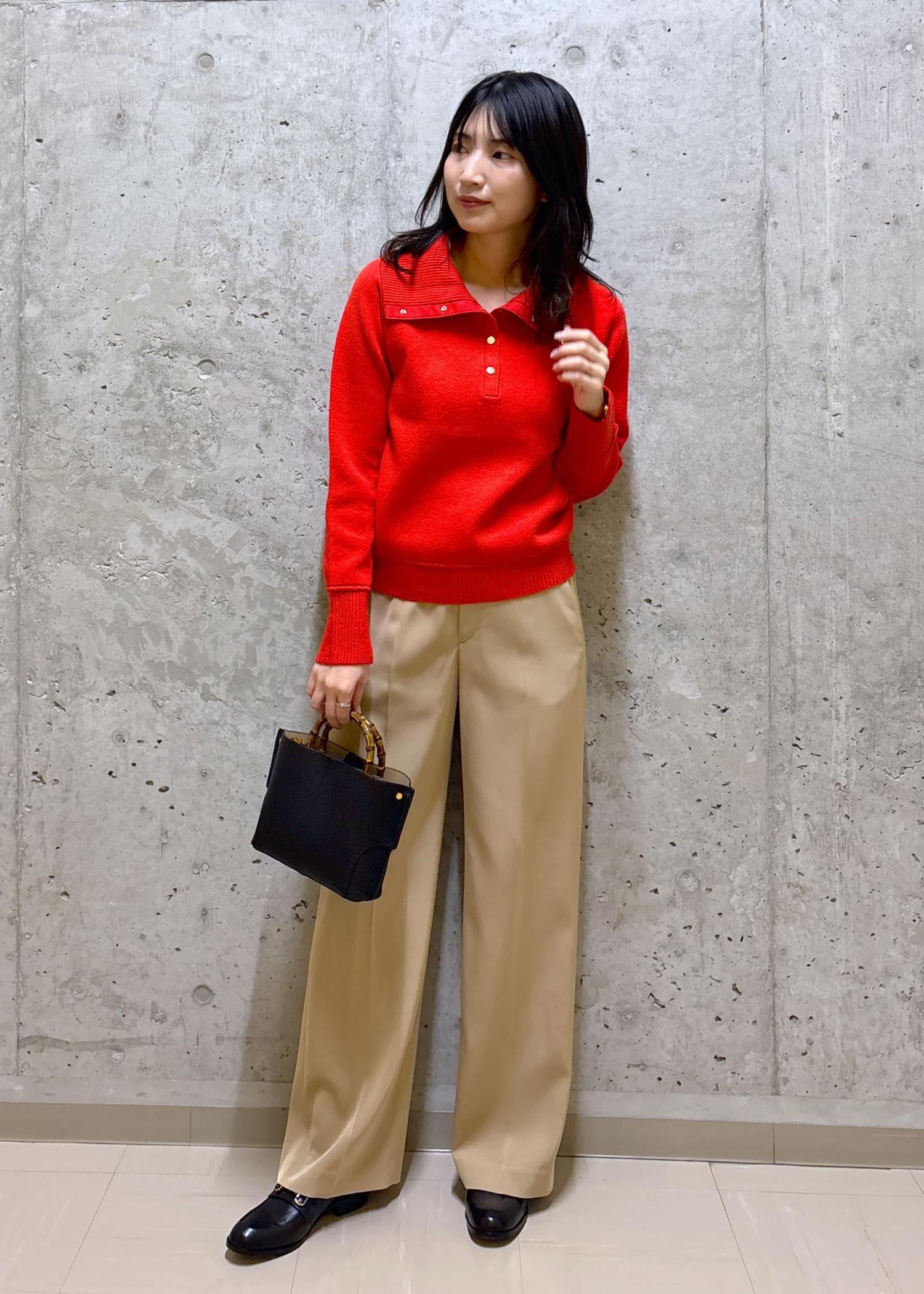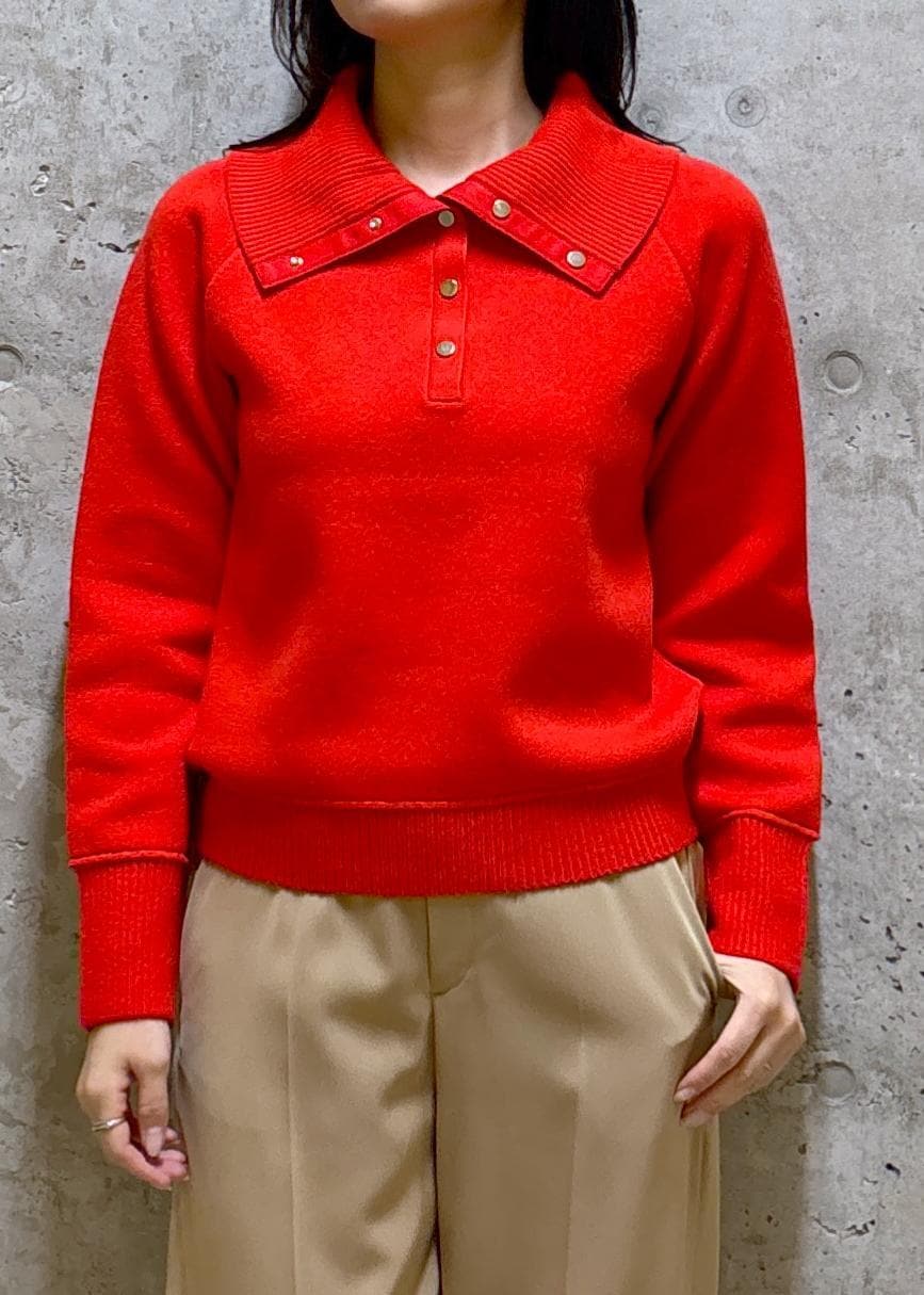 大きめのポロ襟と、鮮やかなレッドが目を引くニットを主役に