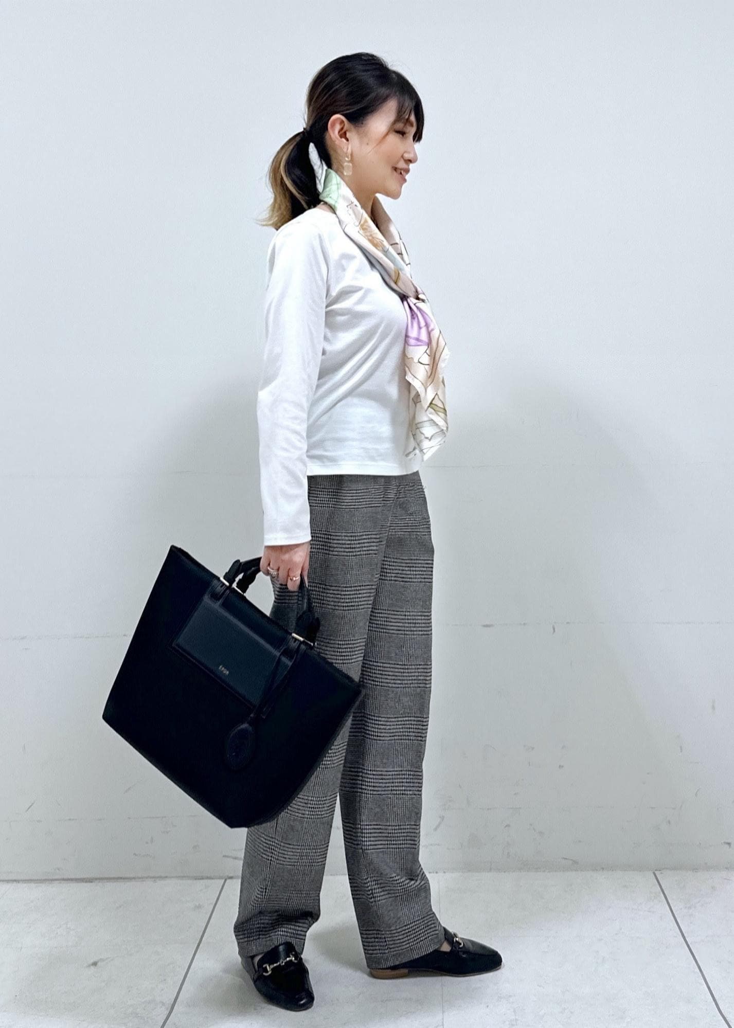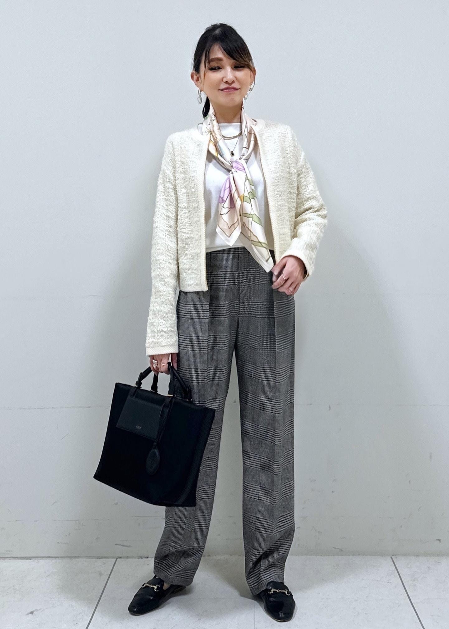 スカーフをアクセントに、モノトーンコーデ