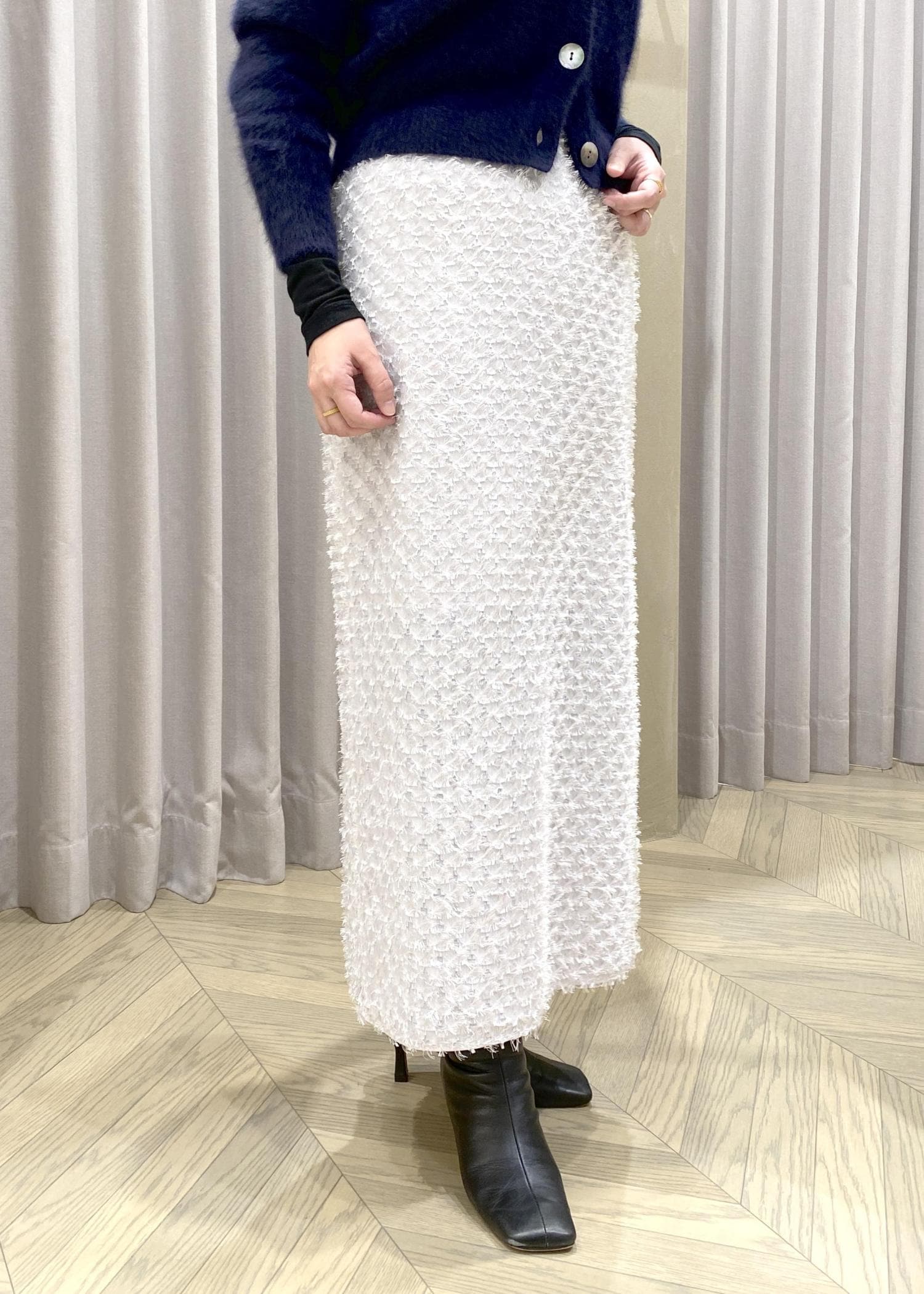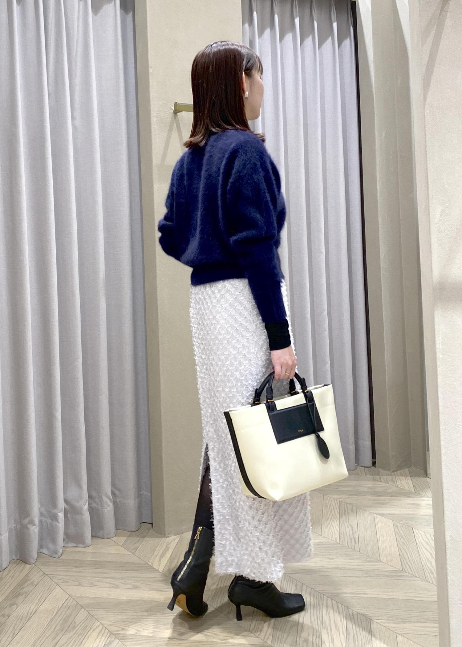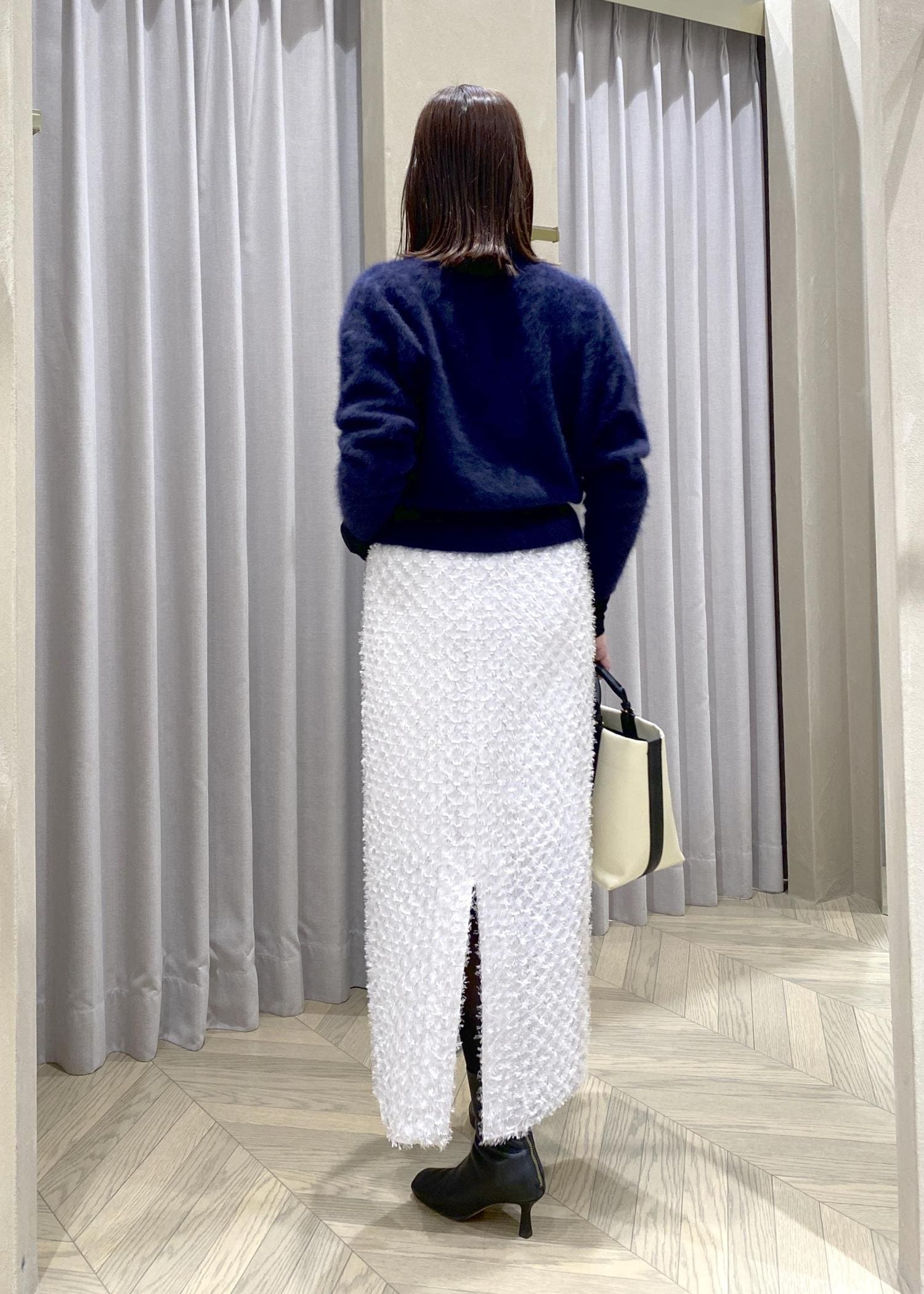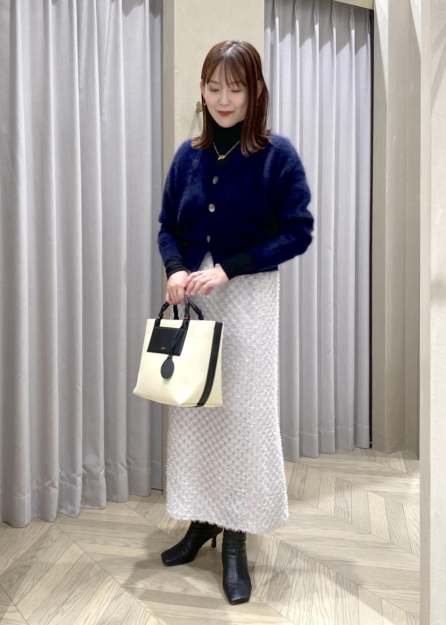 黒のハイネックをインして首元をすっきり見せつつ、シルバーのジャガードタイトで程よく華やかさをプラスしたスタイリングです⭐︎
