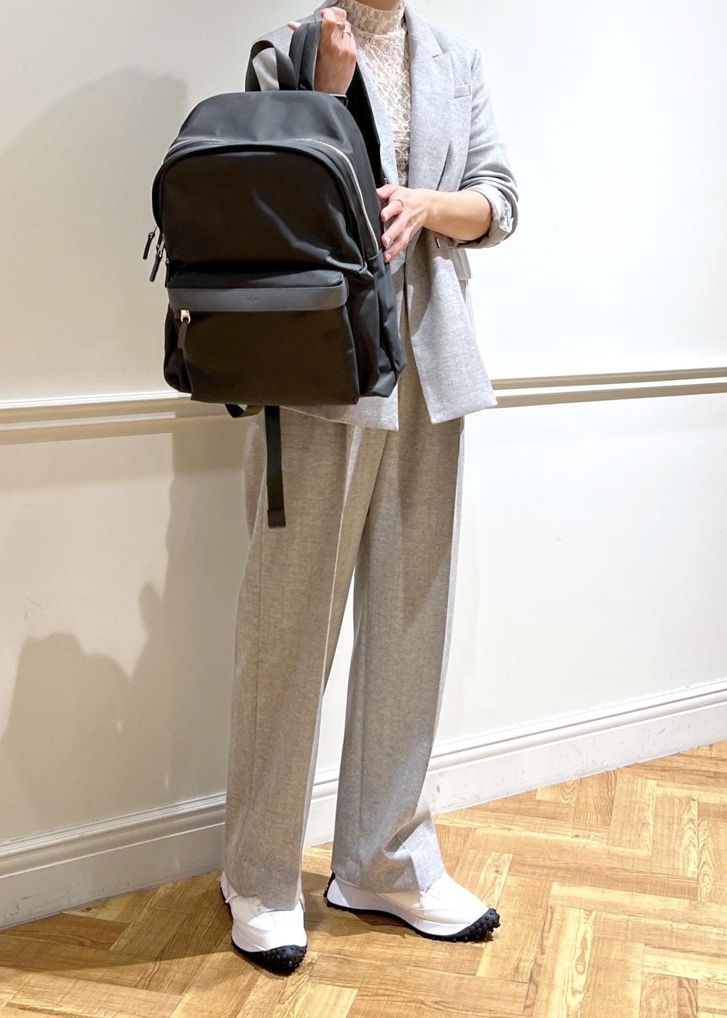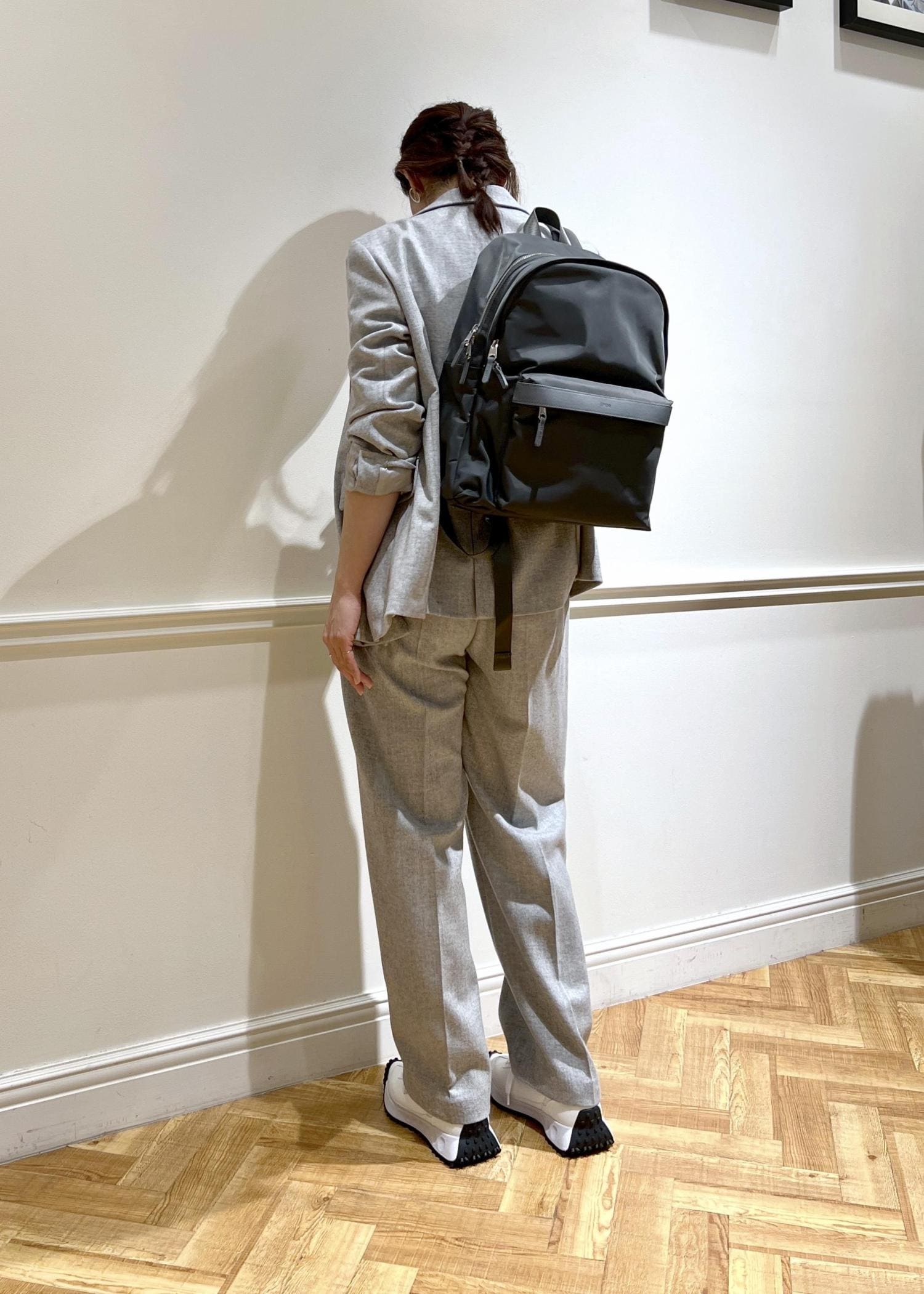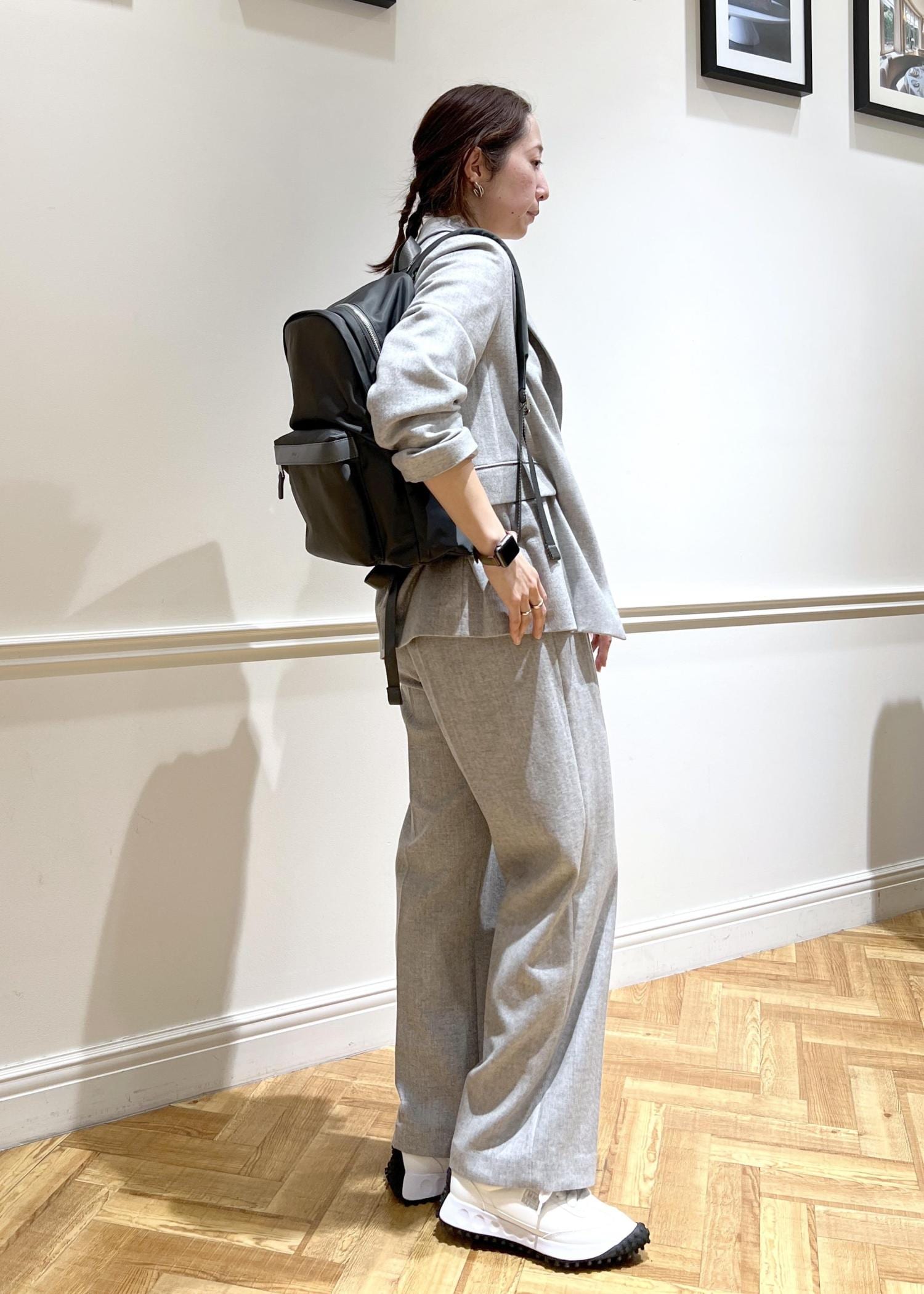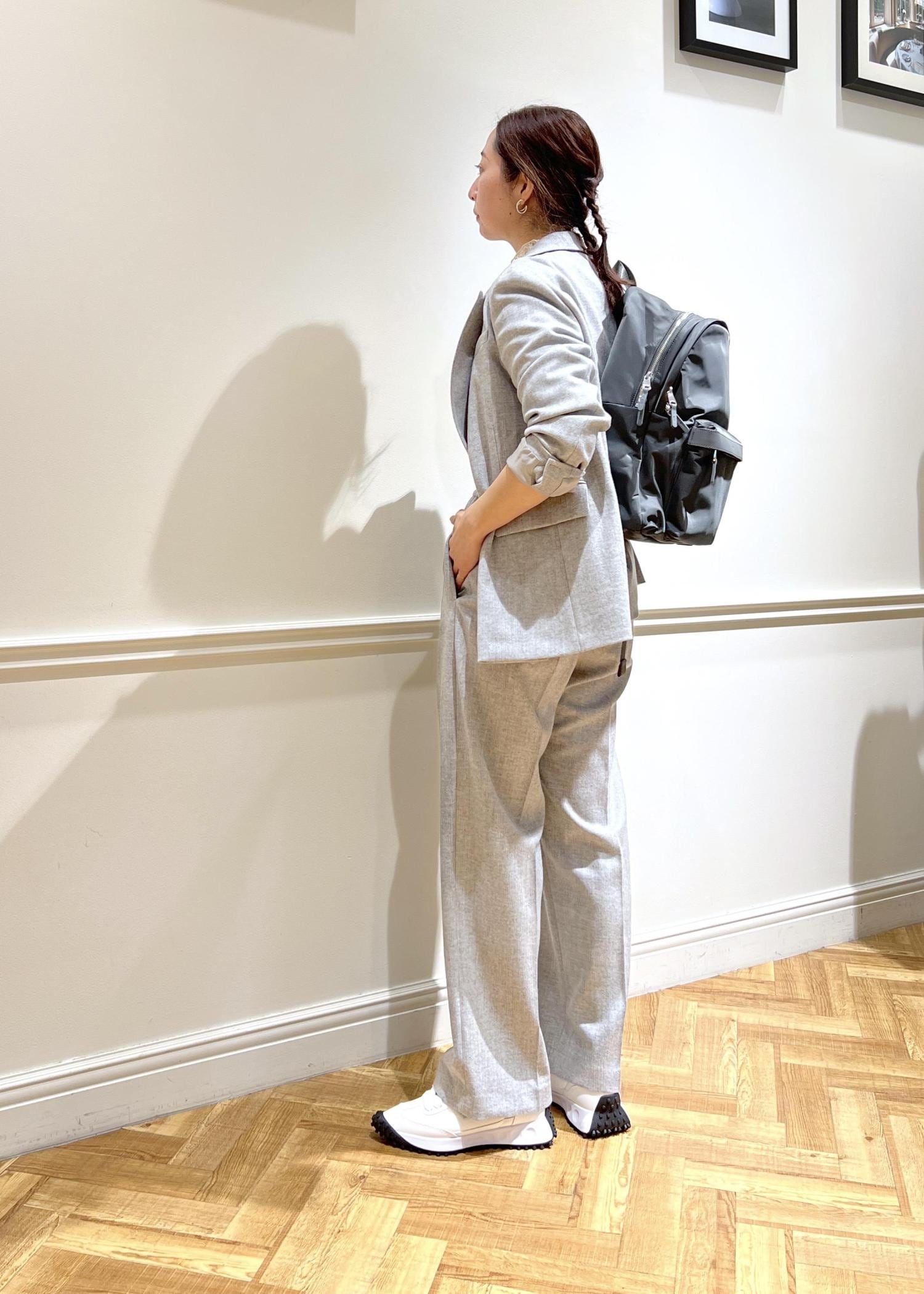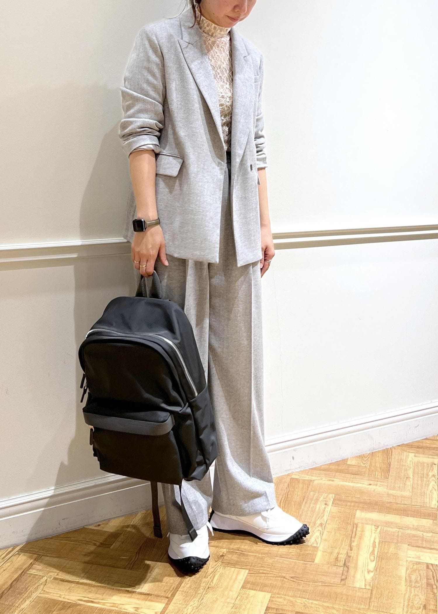 堅くなりがちなセットアップをライトグレーとスニーカー、リュックでラフに仕上げました。
