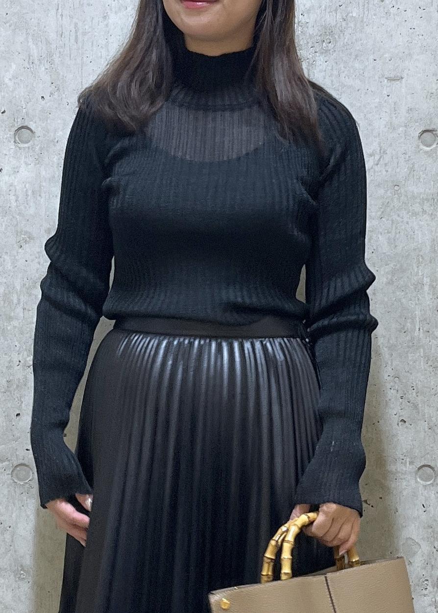 ROPÉラメタートルリブプルオーバー/イージーケアブラック / F¥19,800レビューリブなのでフィット感はありますが、身体のラインを拾いすぎず伸縮性があるので着脱がしやすいです。