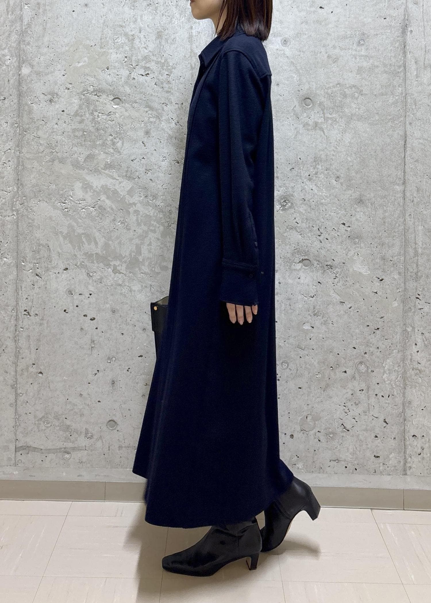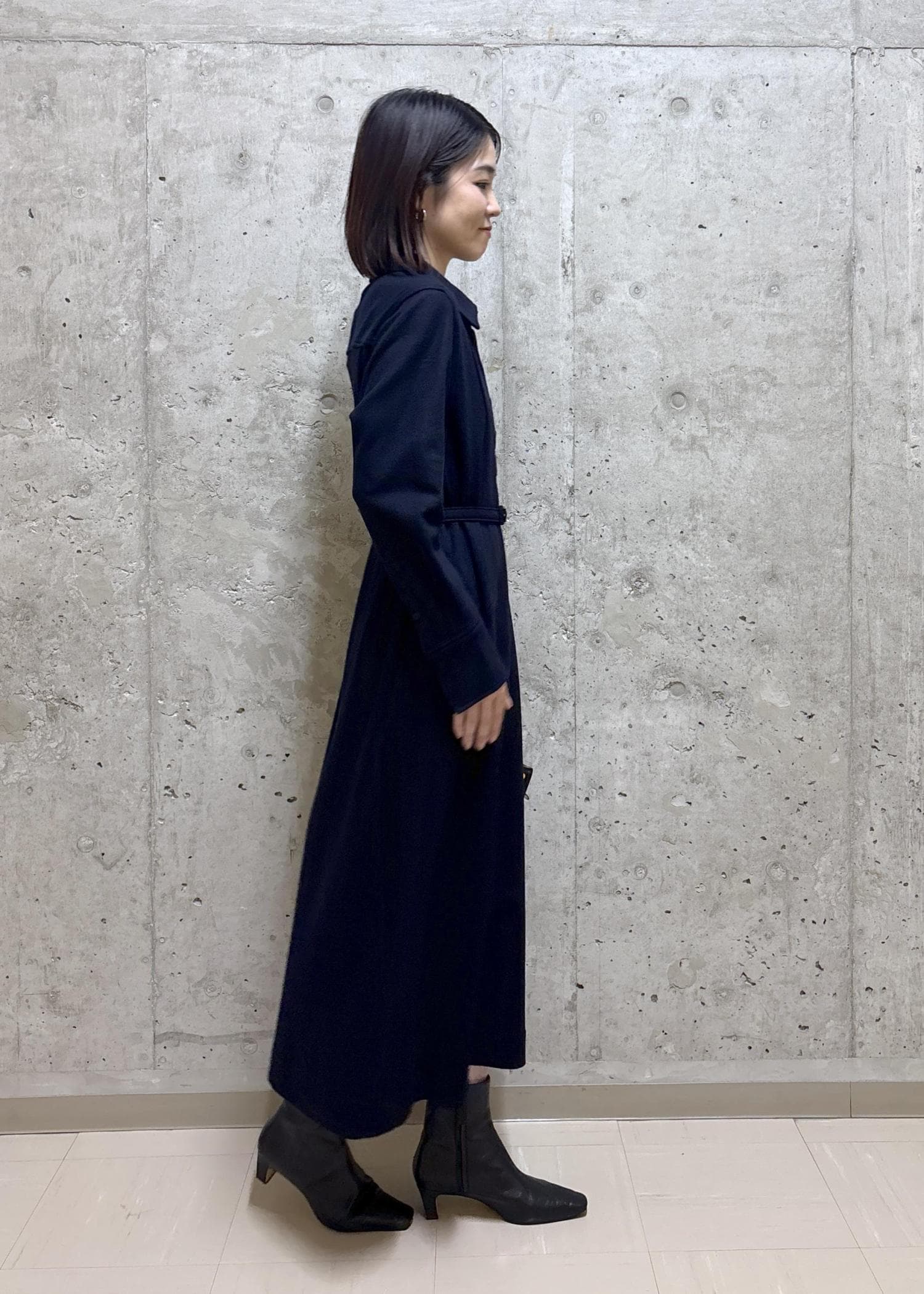 着丈は足首が見えるくらいの長さ。足元はフラットシューズやブーツなど小物で雰囲気を変えて着られます。