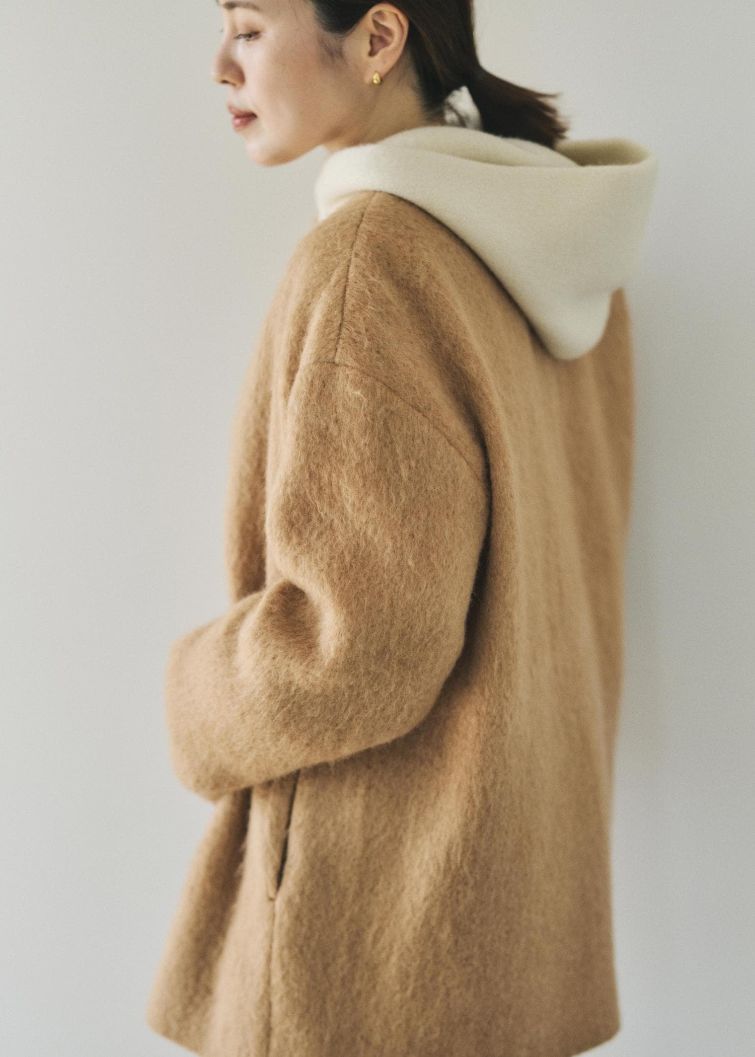 ドロップショルダーで身幅はゆったりとしているので、中肉のニットフーディを着てもすっきり羽織れました。