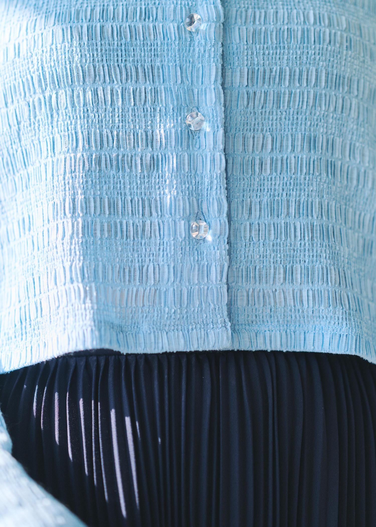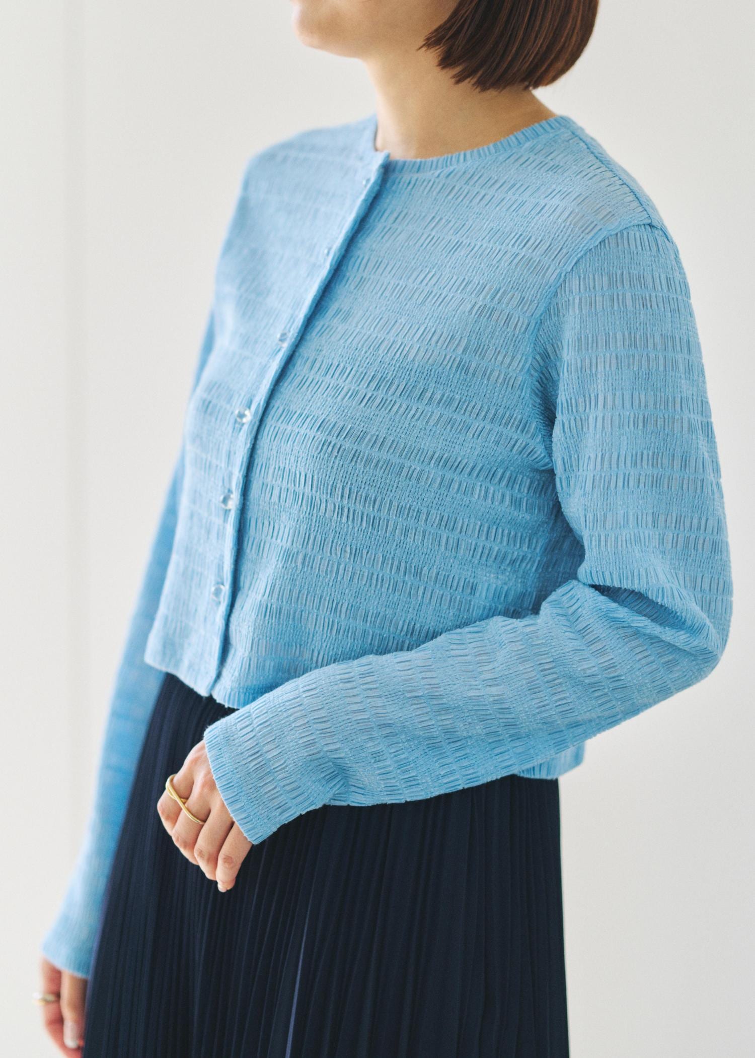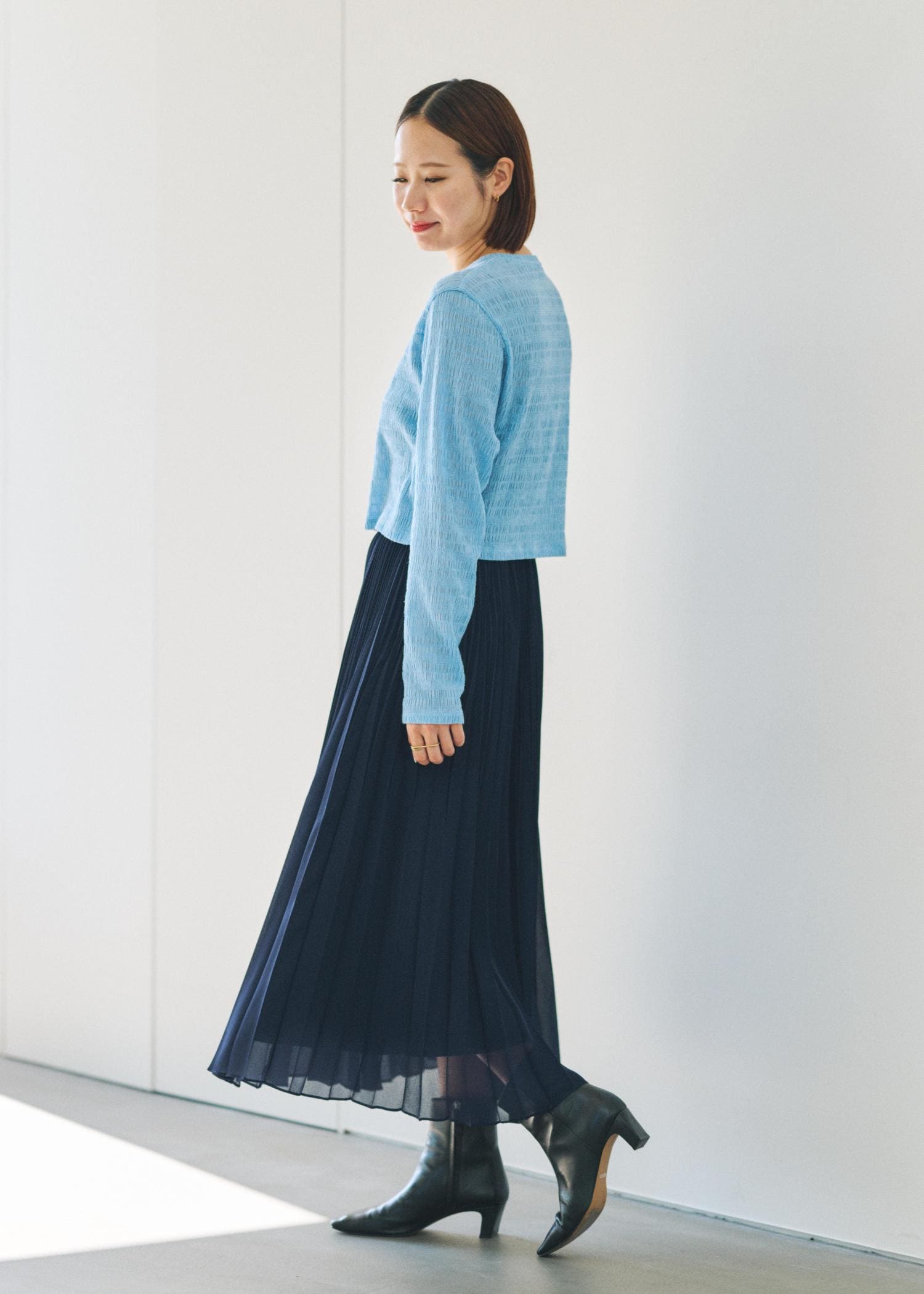 着丈はコンパクトで腰骨にかかるほどです。すっきりと見えるシルエットでハイウエストのボトムやワンピースの羽織としてもおすすめです! -