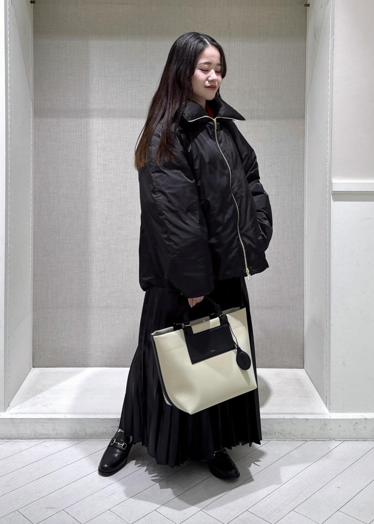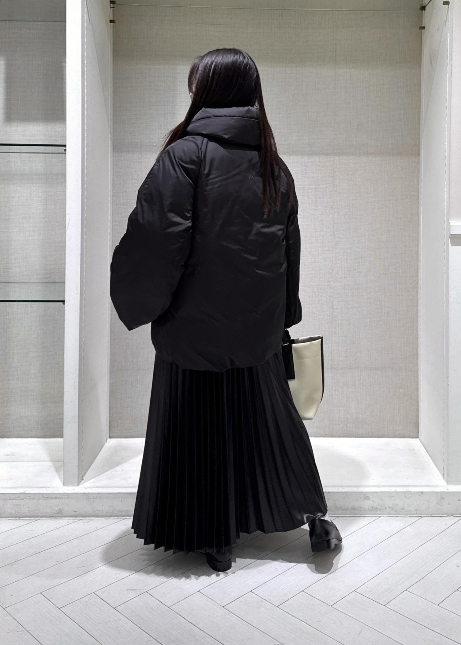 身幅は程よいゆとりがありますが、軽くてとても暖かい着心地です。程よい光沢感でカジュアルすぎずに着ていただけるダウンです。 -