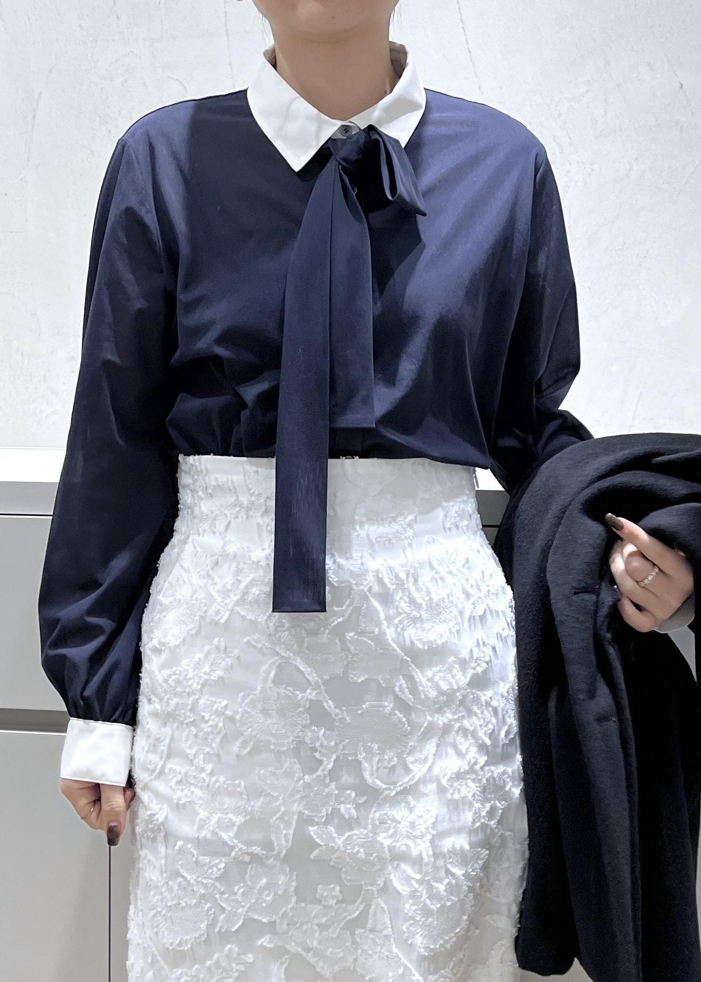 仕事でも使えるボウタイブラウスを組み合わせました。