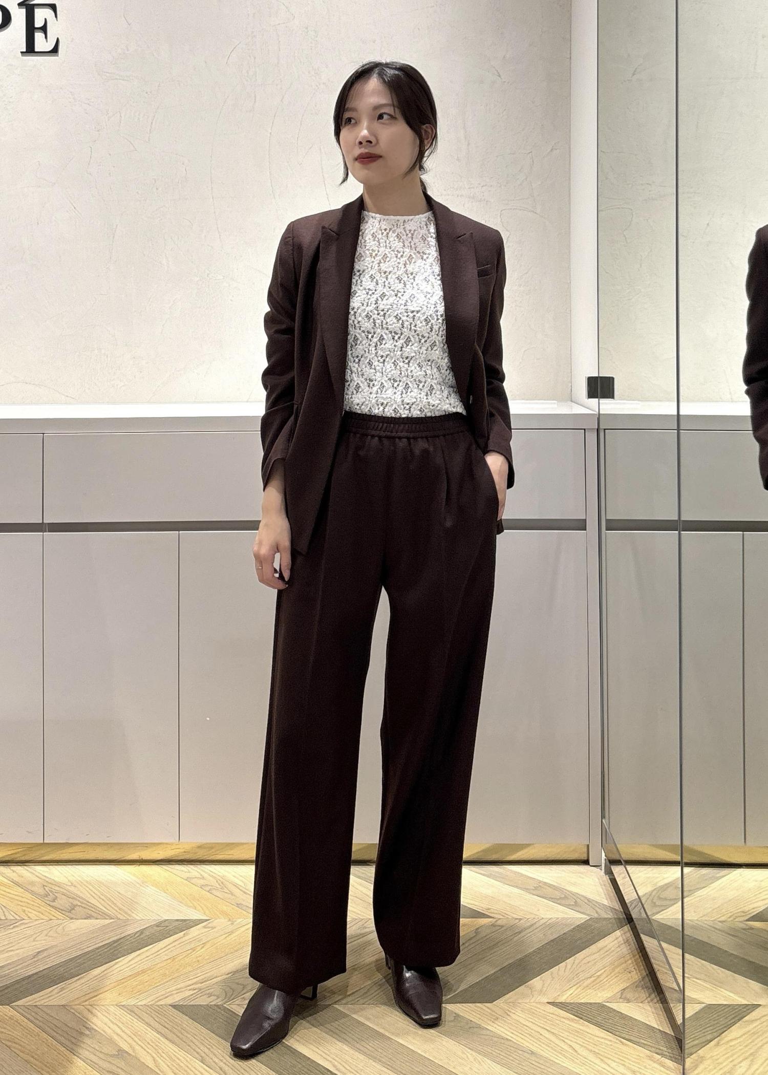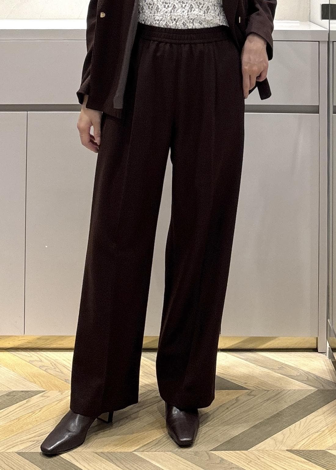 ROPÉウールフランネルタックイージーパンツ/イージーケア・セットアップ対応ダークブラウン / 38¥25,300レビュー柔らかくふっくら感のあるフラノ素材で軽く暖かい着心地です。ウエストは総ゴムで内側にドロストの紐があり調節できる仕様。裾にかけてまっすぐ落ちるシルエットです。全体のサイズ感はややゆったり、着丈は長めでヒールに2cmほどかかるあたり。
